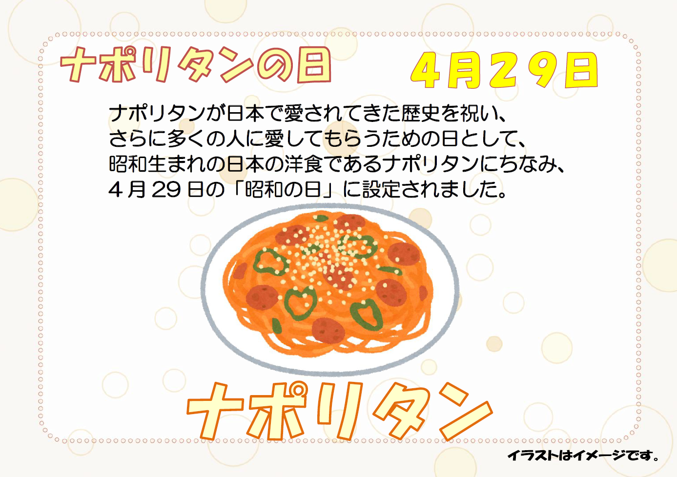 本日4/29はナポリタンの日ということで、お昼ご飯にナポリタンを提供させていただきます!