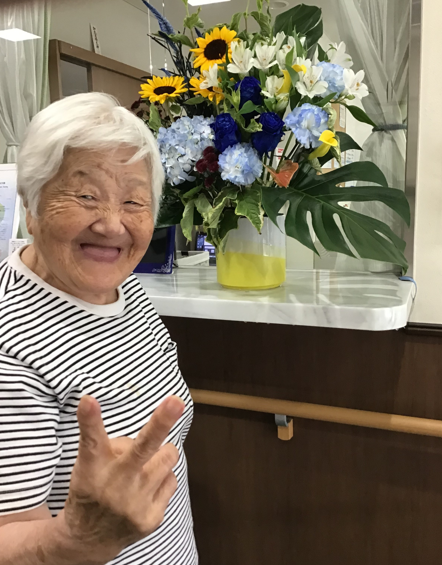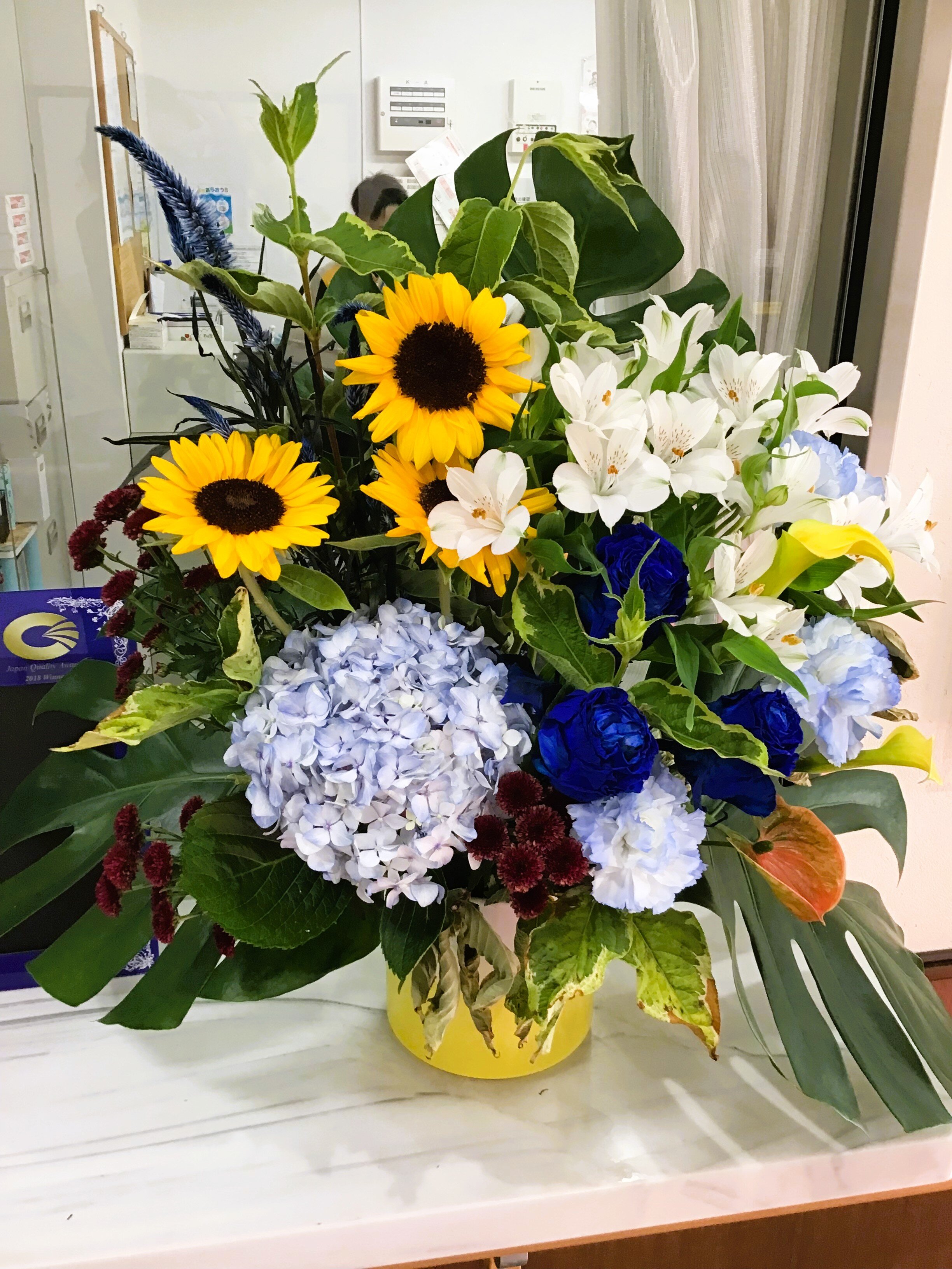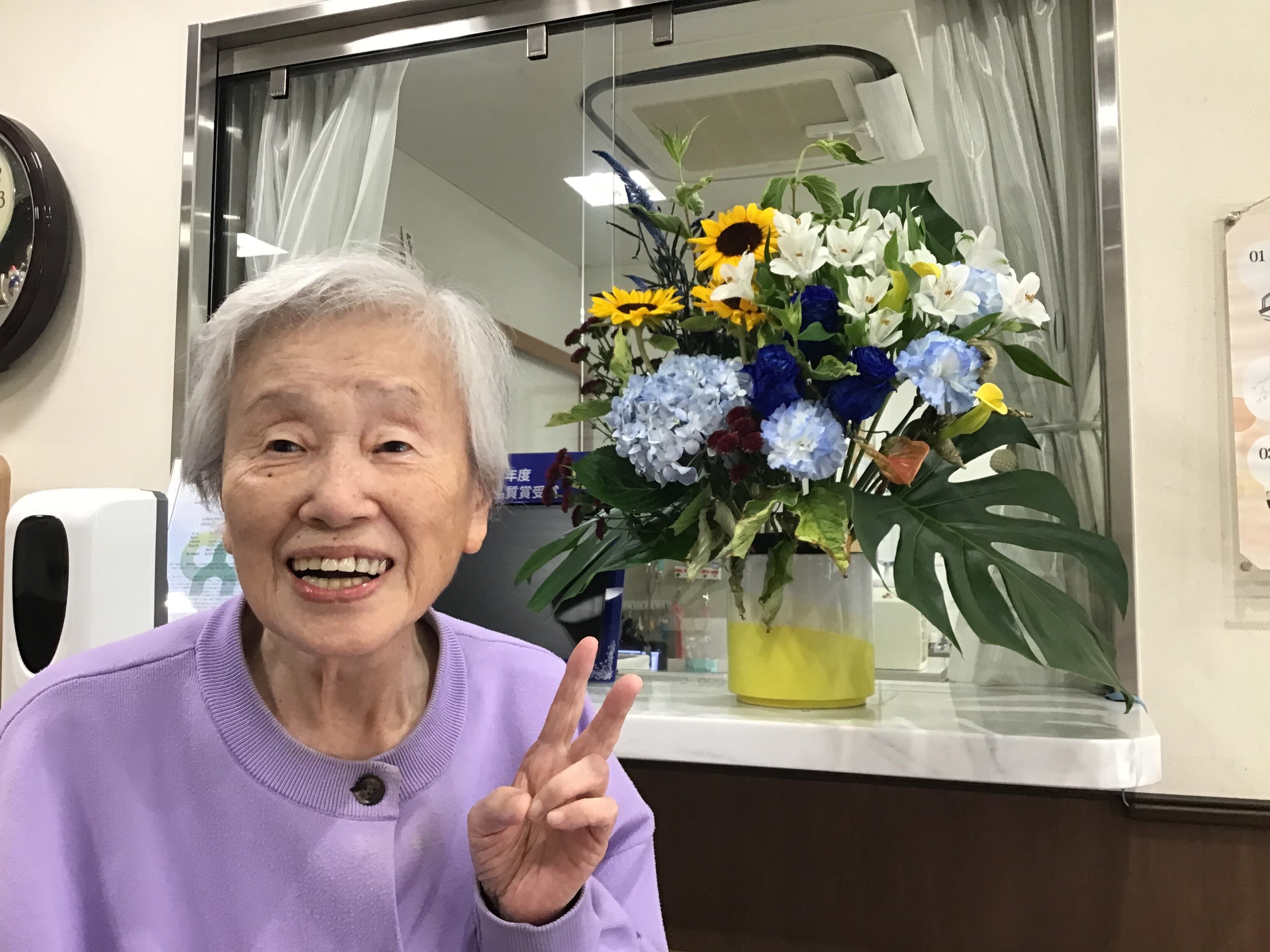スーパー・コート松原では毎月お花屋さんに来ていただき、玄関前にお花を生けてもらっています(*'▽')