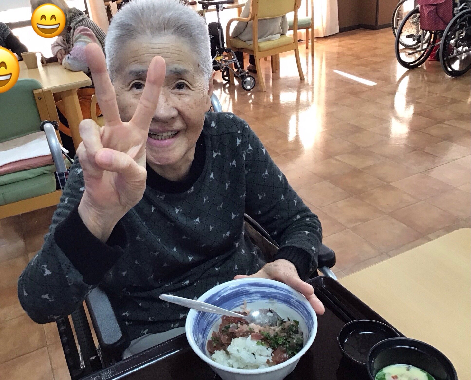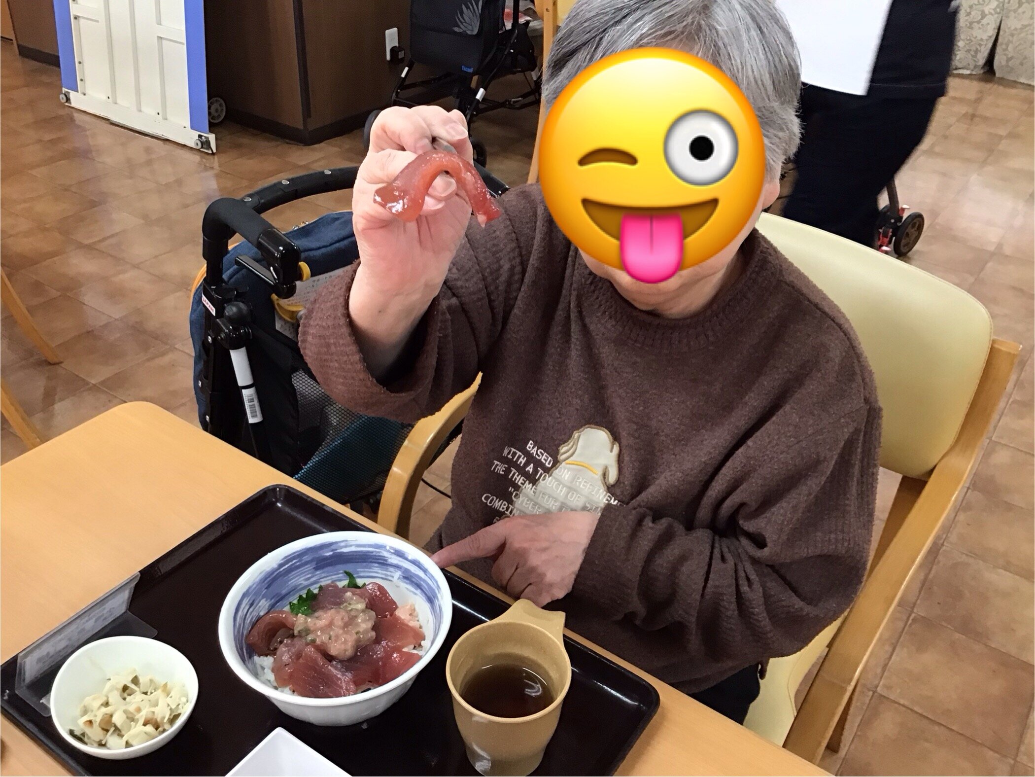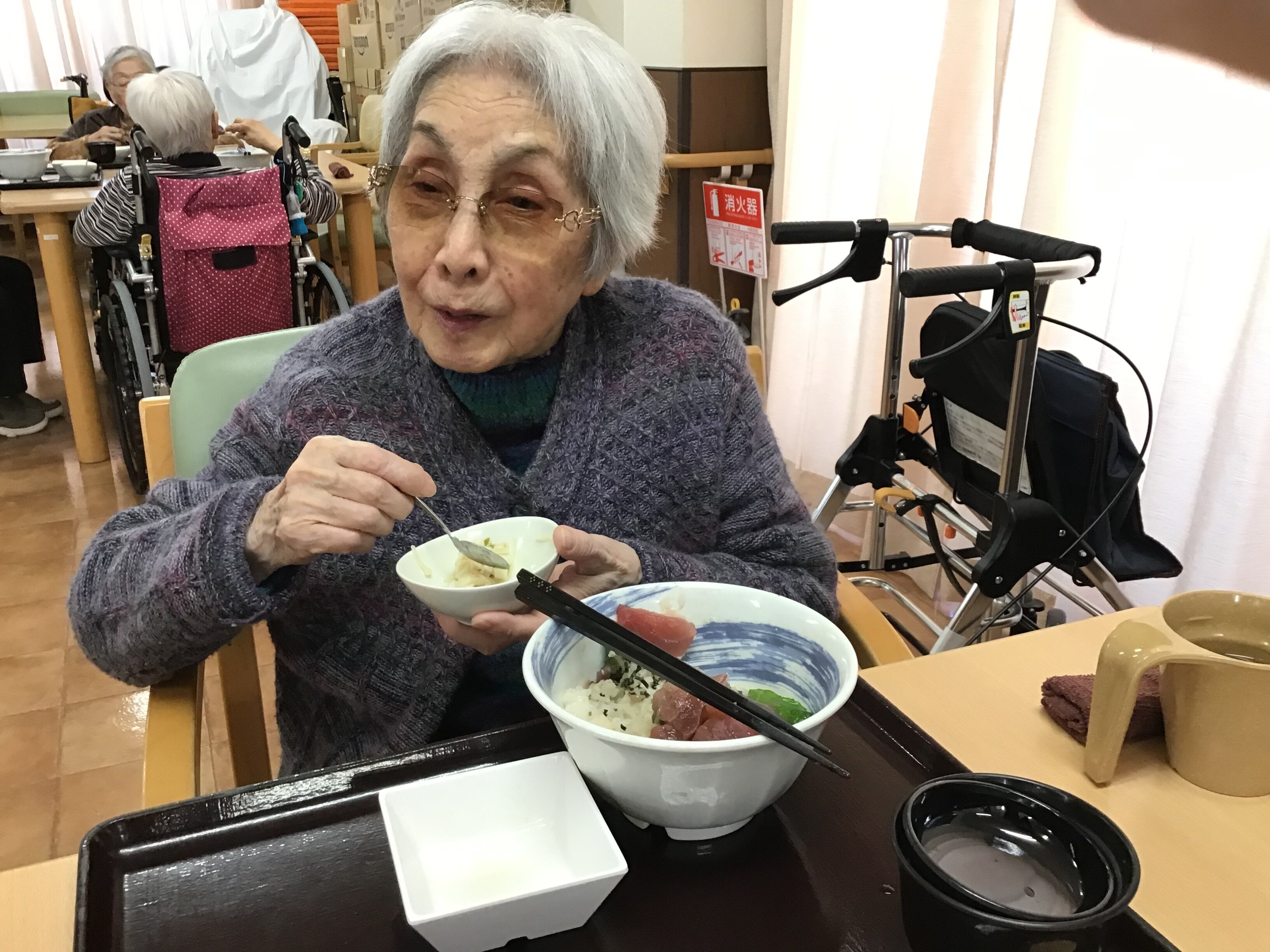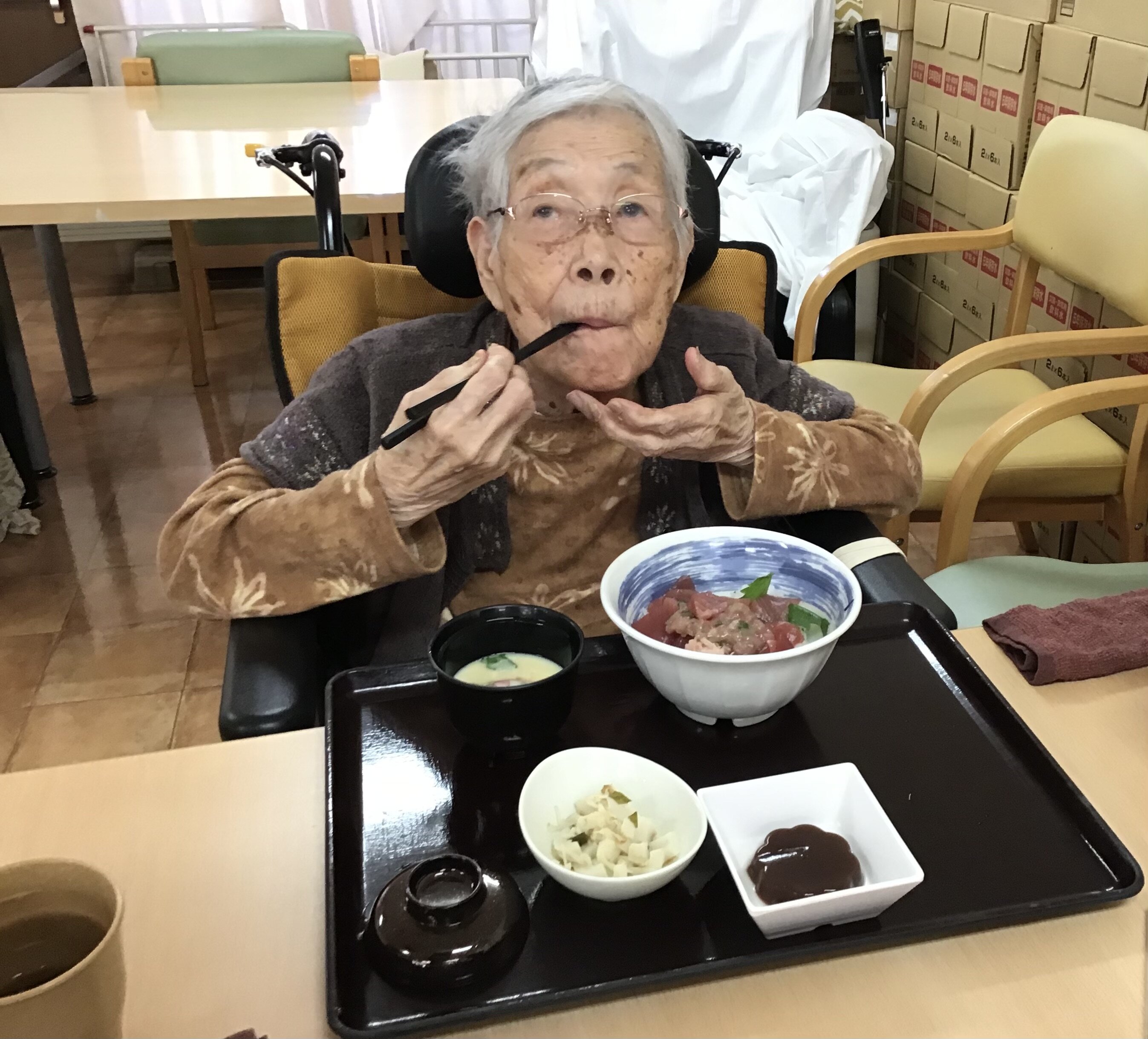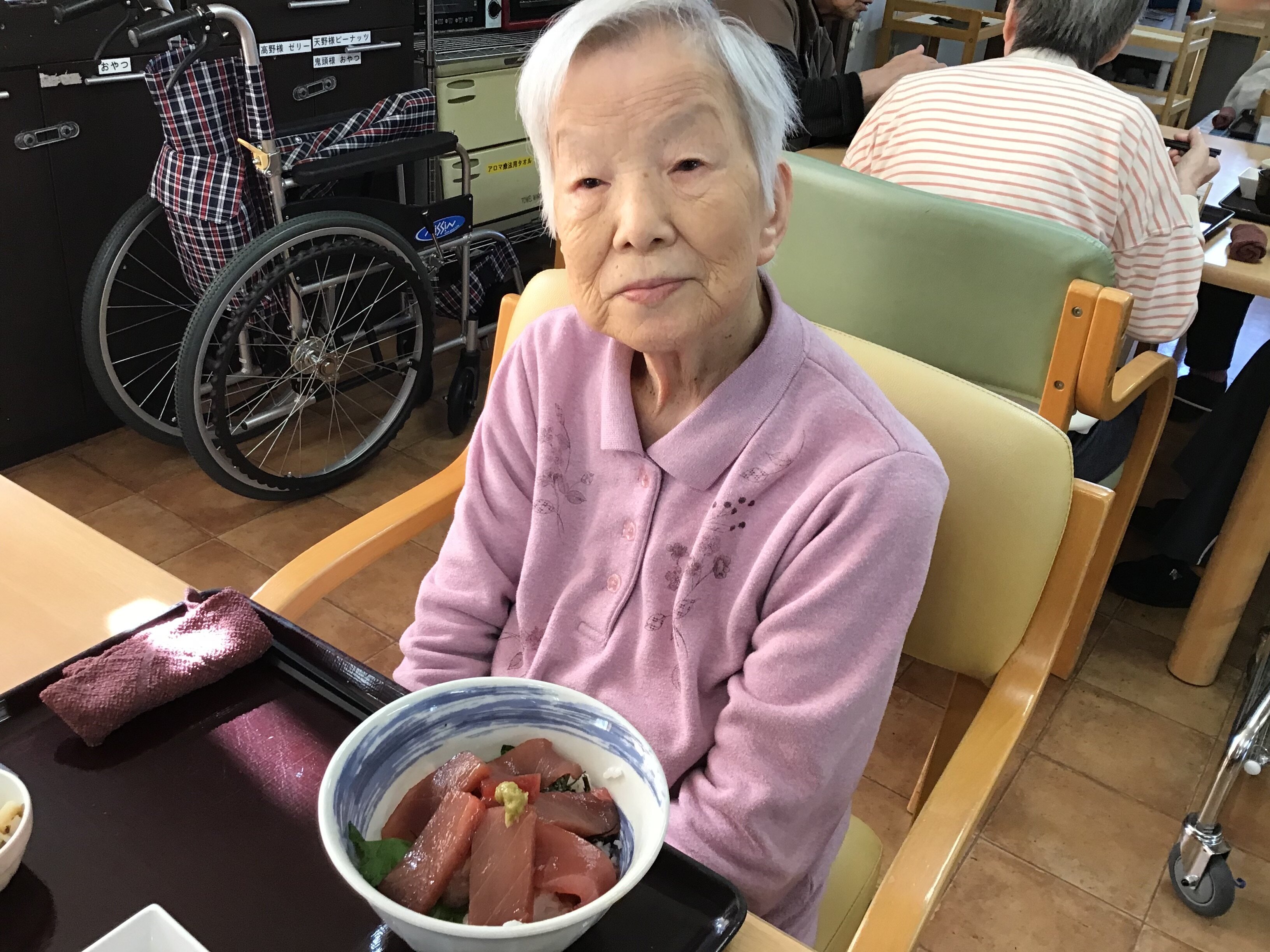 「今日のお昼ごはんは何ですか?まぐろ丼???久しぶりね~」と喜んでいただけました(*^^*)