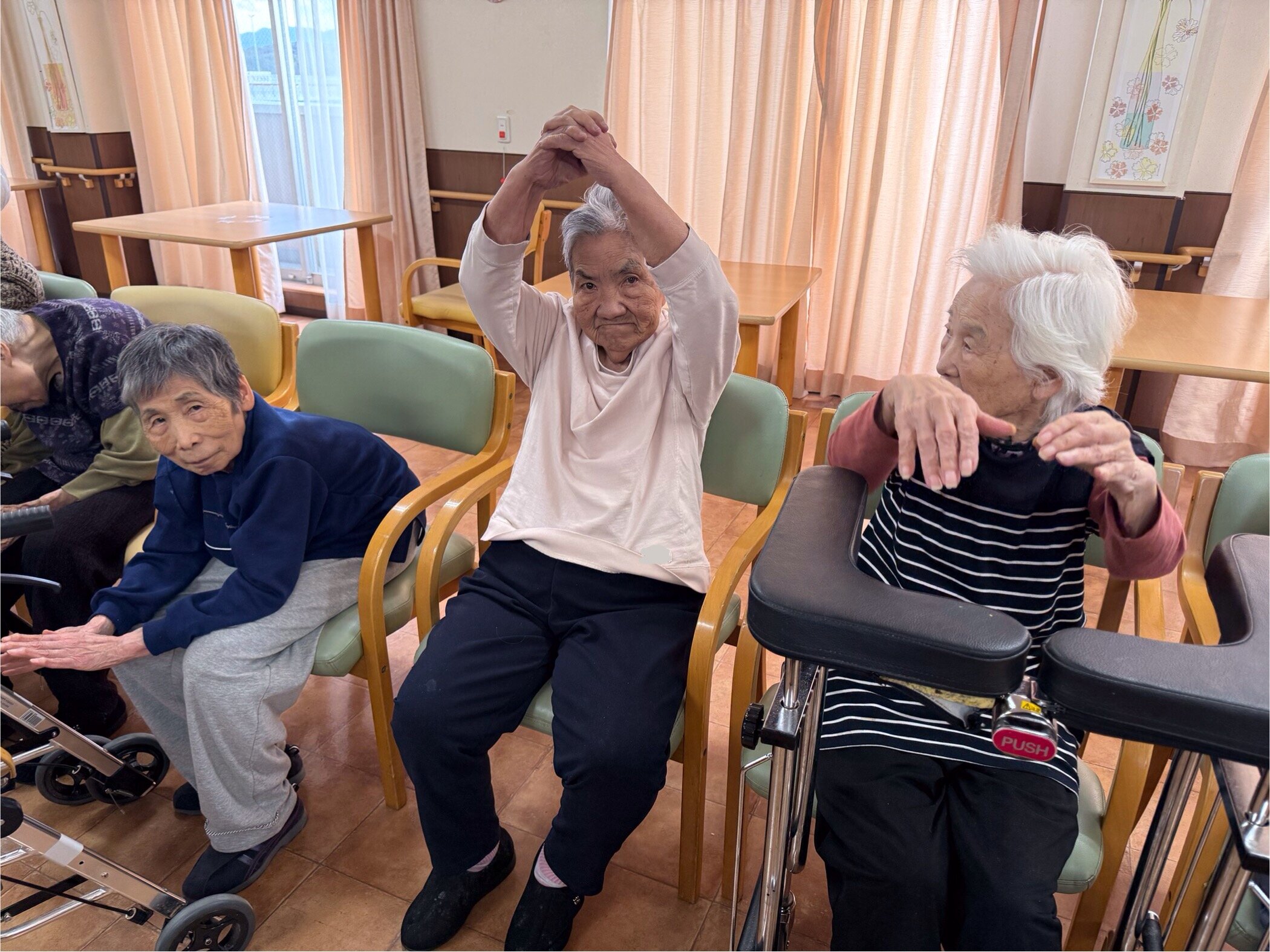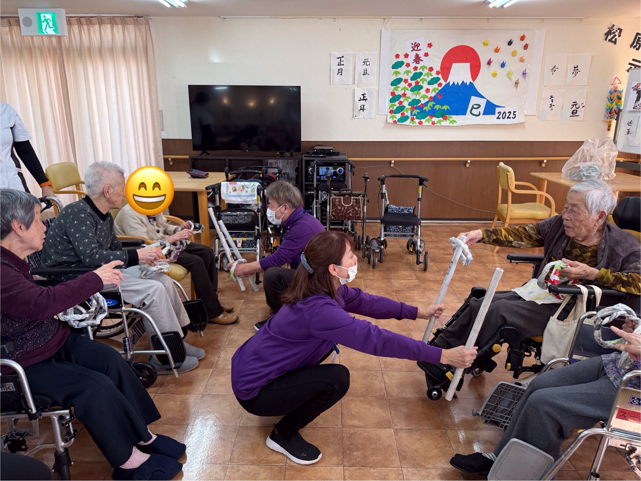 1月の誕生日レクリエーションは輪投げ!2列に並んで職員の持った棒目掛けて輪っかを投げて頂きました!