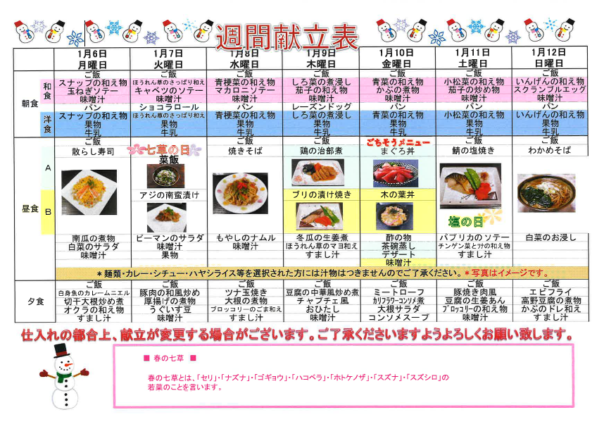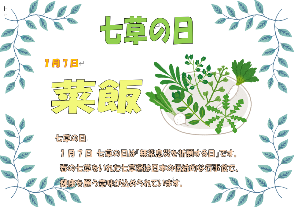七草とは「セリ・ナズナ・ゴギョウ・ハコベラ・ホトケノザ・スズナ・スズシロ」のことで、一年の無病息災を願っていただきましょう!