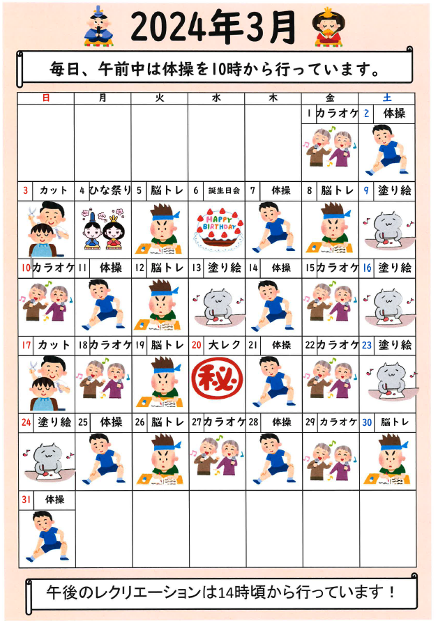 今回は3月のレクリエーションカレンダーを紹介致します!