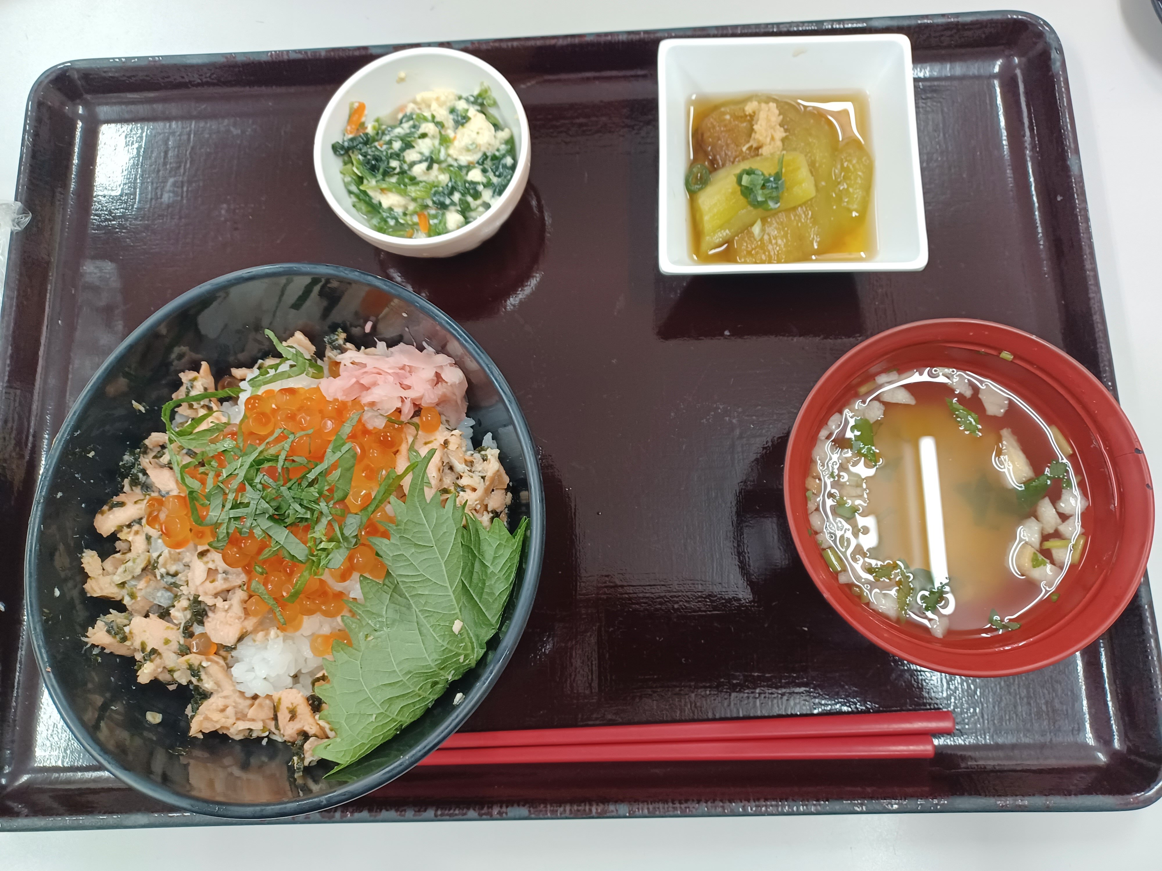 ごちそうメニューは鮭といくらの親子丼になっています。