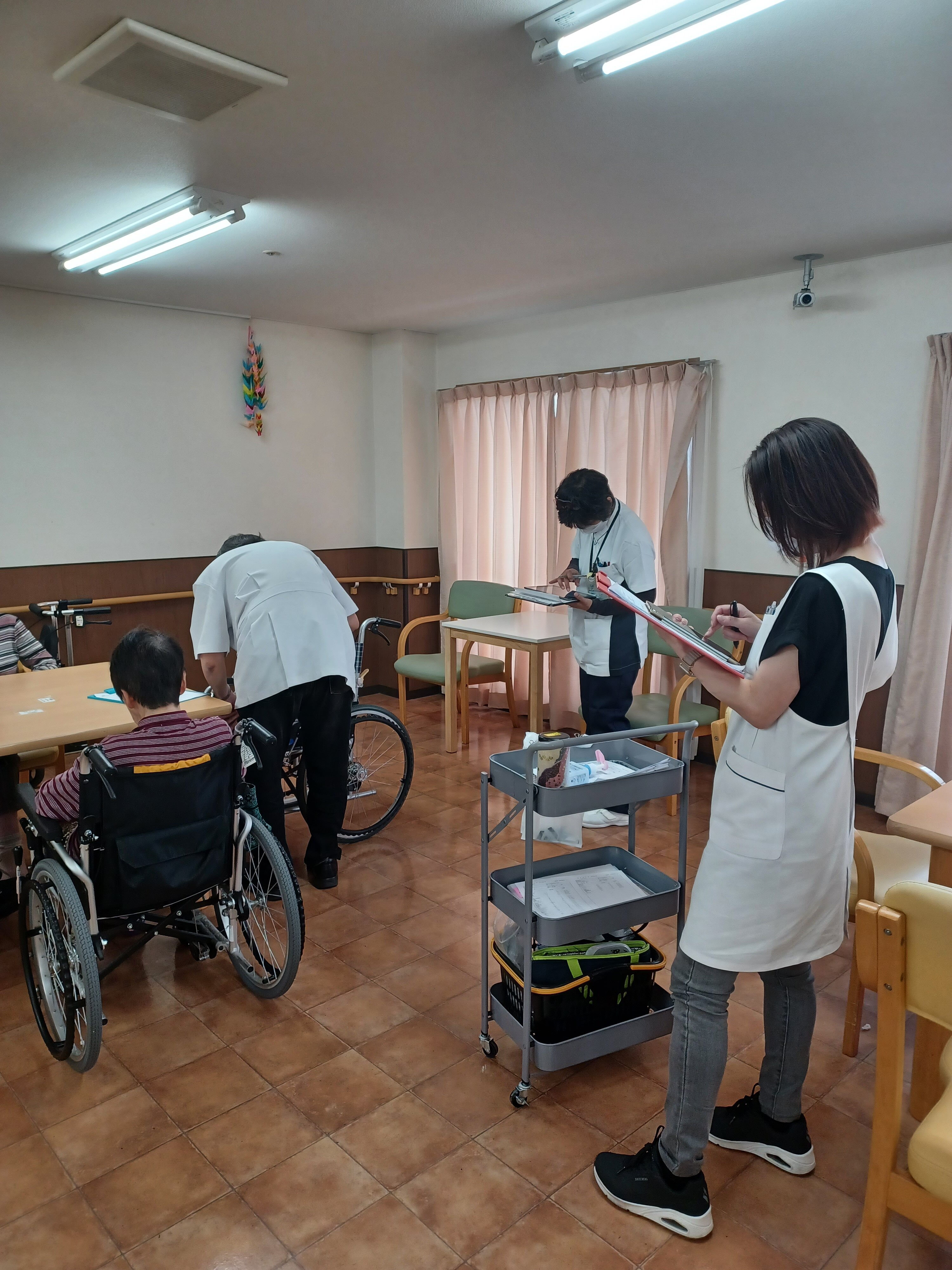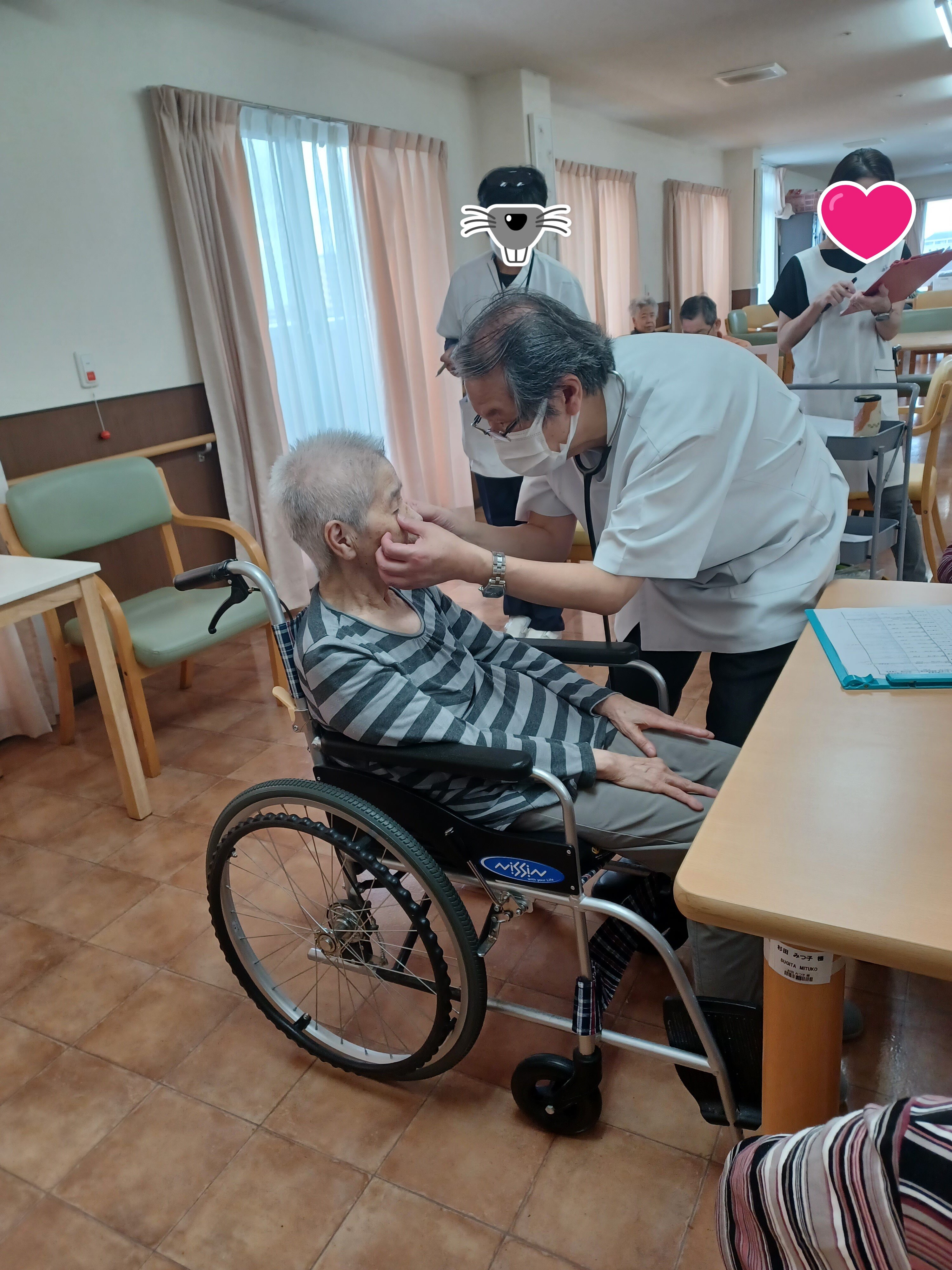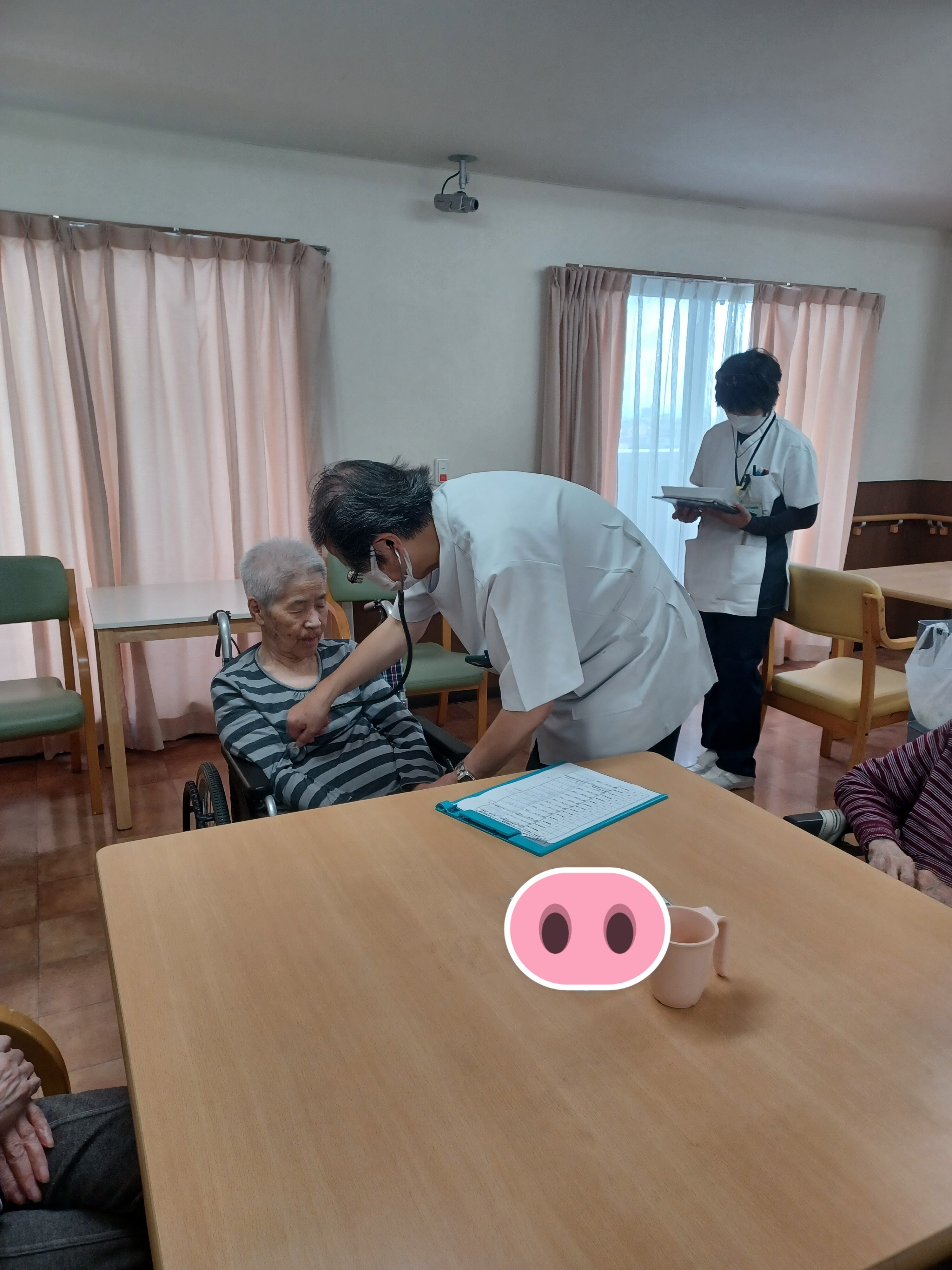 お部屋や食堂をまわって診察しています。