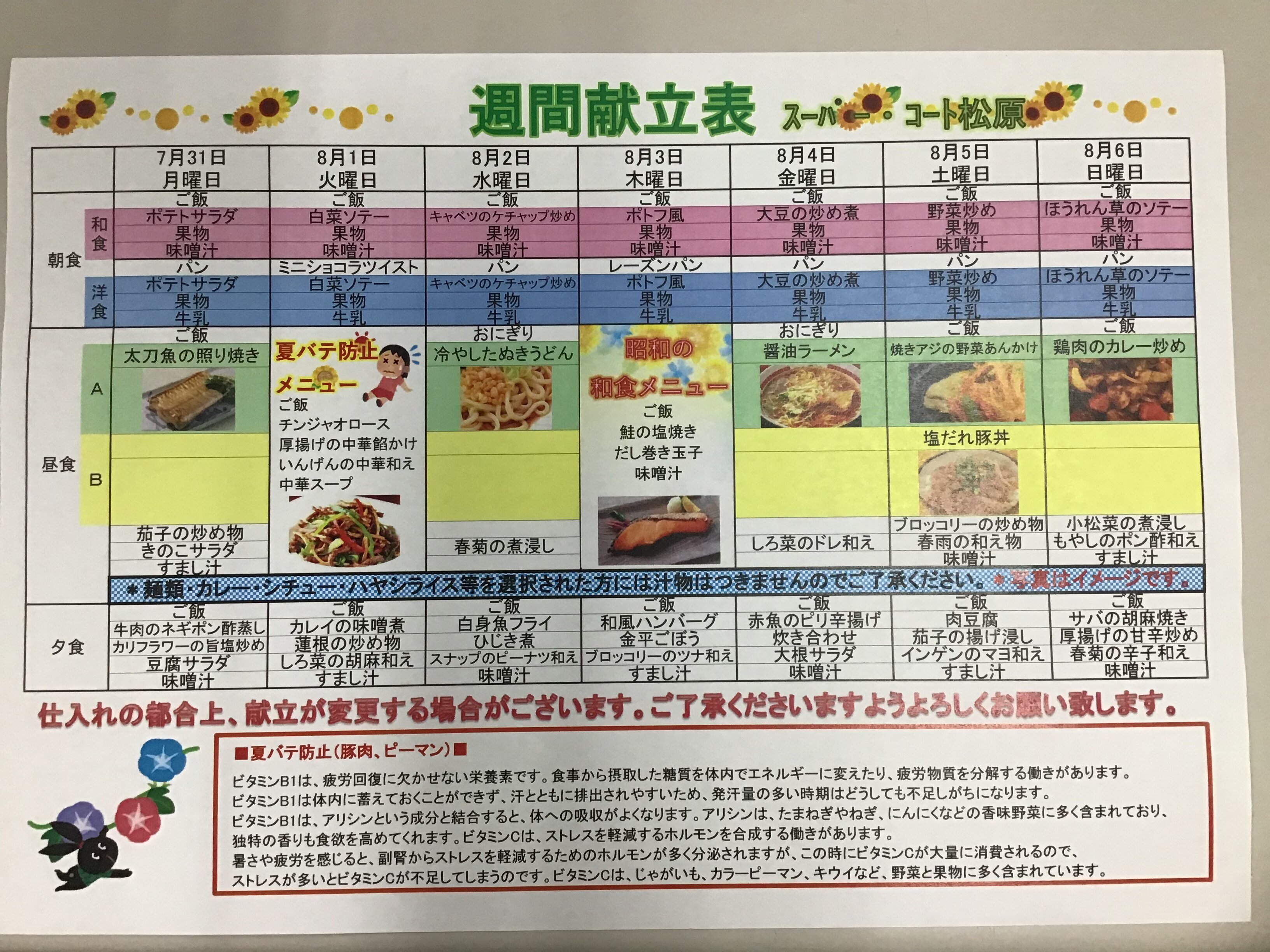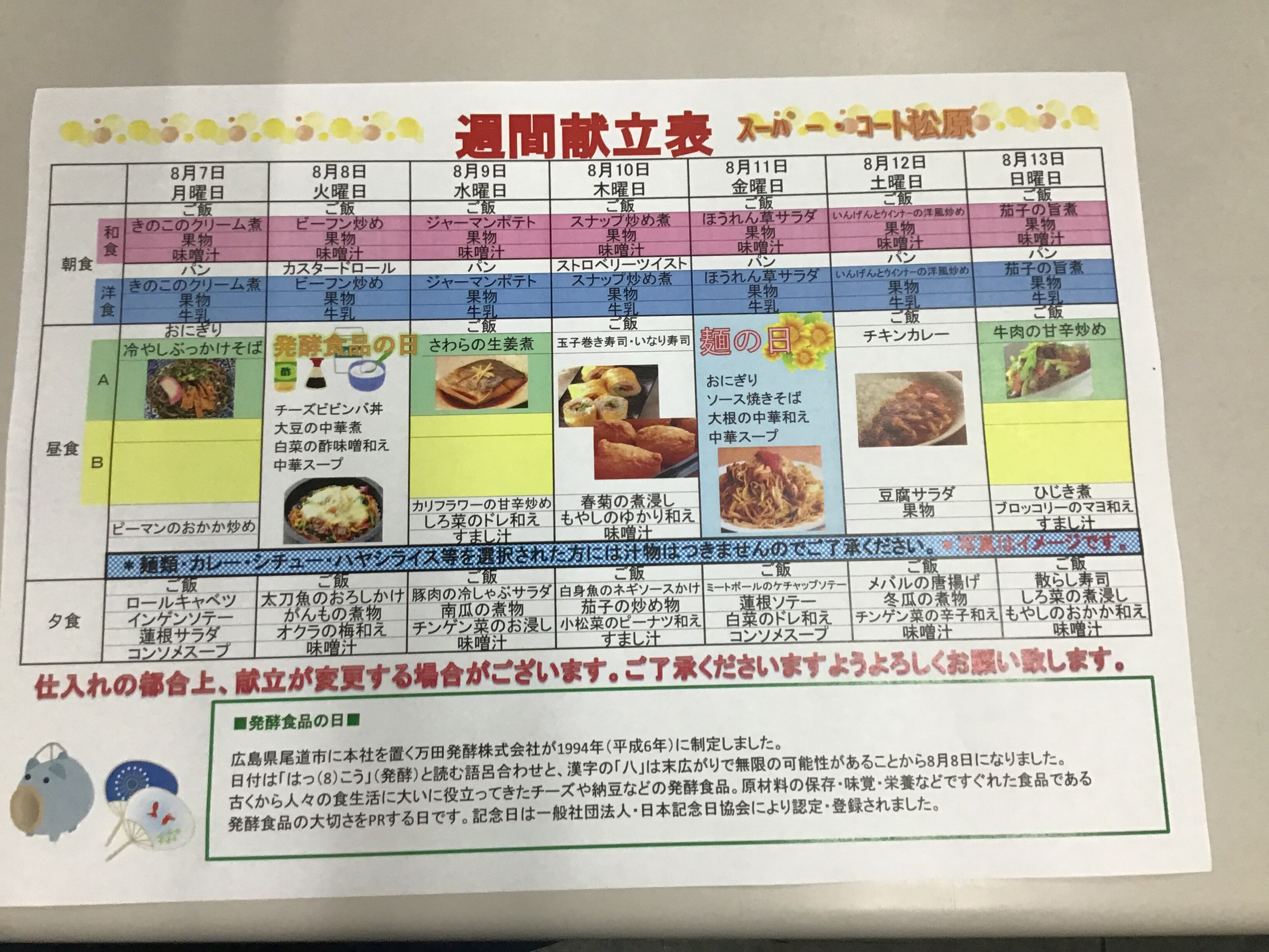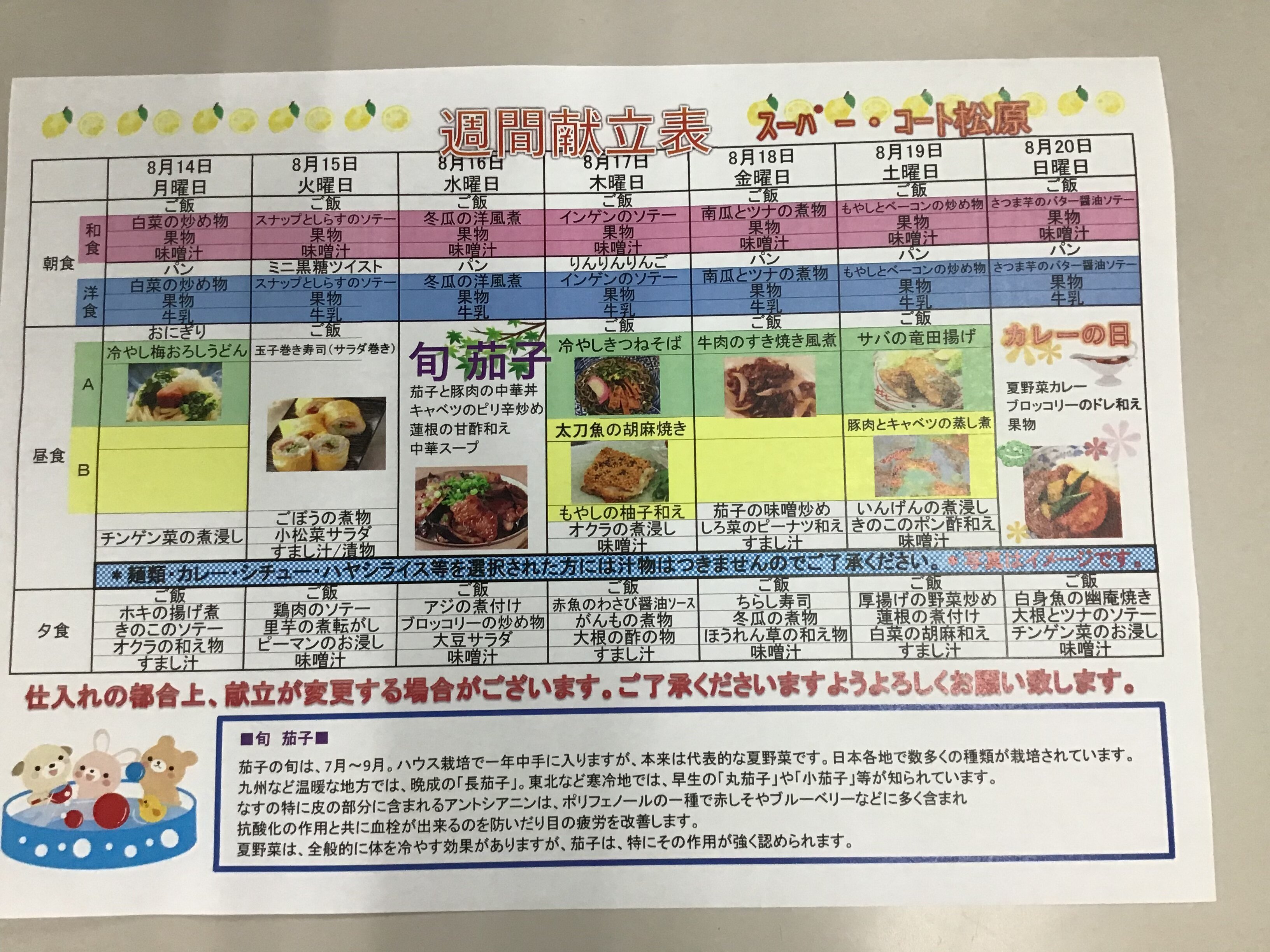 今週の食事メニューを紹介させて頂きます。