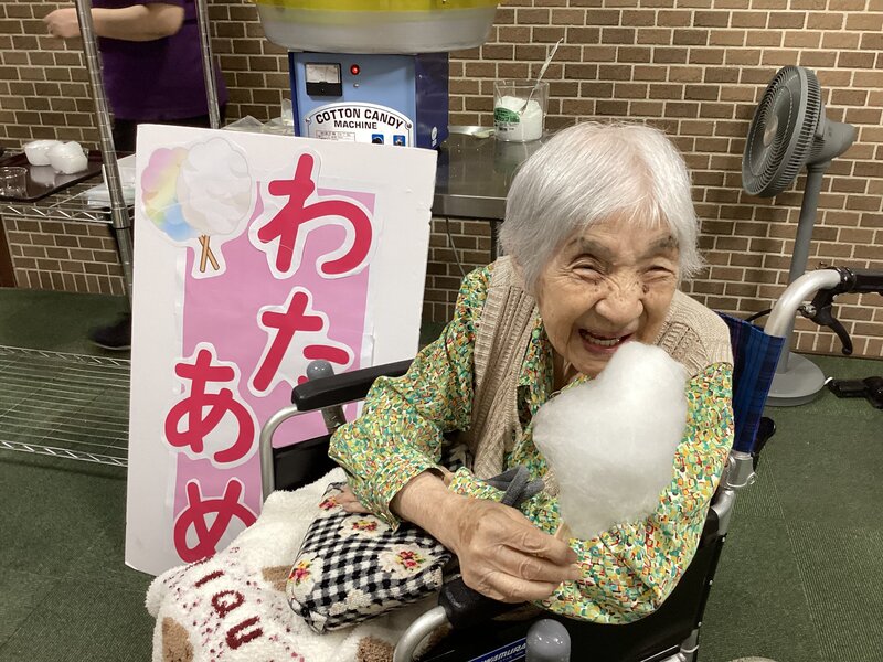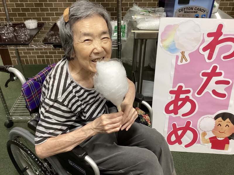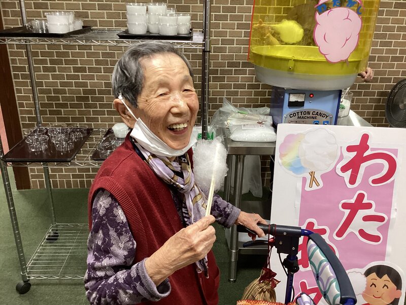 いい笑顔ですね。綿菓子は日頃食べない昔のおかし。おいしそうですね