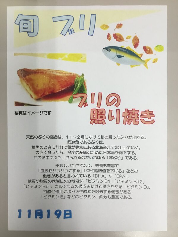 11月19日(日)はブリの照り焼きを提供させて頂きます(/・ω・)/