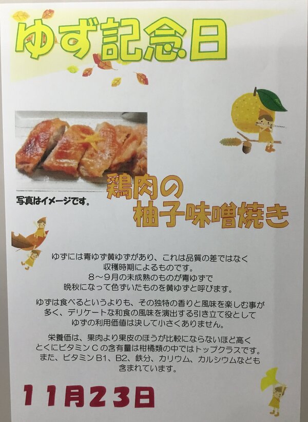 11月23日(木)はゆず記念日で鶏肉の柚子味噌焼きです\(^o^)/