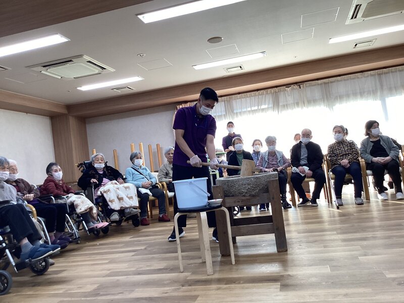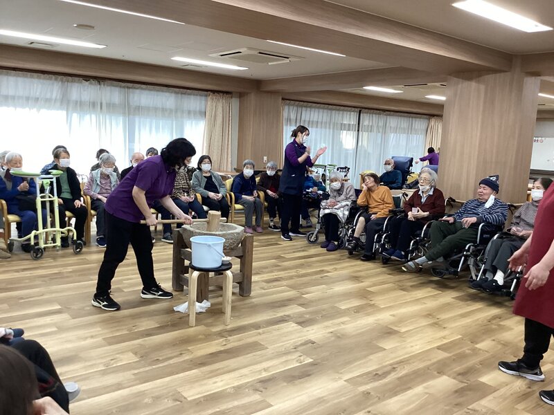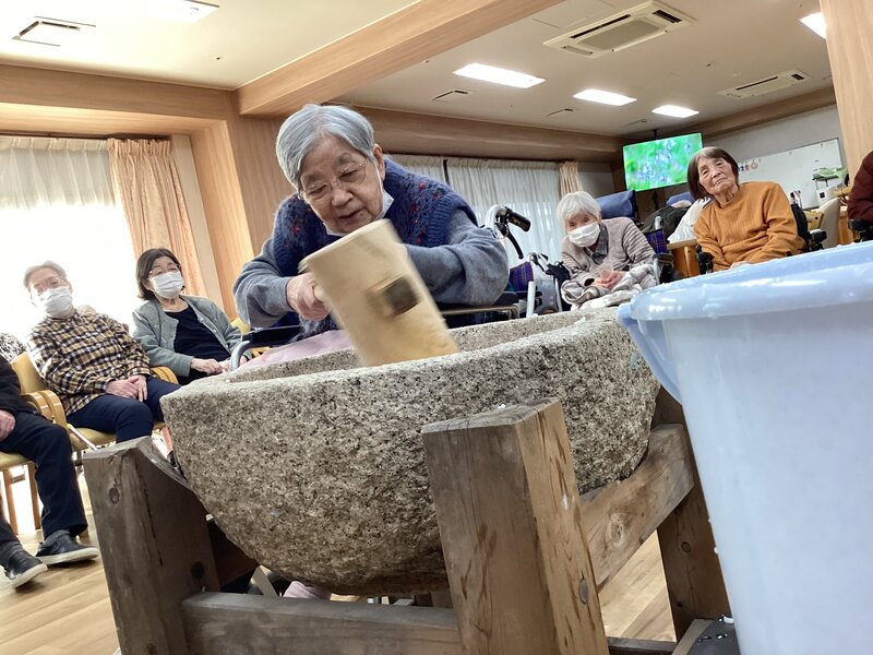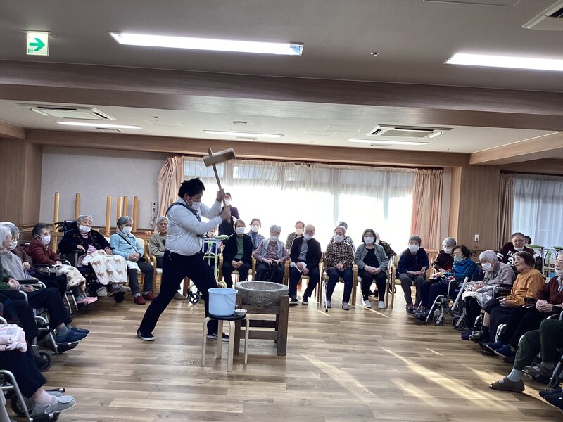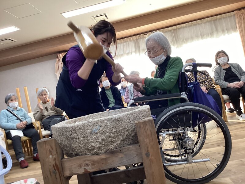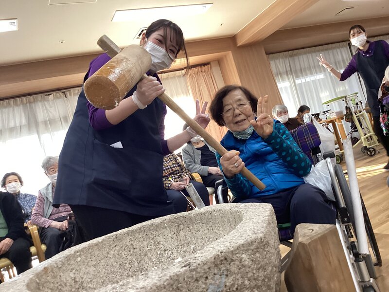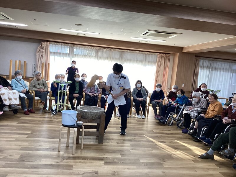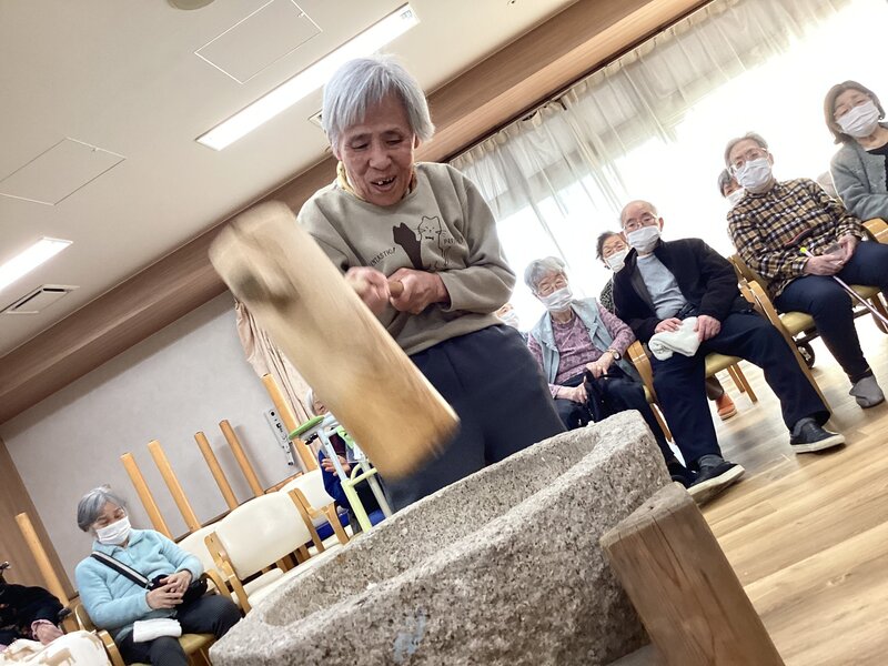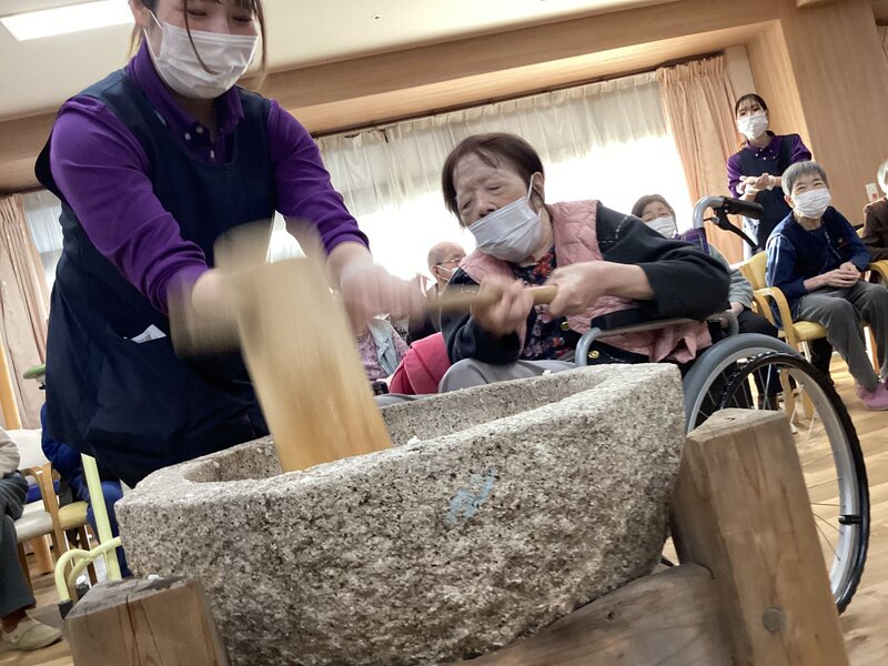 餅つきを恒例行事で出来るのは凄く羨ましいことだと思いました。ご入居者が喜ばれるのは分かっていますが、喉つめリスクを考えてしまってなかなか踏み出せずです。