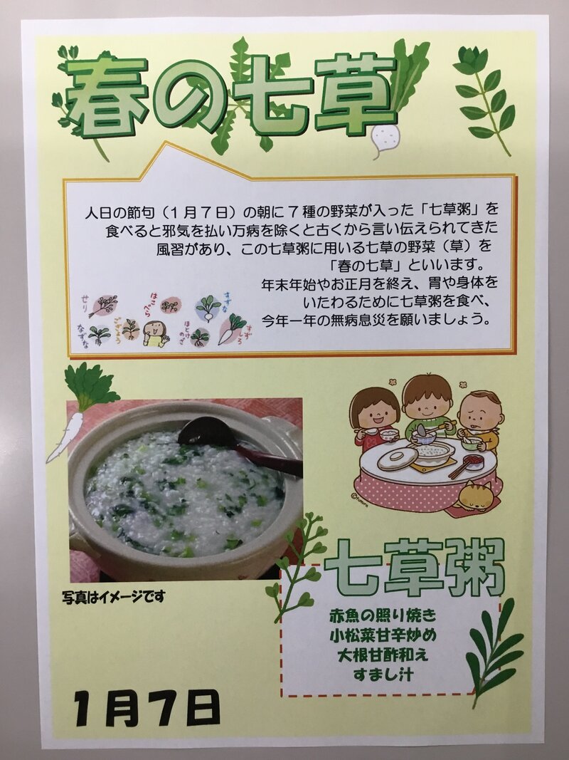 昼食に【七草粥・赤魚の照り焼き・小松菜の炒め物・大根の甘酢和え・すまし汁】