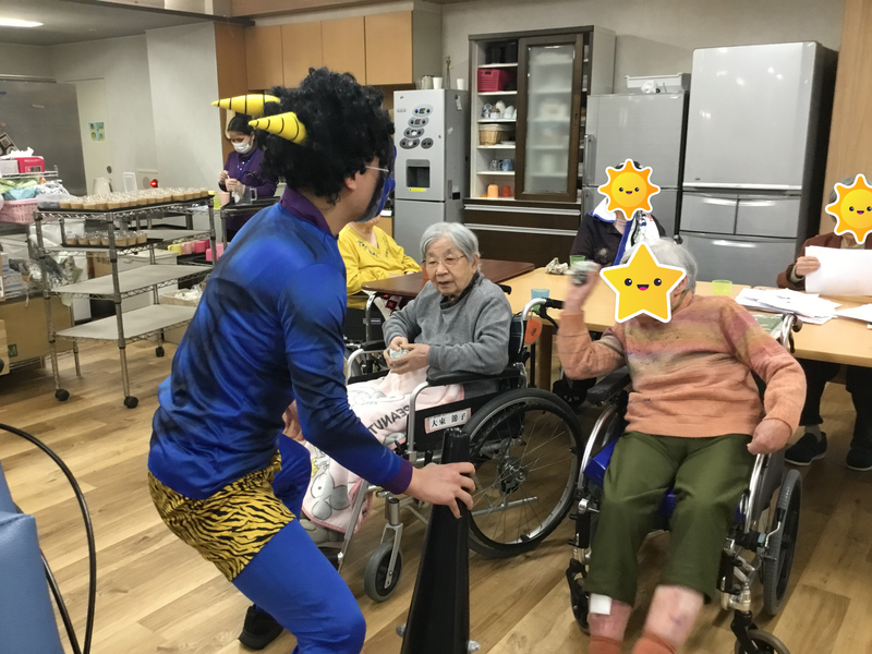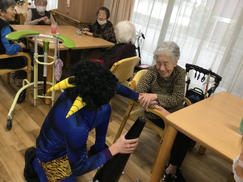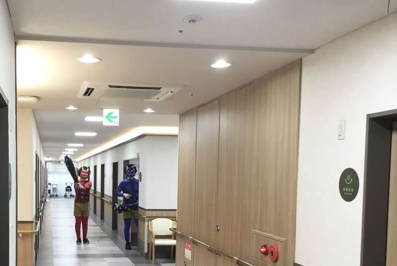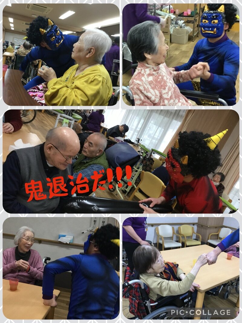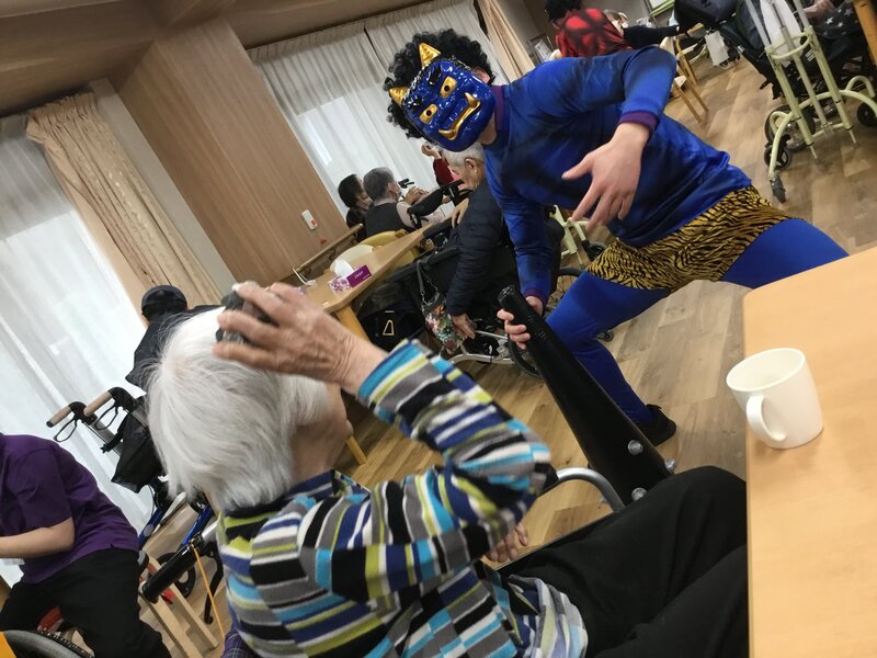 前日、ご入居者の方に新聞紙で鬼さんに向かって投げる豆を作ってもらい