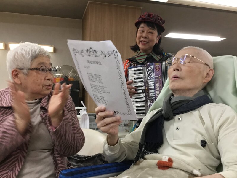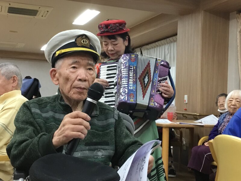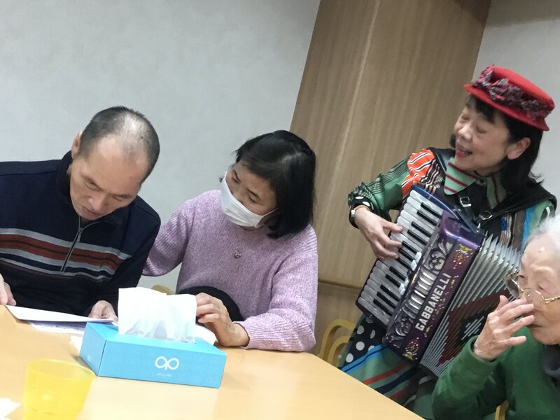 ご入居者の方たちに配布した歌詞カードを見ながら一生懸命歌って下さったり・・・