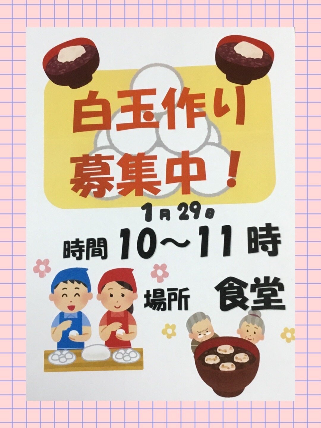 いつもスーパー・コート三国ブログをご覧いただき誠に有難うございます。明日は白玉ぜんざいを提供させていただきます。五感で懐かしさを味わうひとときを、ご入居者とご一緒に出来ればと思いポスター作成しました。