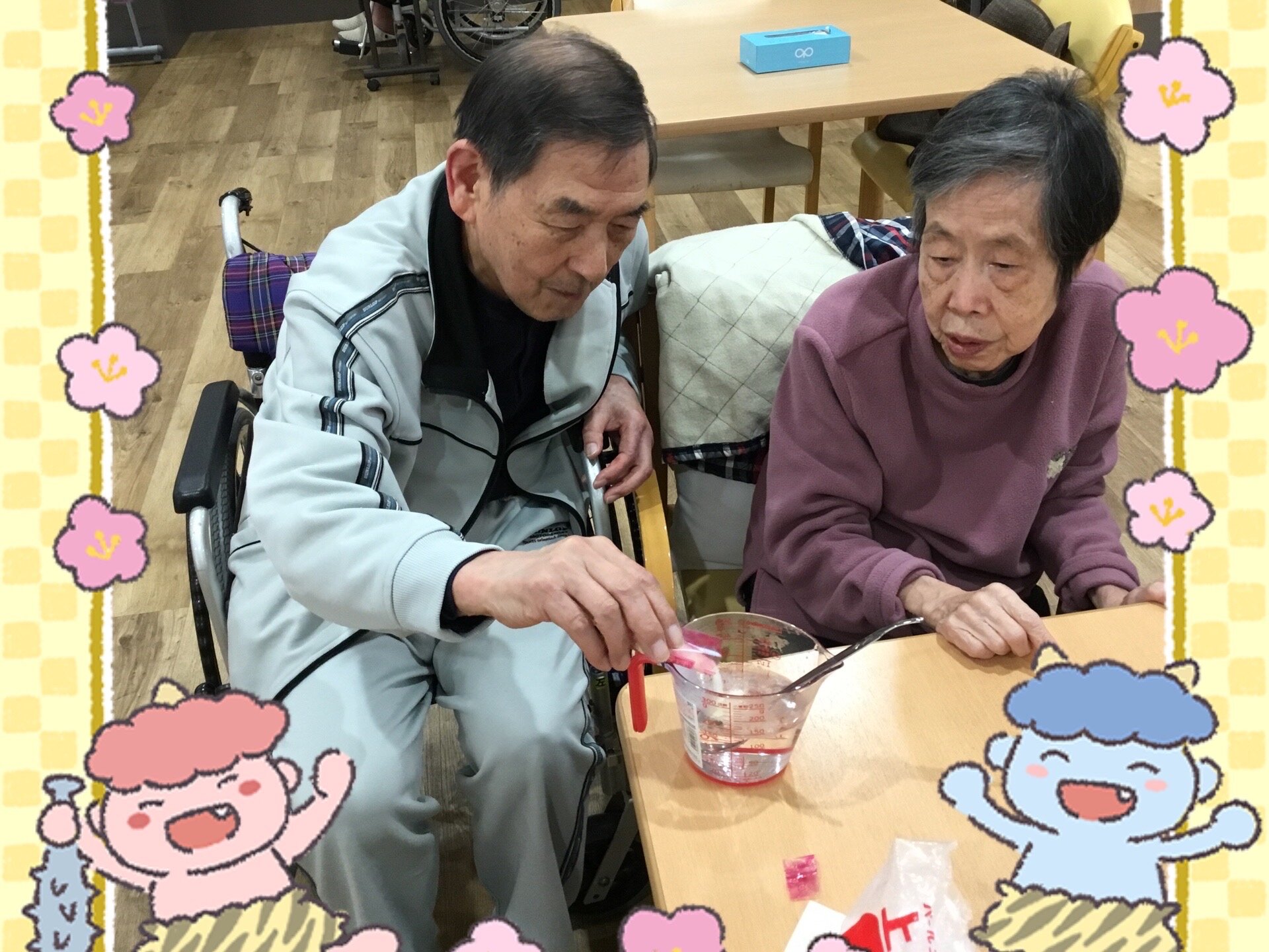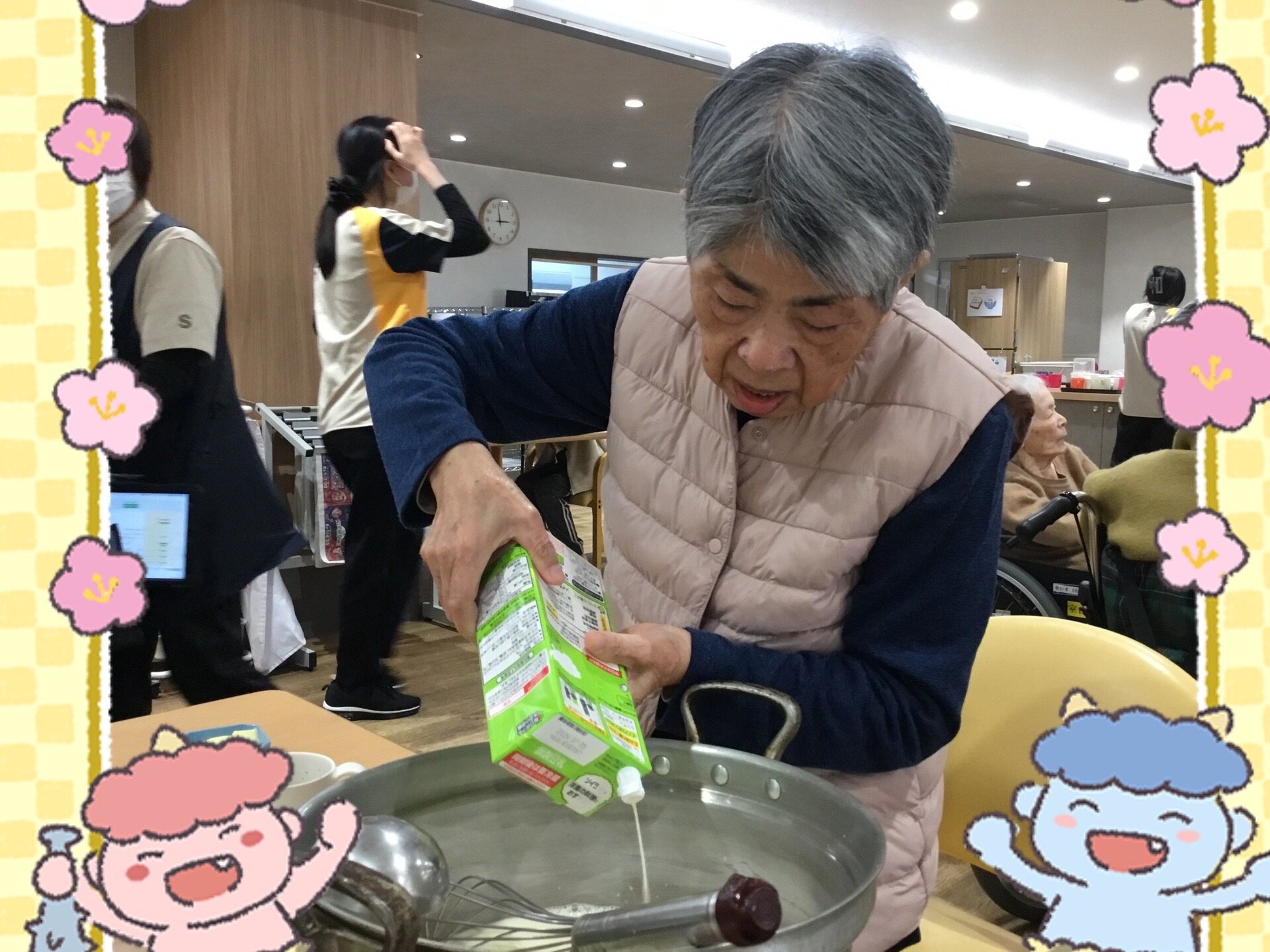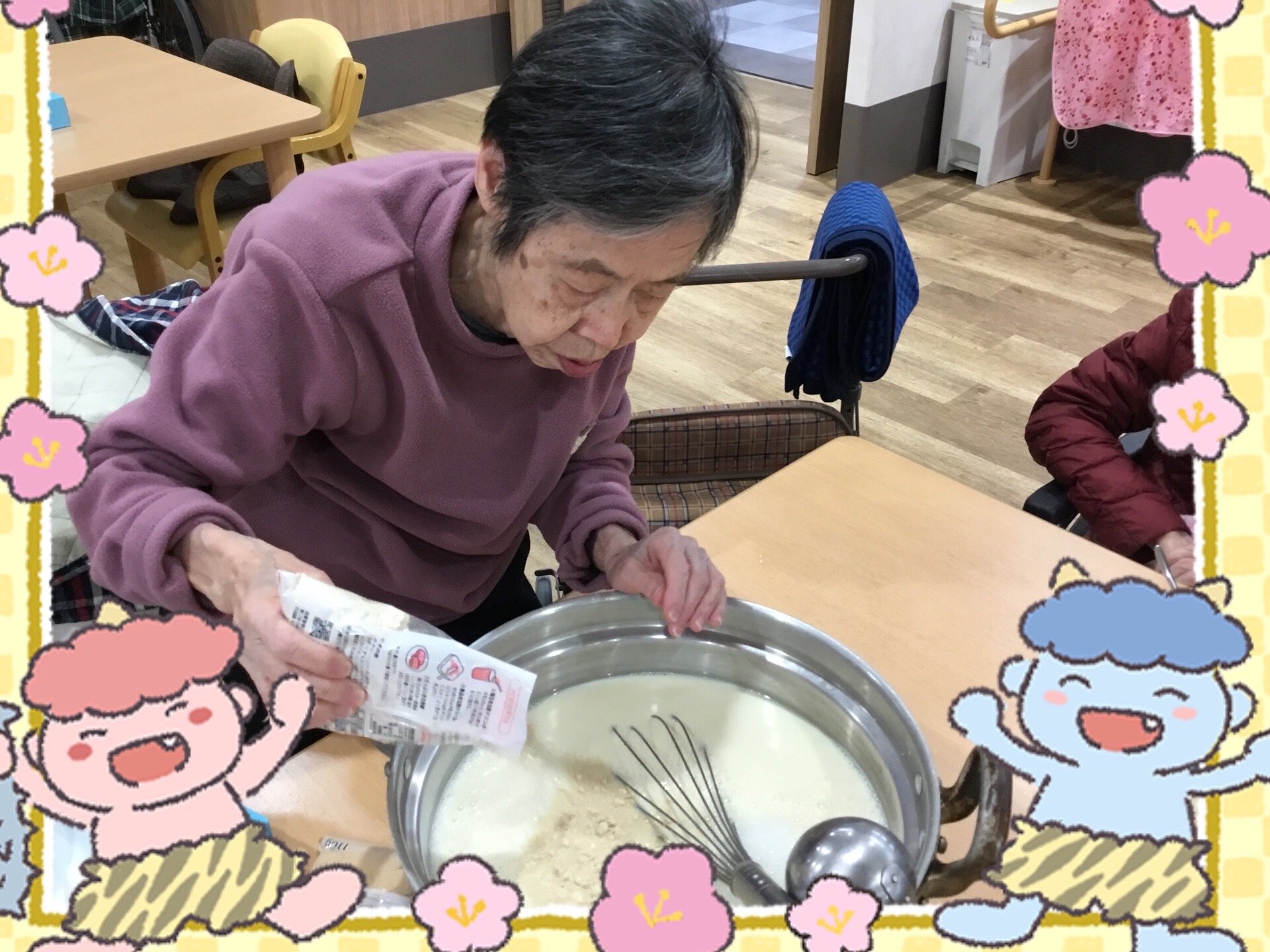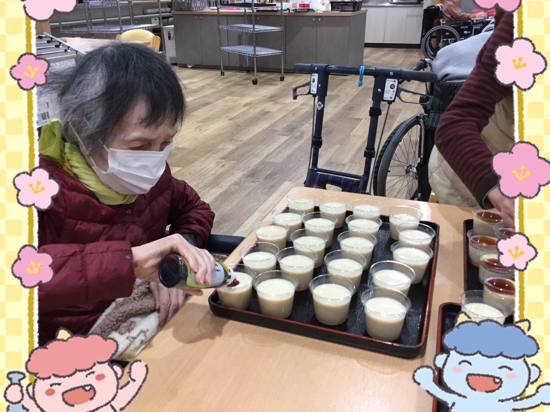 いつもスーパー・コート三国ブログをご覧いただき誠にありがとうございます。節分にちなんで豆乳きな粉プリンを、ご入居者と一緒に作りました。調理中はこんなん固まる?と言われていましたが出来上がりを見て不思議ね~魔法にかかったようでした(^ω^)