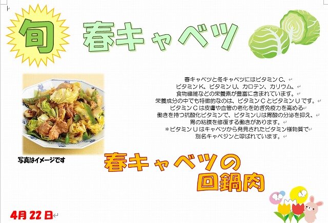 4/22(月)に旬のキャベツを使った回鍋肉を準備しております。