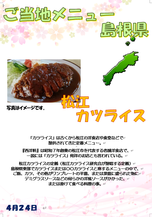 4/24(水)は島根県のご当地メニューの松江カツライスを準備しております。