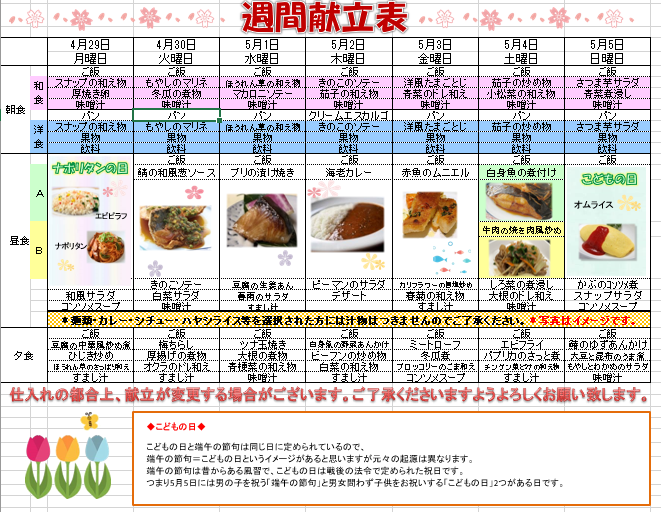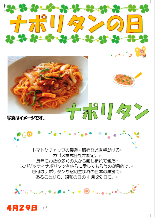 4/29(月)はナポリタンの日でナポリタンを準備しております。