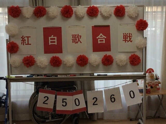 白組の男性チーム、紅組の女性チームが交互に歌い点数を競います!