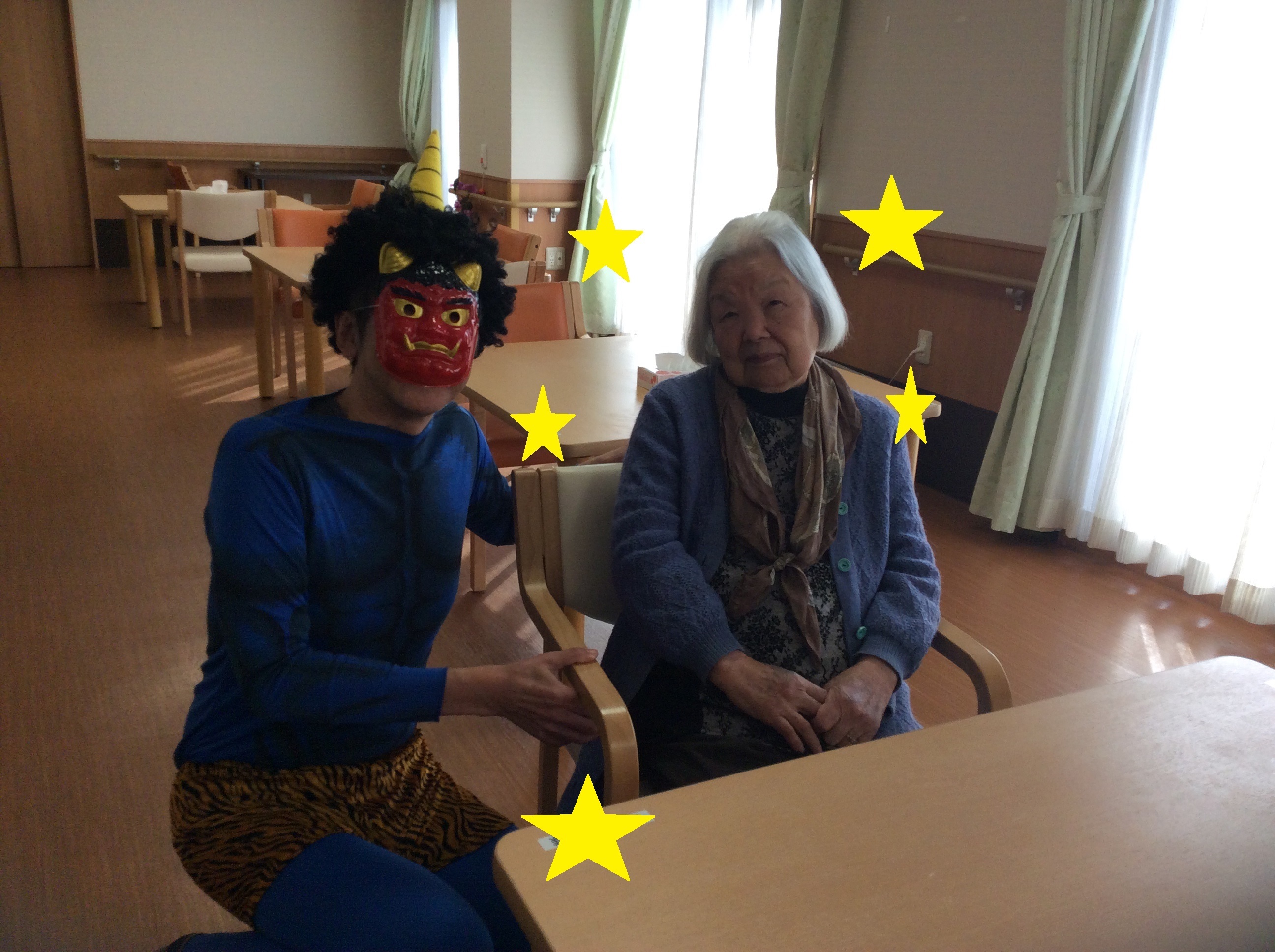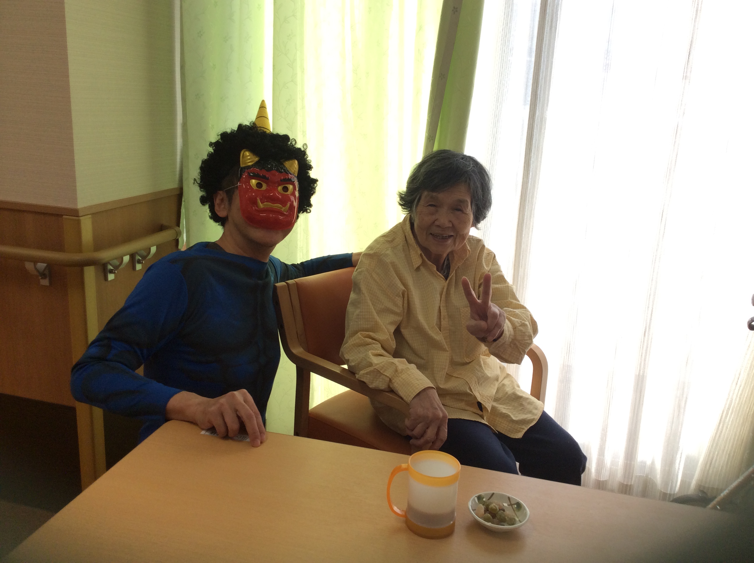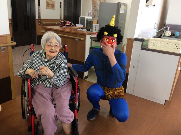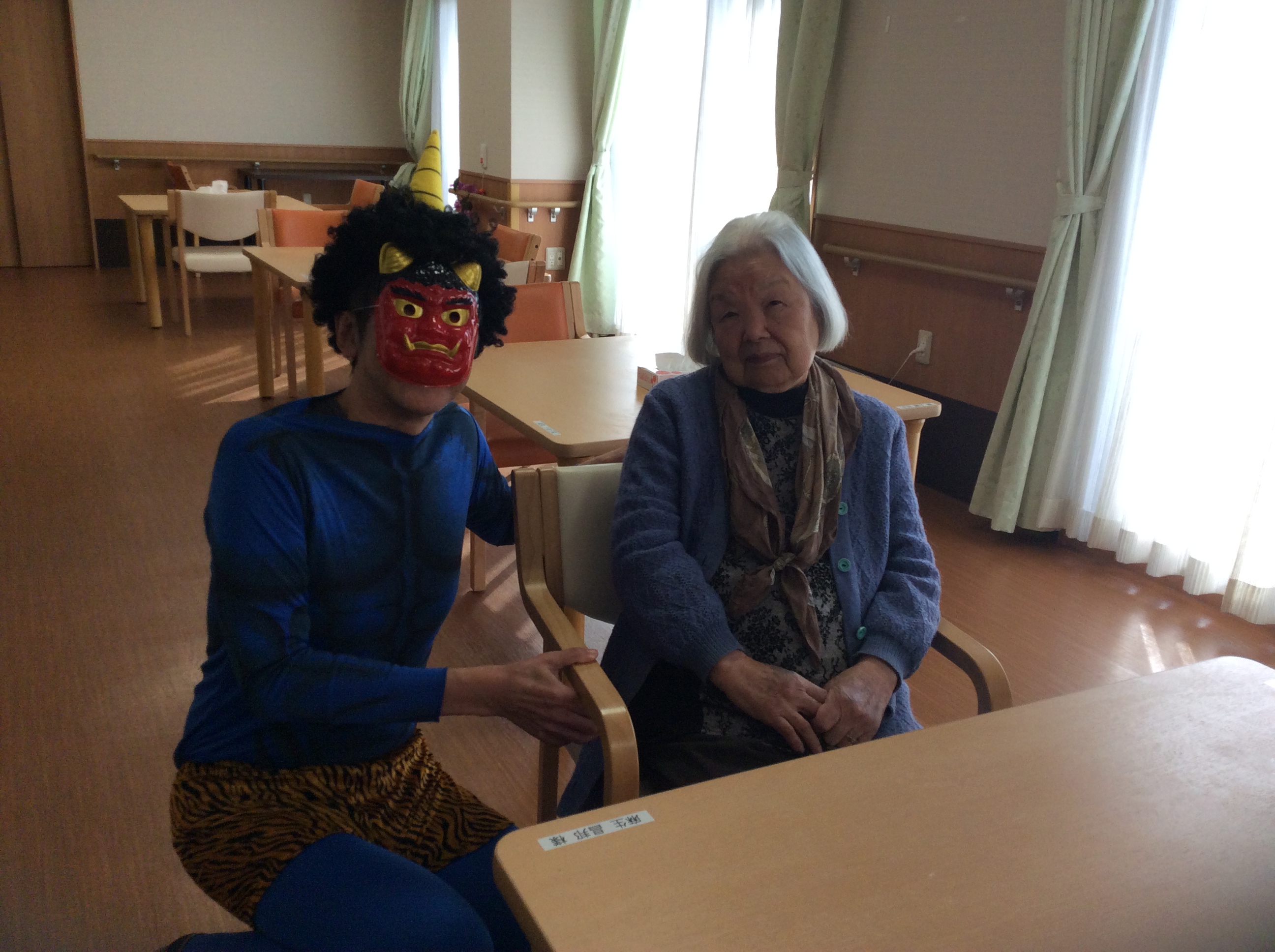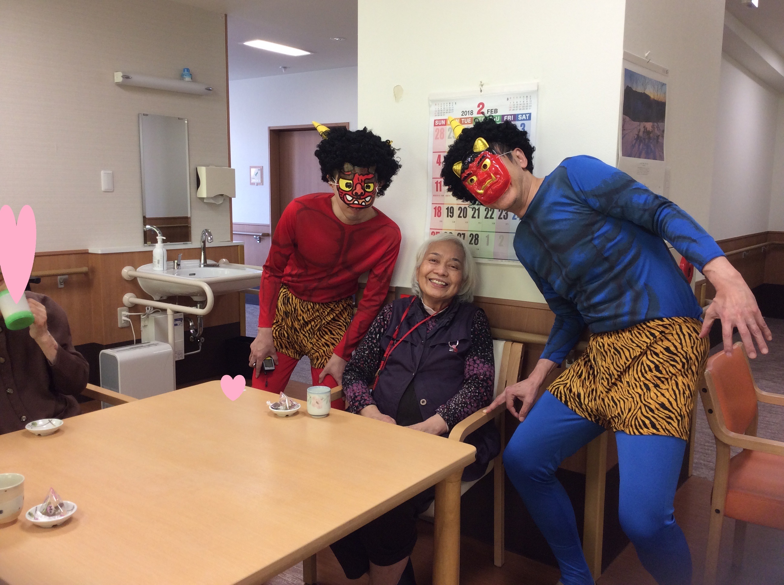 赤鬼、青鬼のコンビが現れ、ご入居者の皆様に挨拶をしに来てくれました☆