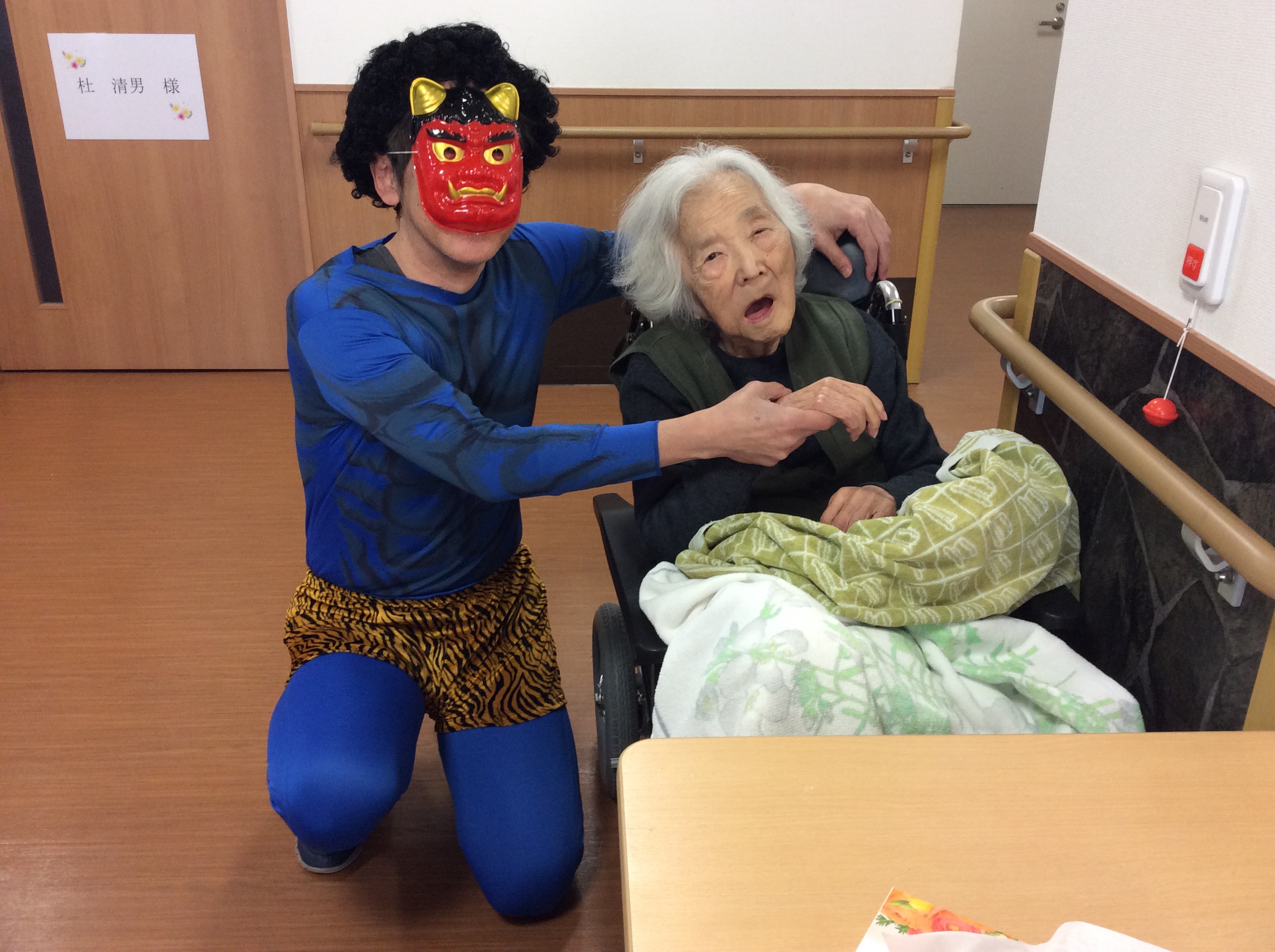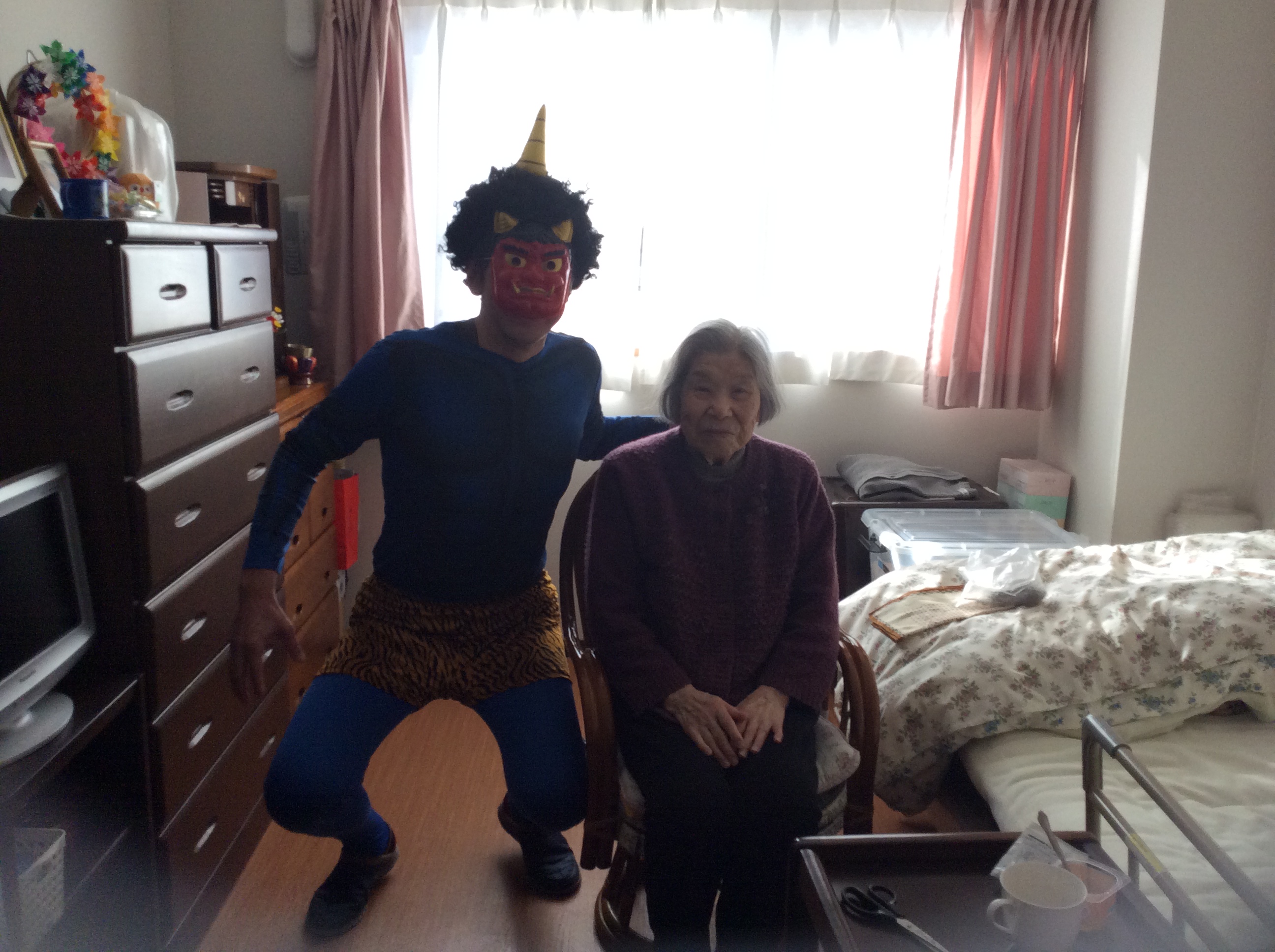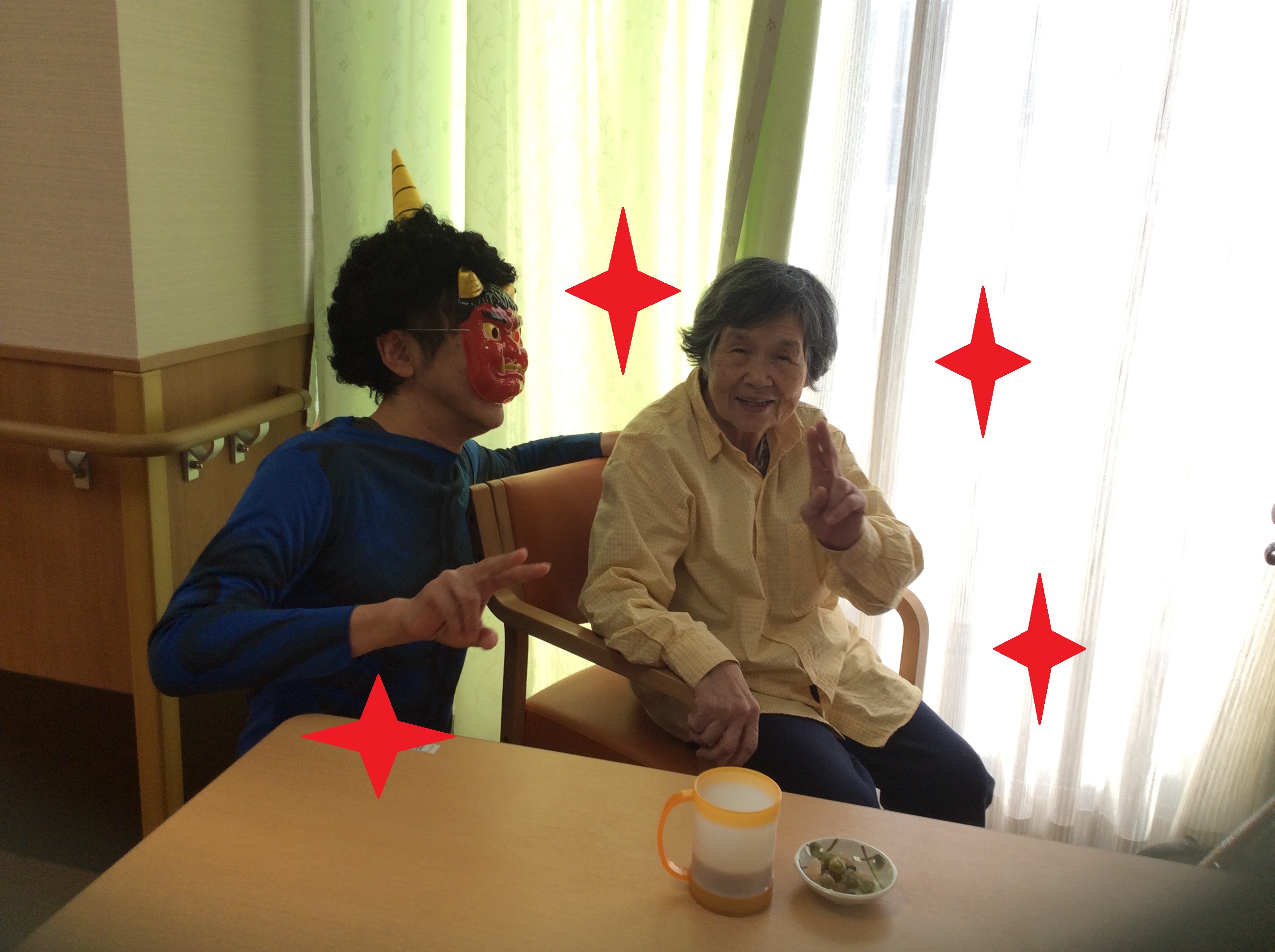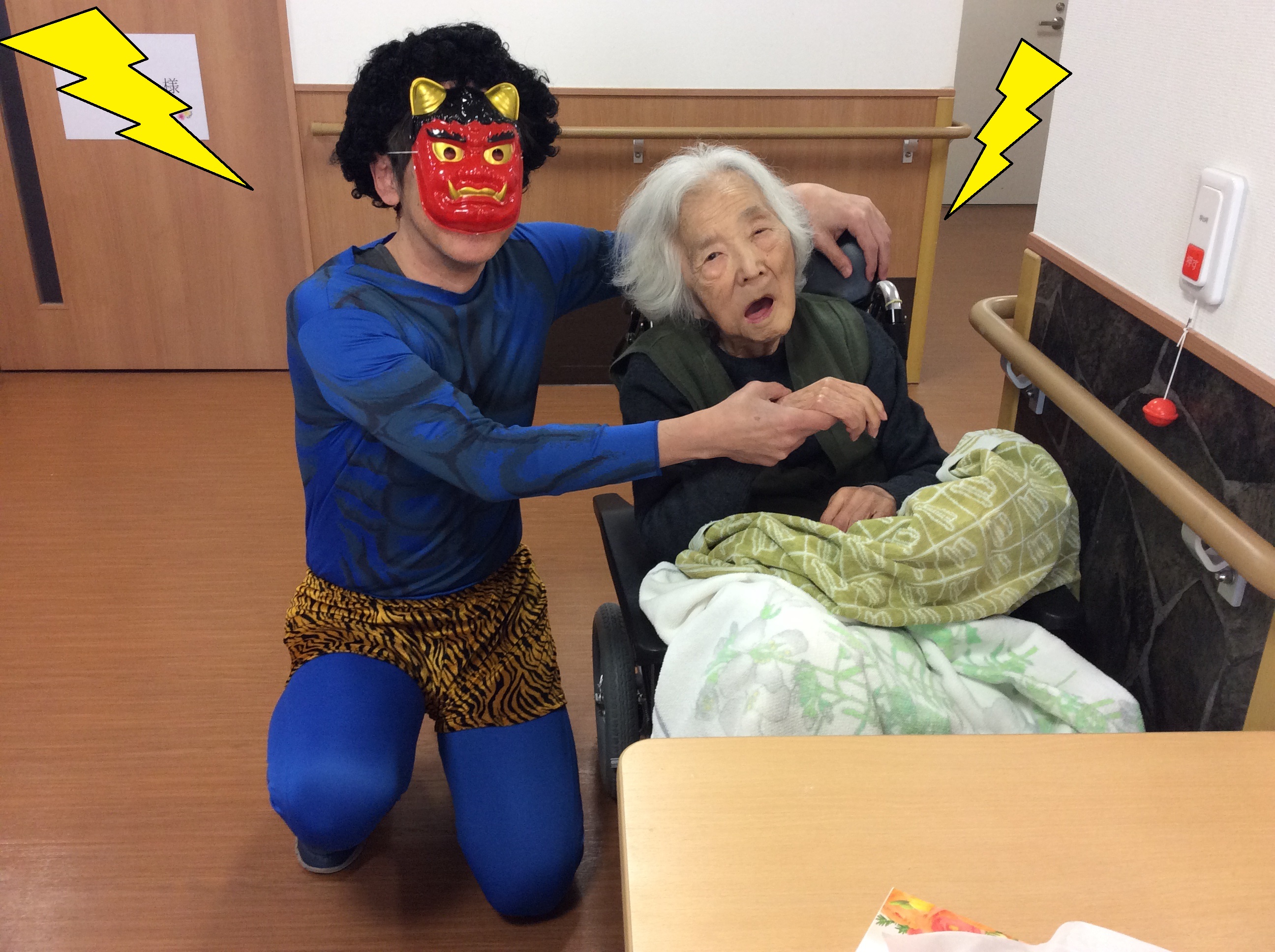 赤鬼、青鬼のコンビが現れ、ご入居者の皆様に挨拶をしに来てくれました☆