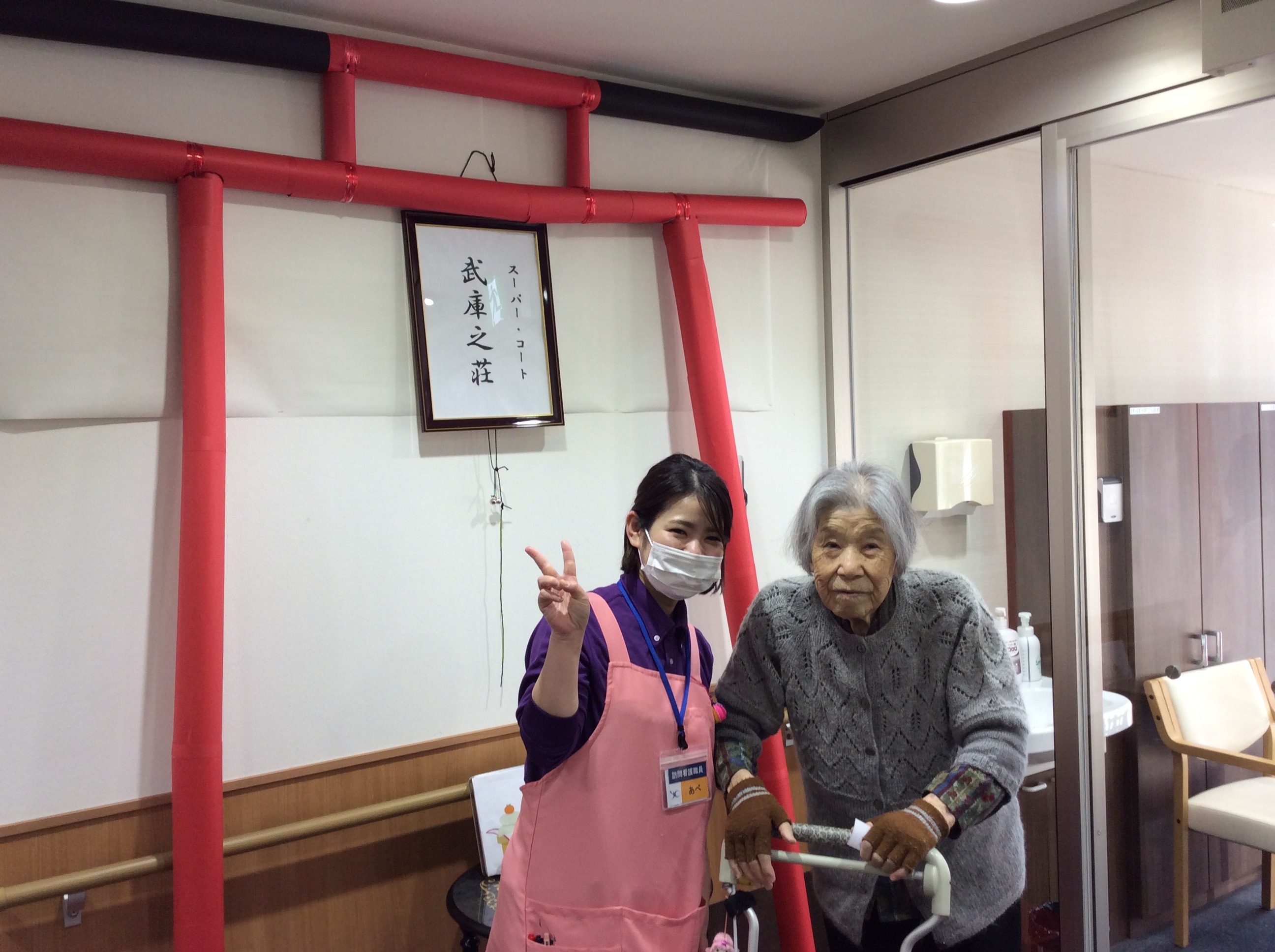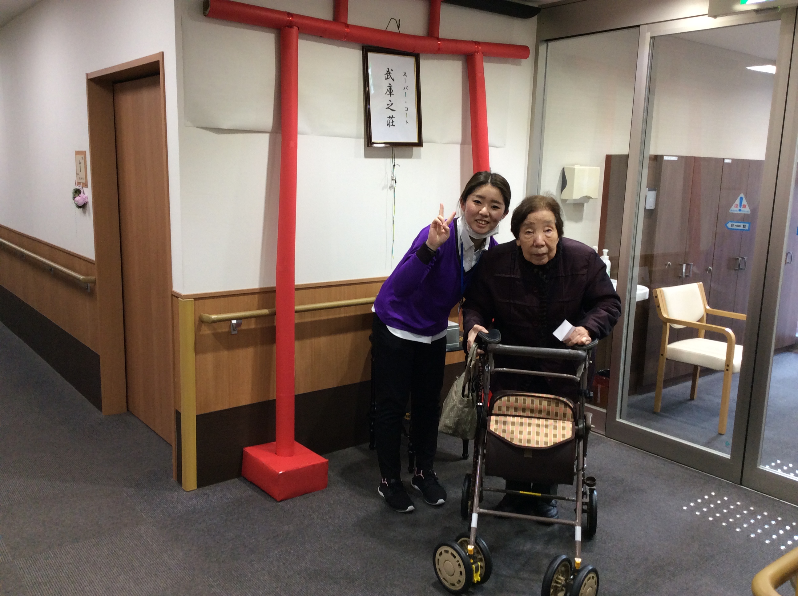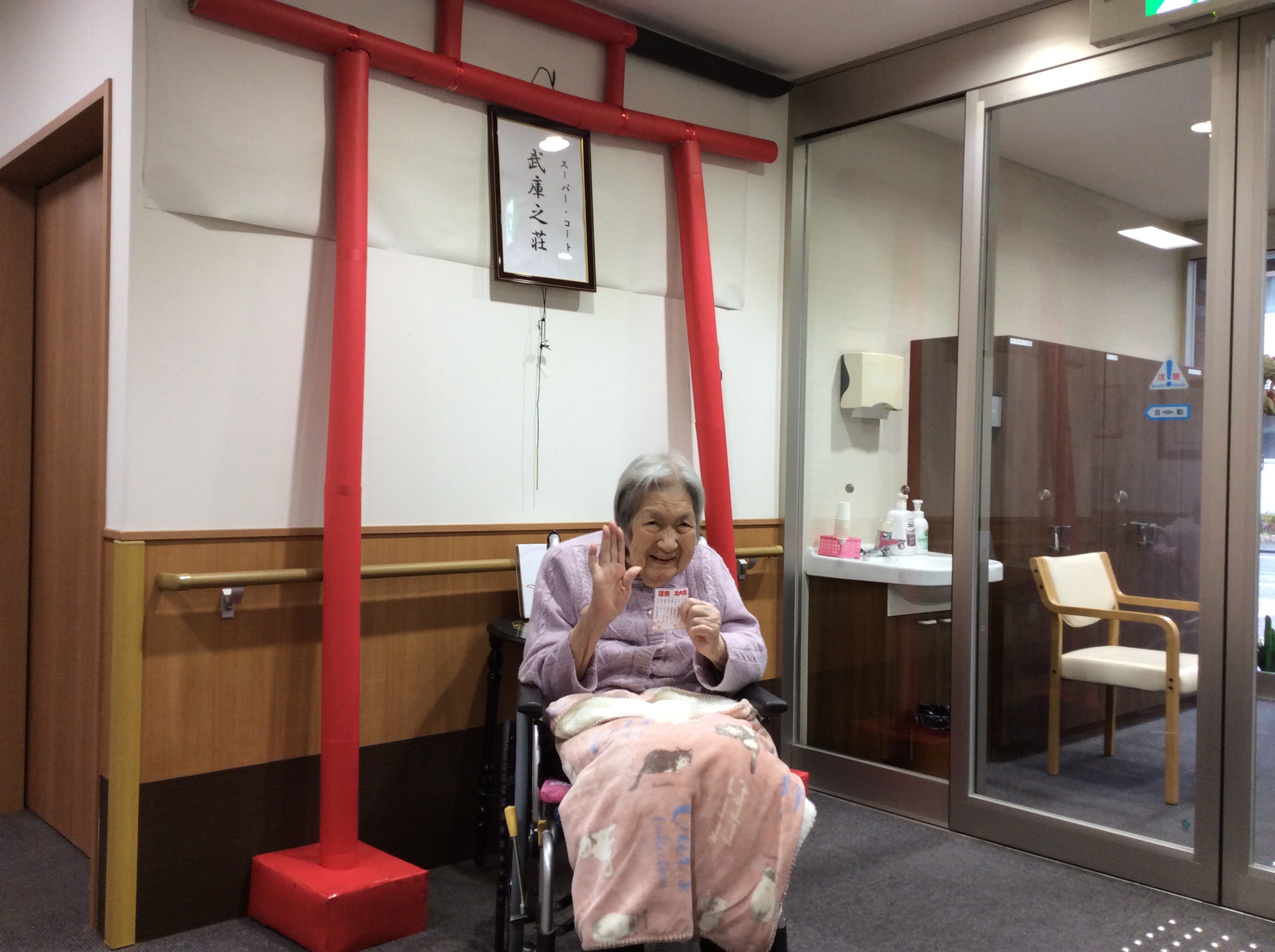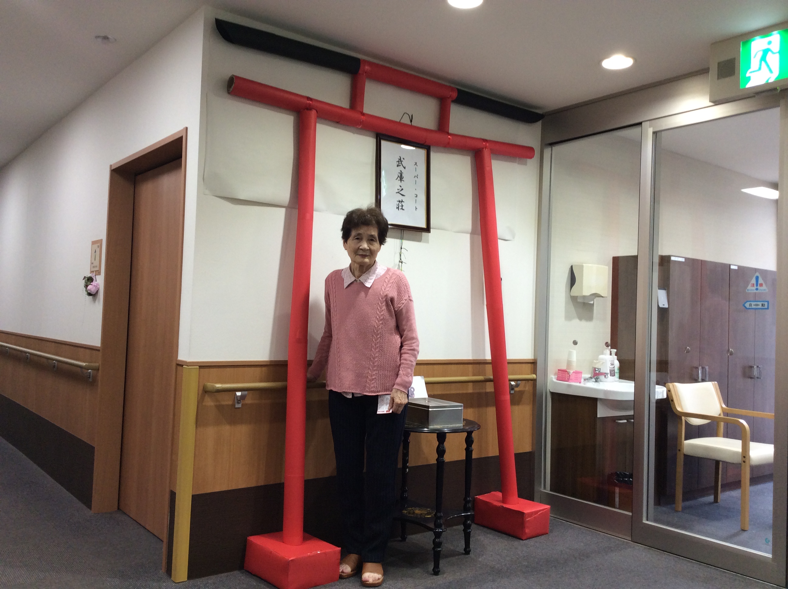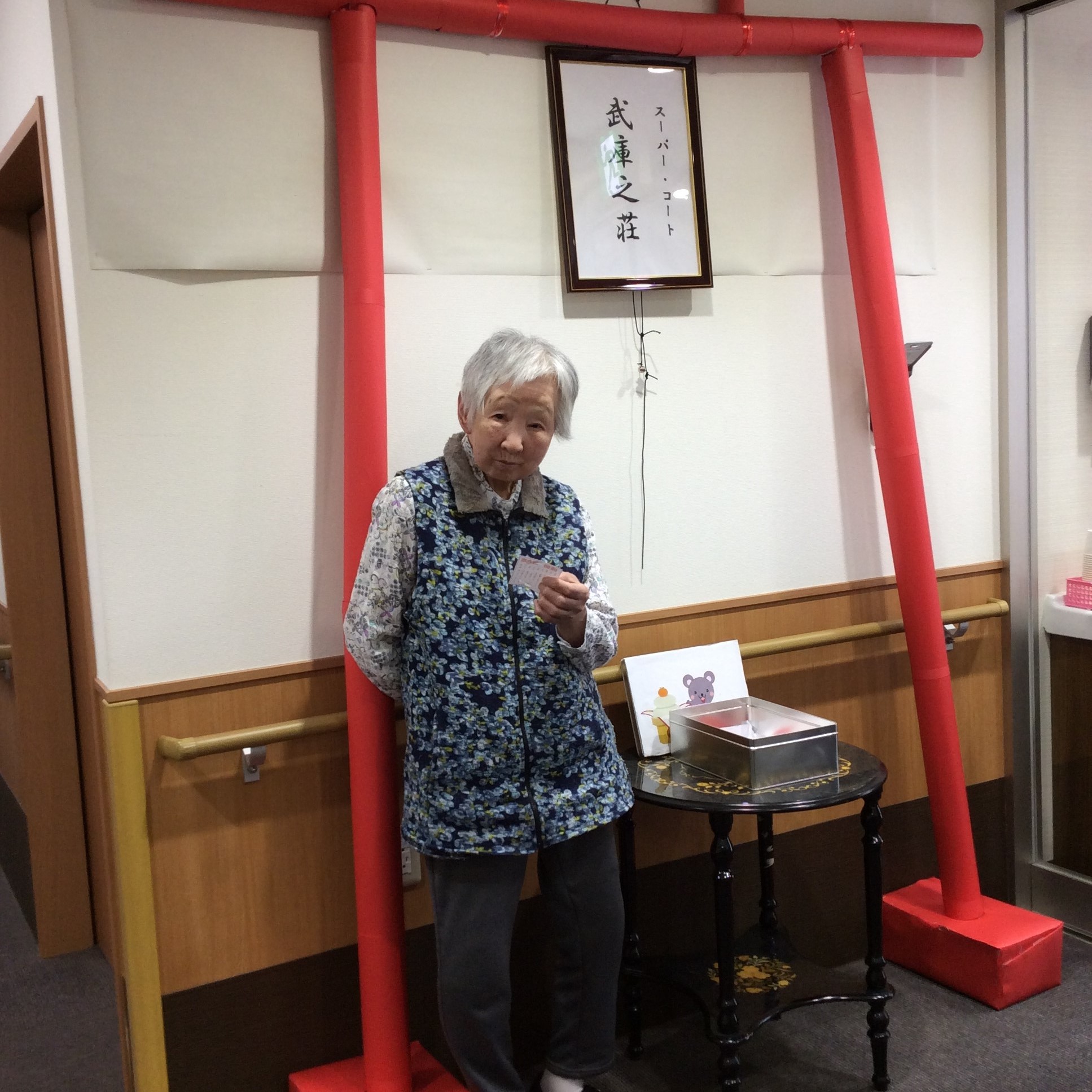 我が武庫之荘の誇る 美術スタッフ制作の赤の鳥居を入居者様に参っていただきました。