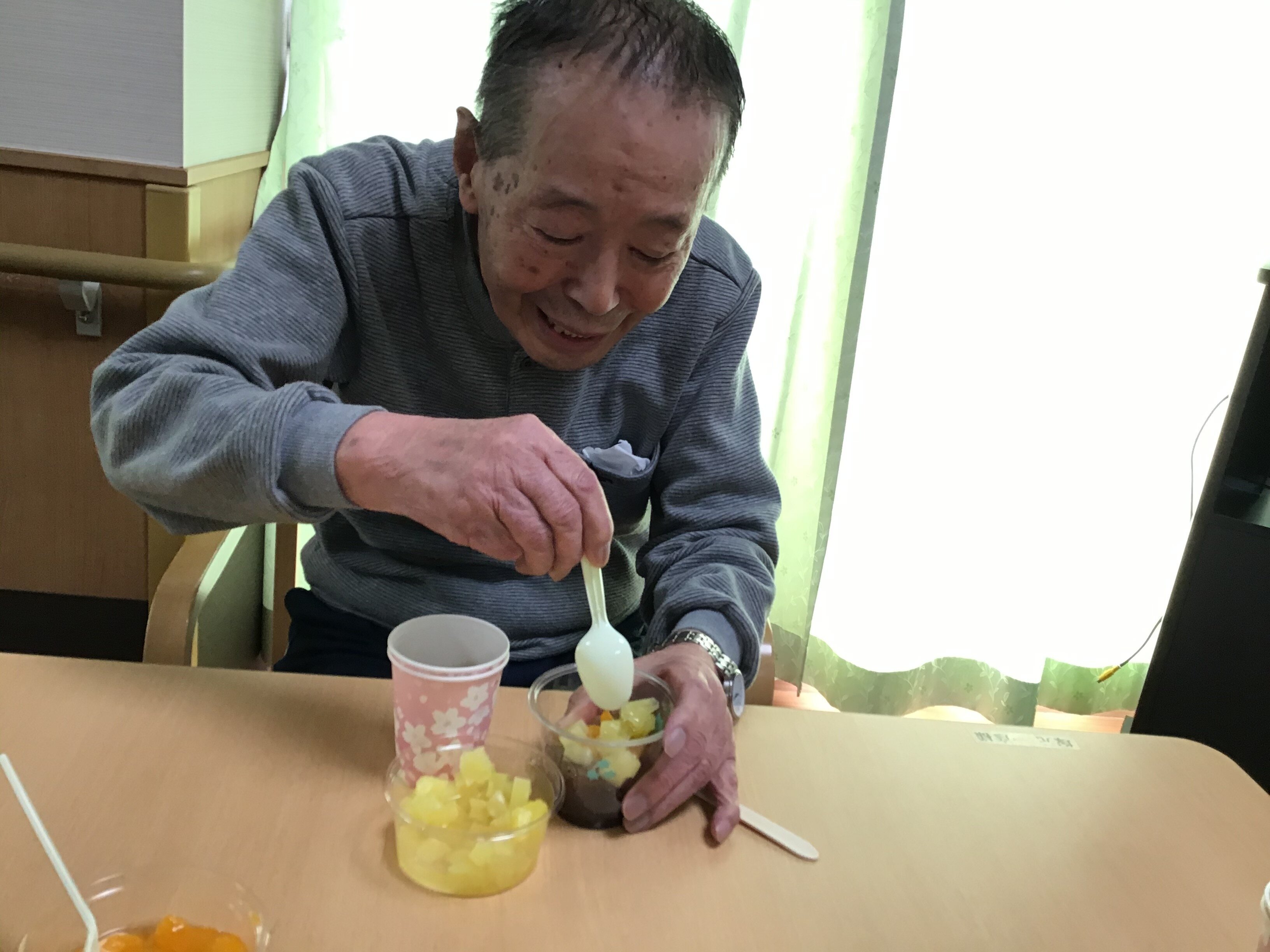 まずは近くのシャトレーゼ様で購入した水羊羹に、生クリームや果物等をトッピングしていただいている時のご様子です(^^)/