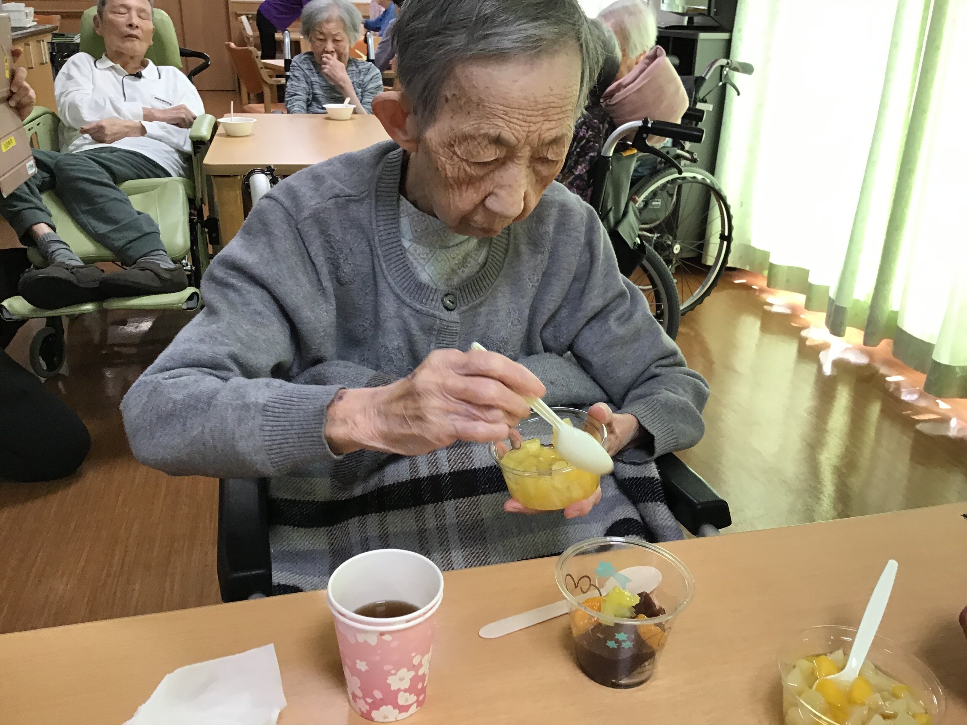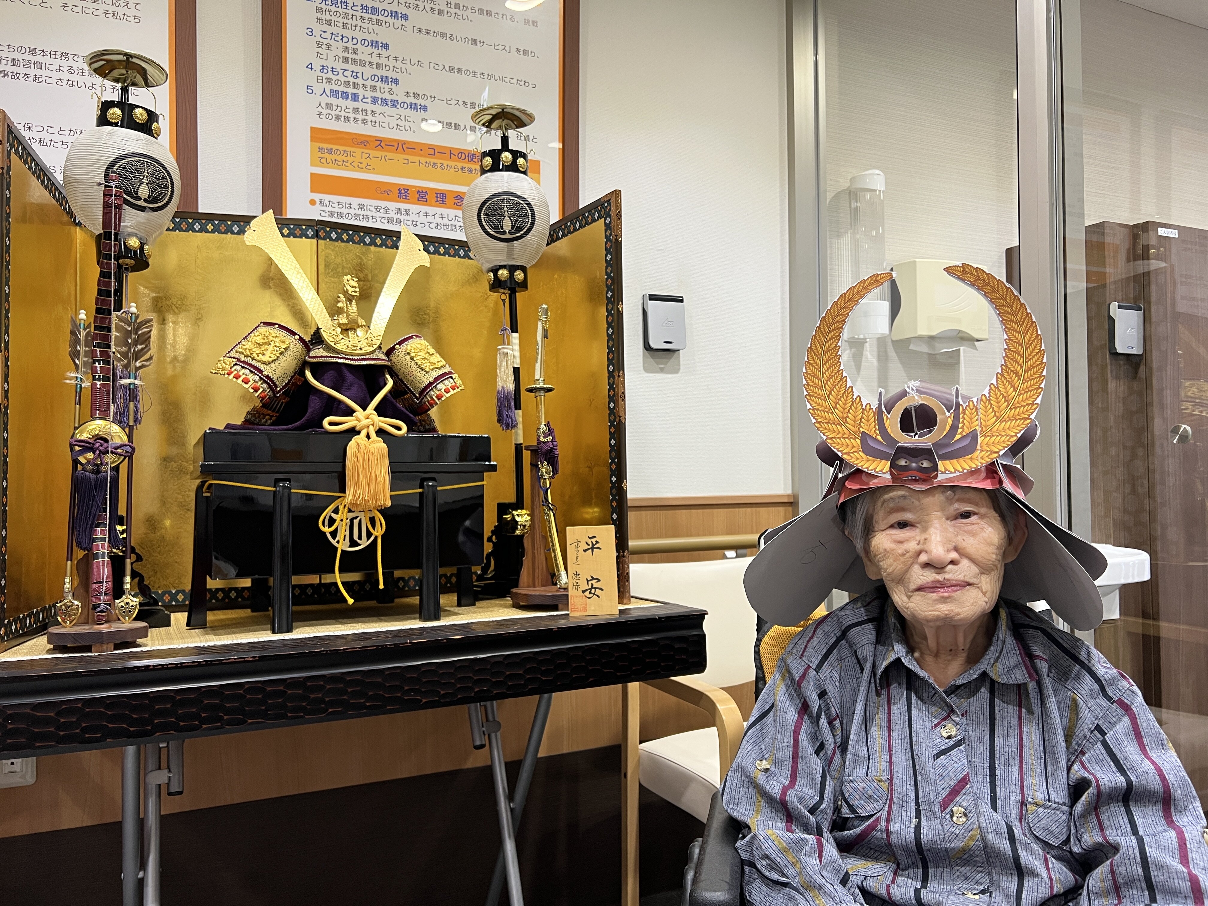 5月は水羊羹に自由にトッピングして頂いたり、施設玄関に飾っている兜や近くのバラ園で写真撮影をしました!!