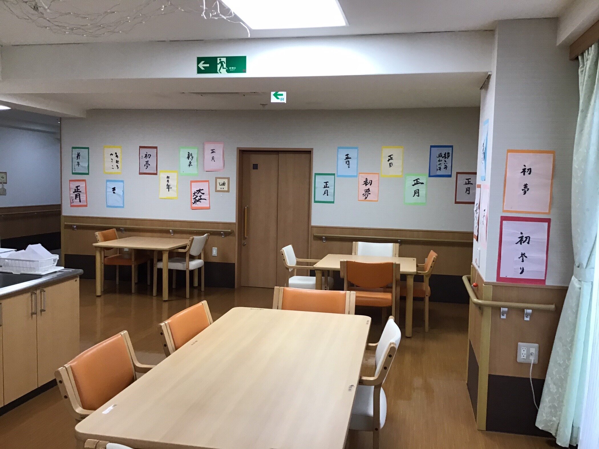 3階食堂の壁を正月レクの書道作品に模様替えしました。