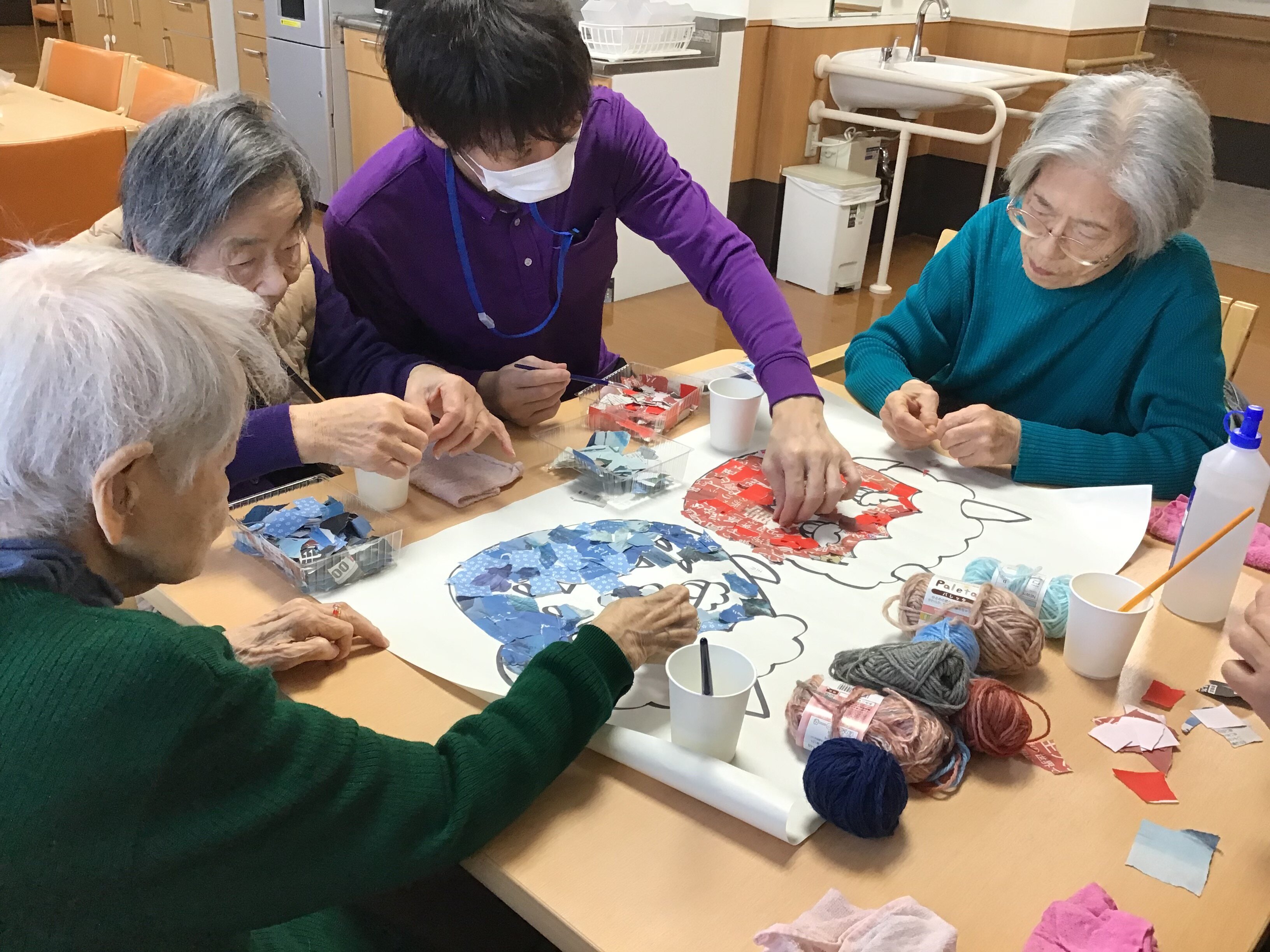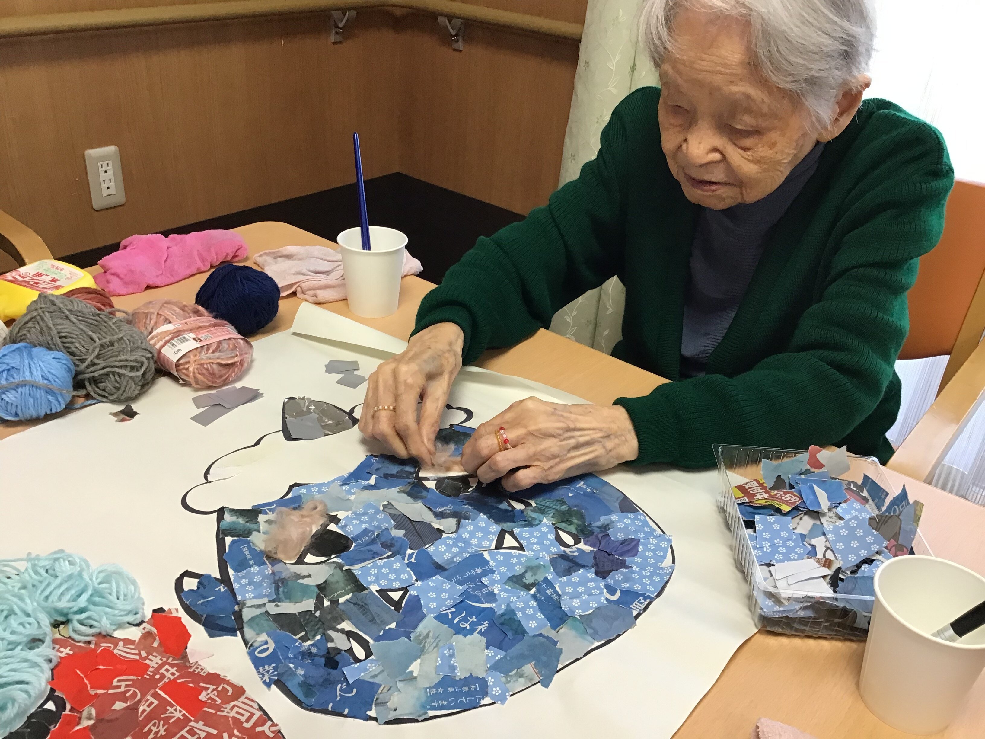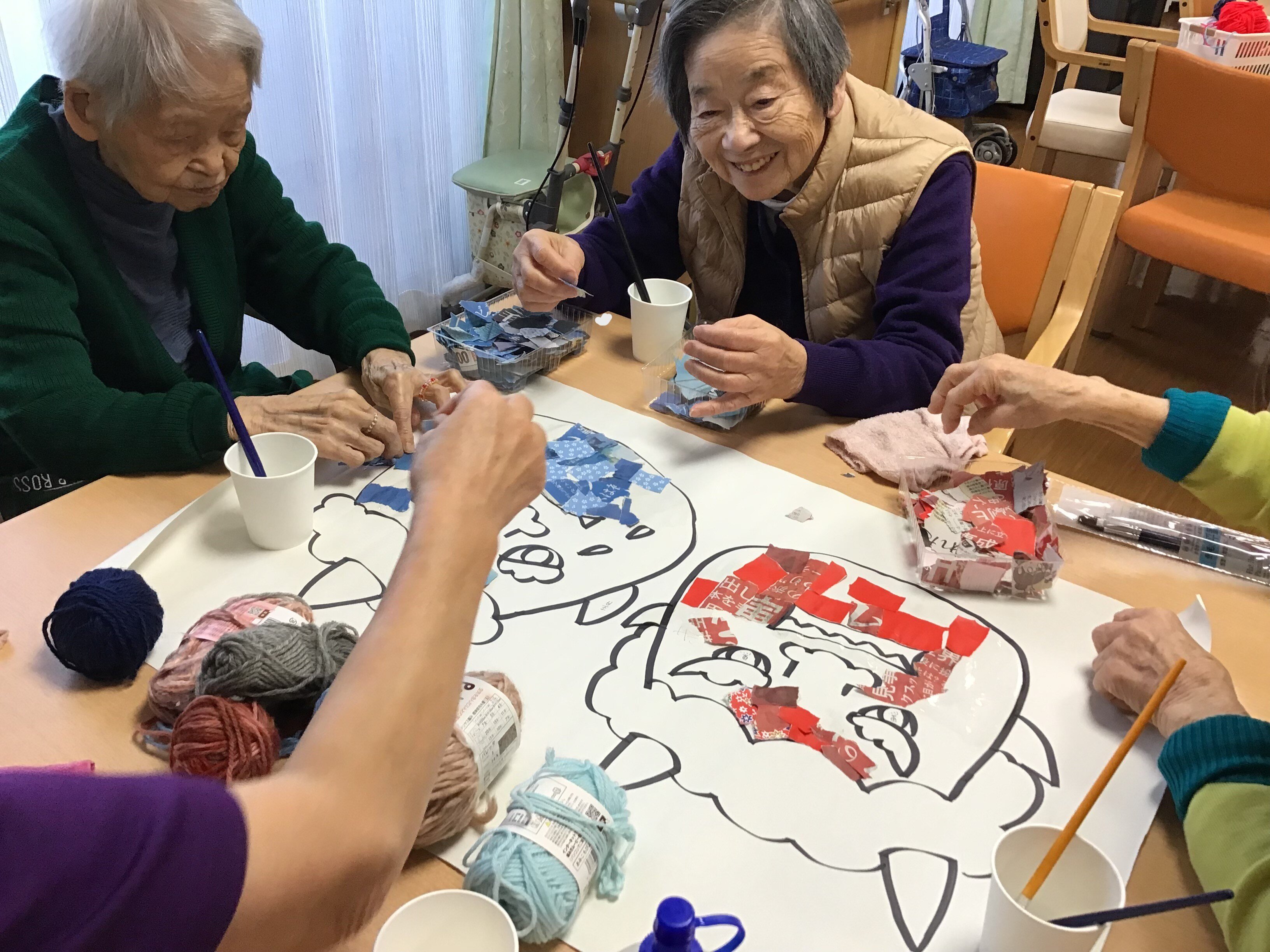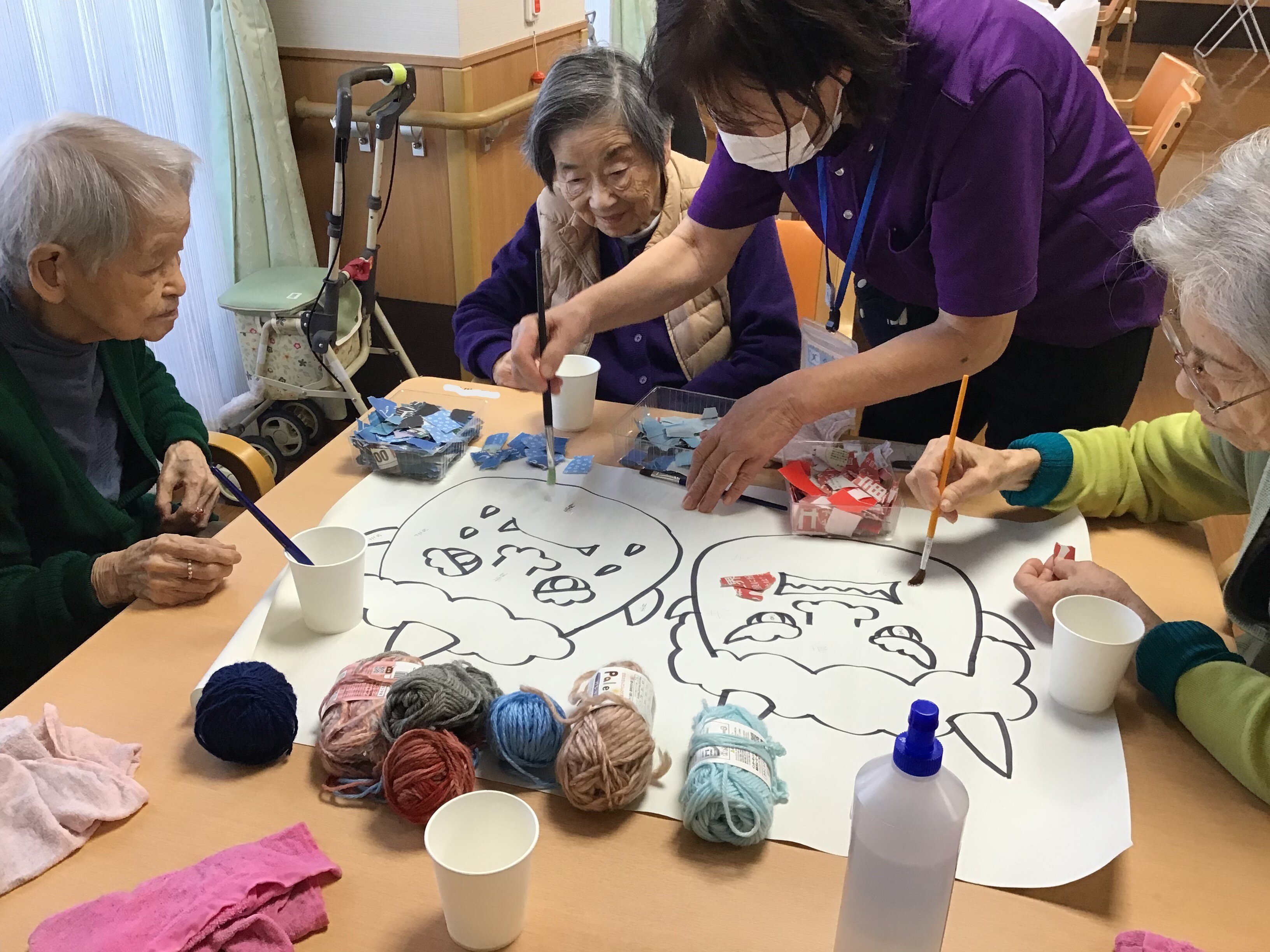 ご入居者と職員で鬼の貼り絵にチャレンジ♬