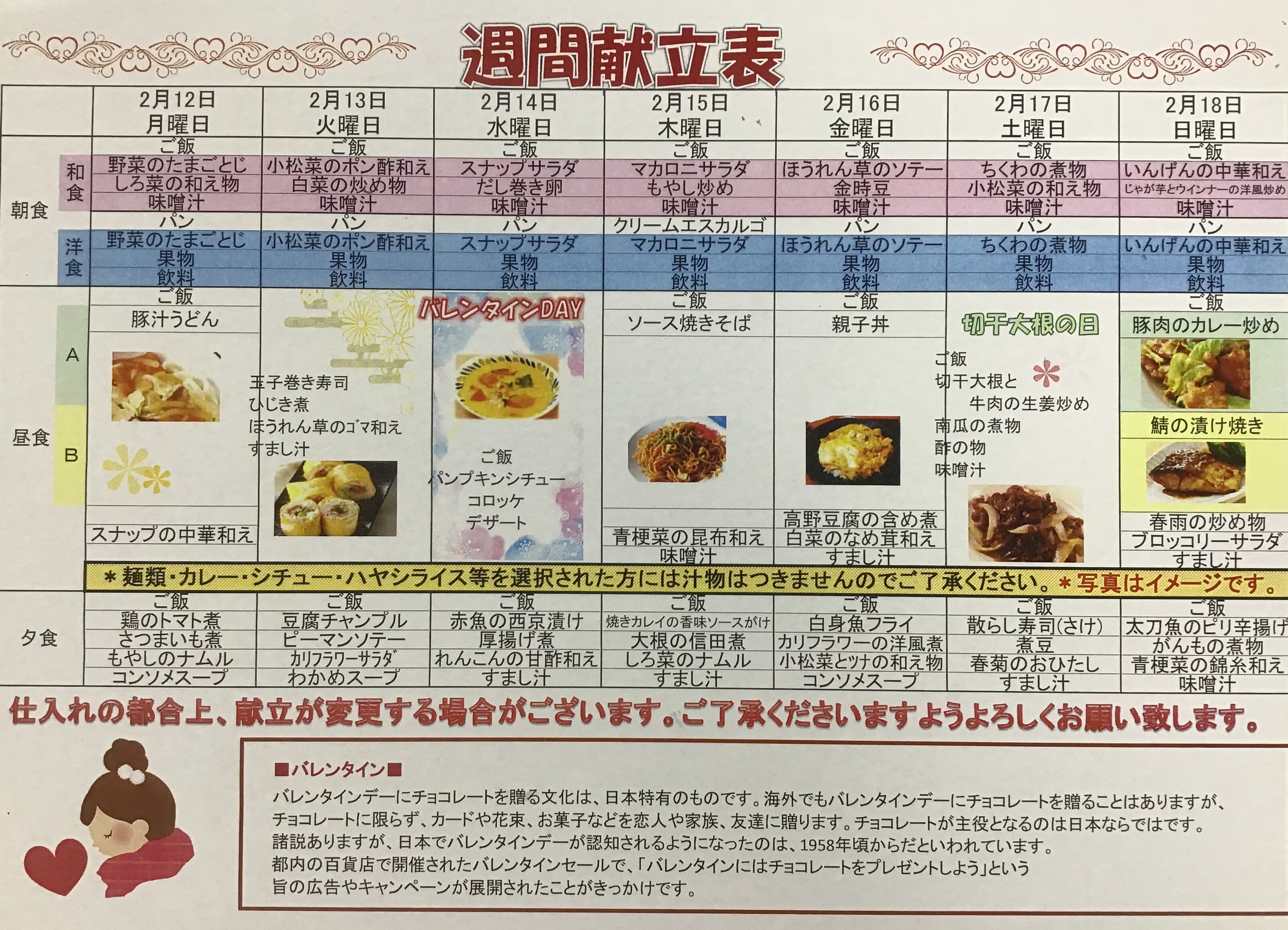今回は2月12日から18日までのメニューを紹介させていただきます♪