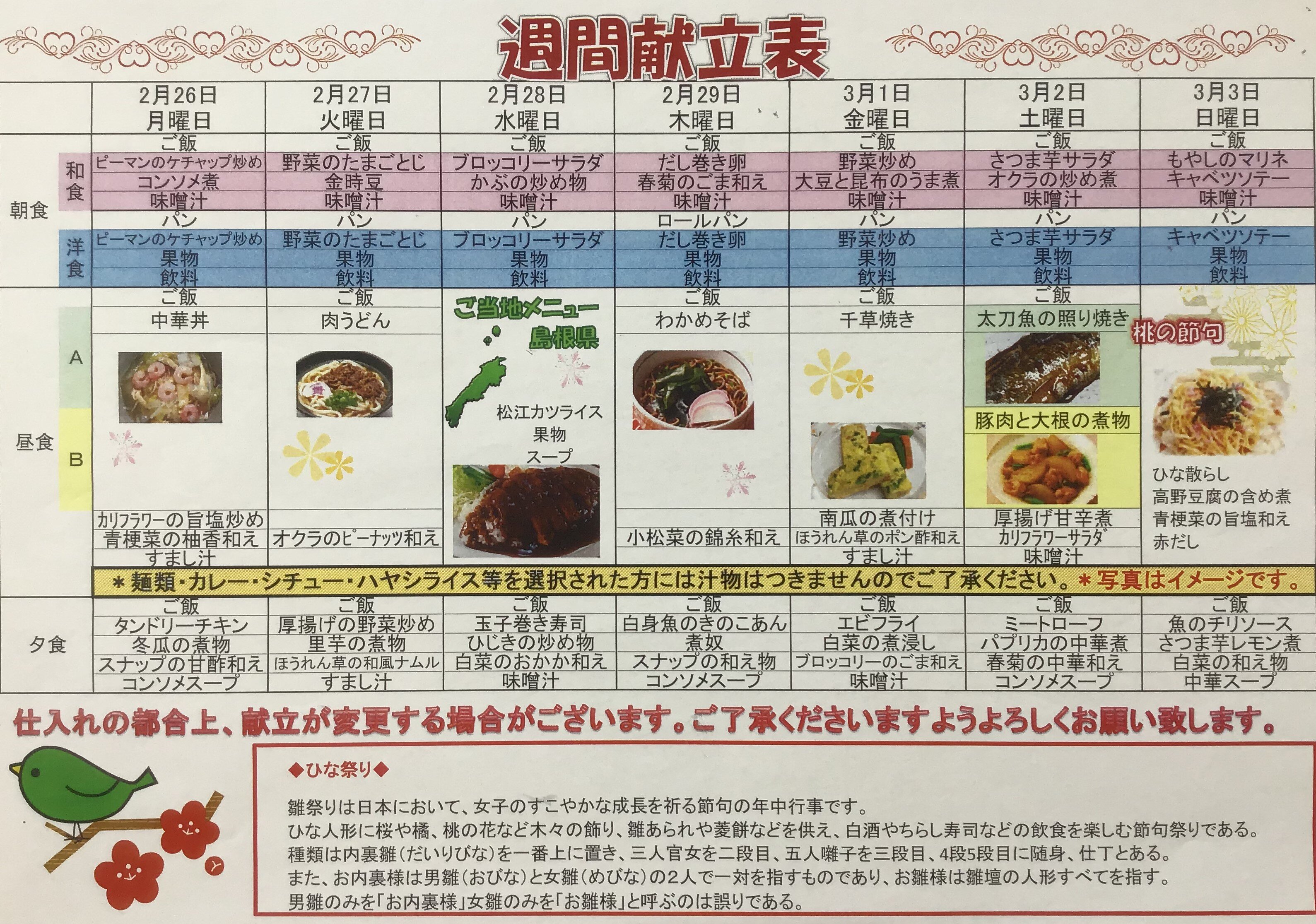 献立表に桃の節句。今年はうるう年ですが、2月はあっという間に感じますね。