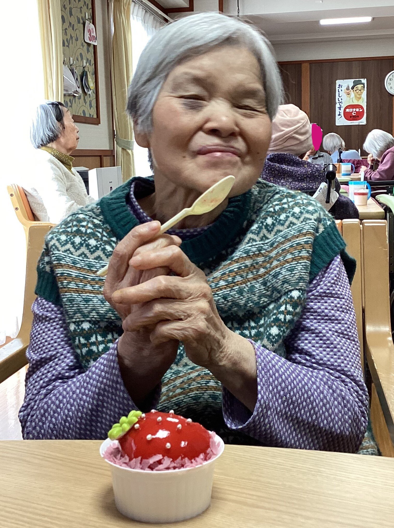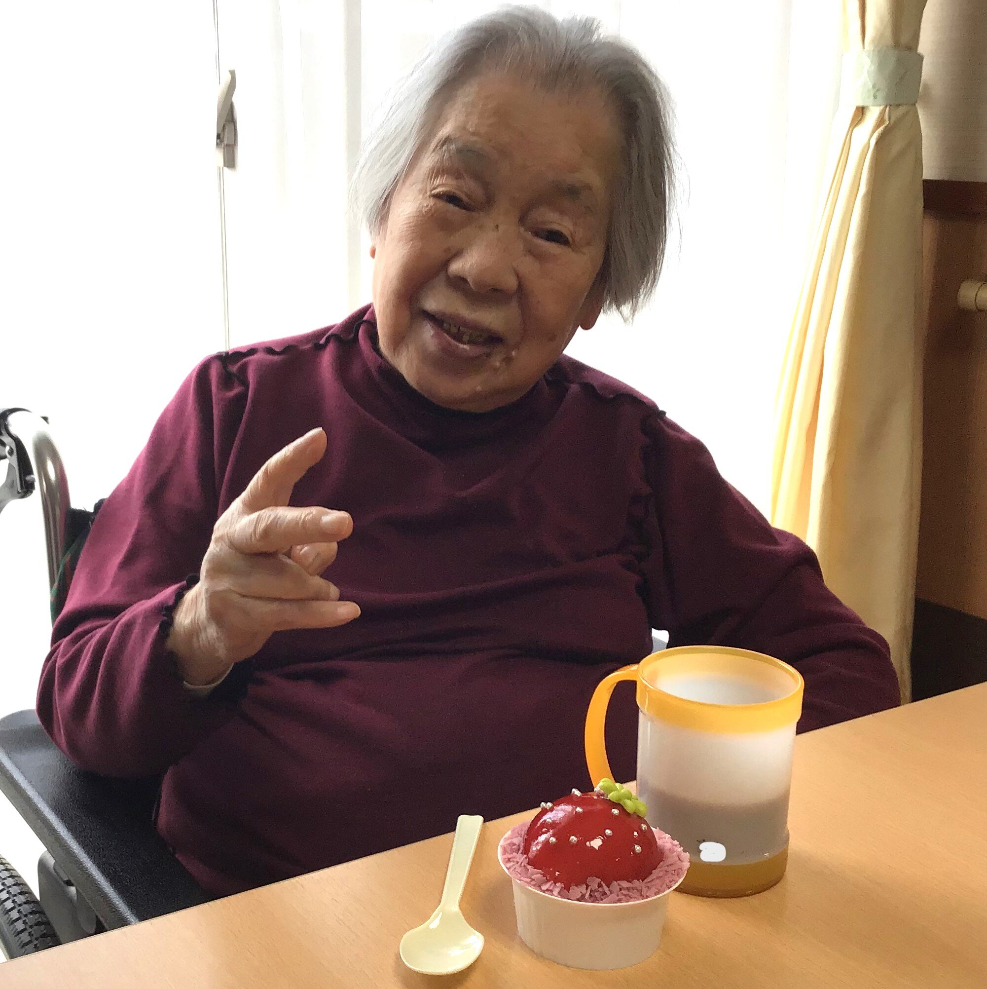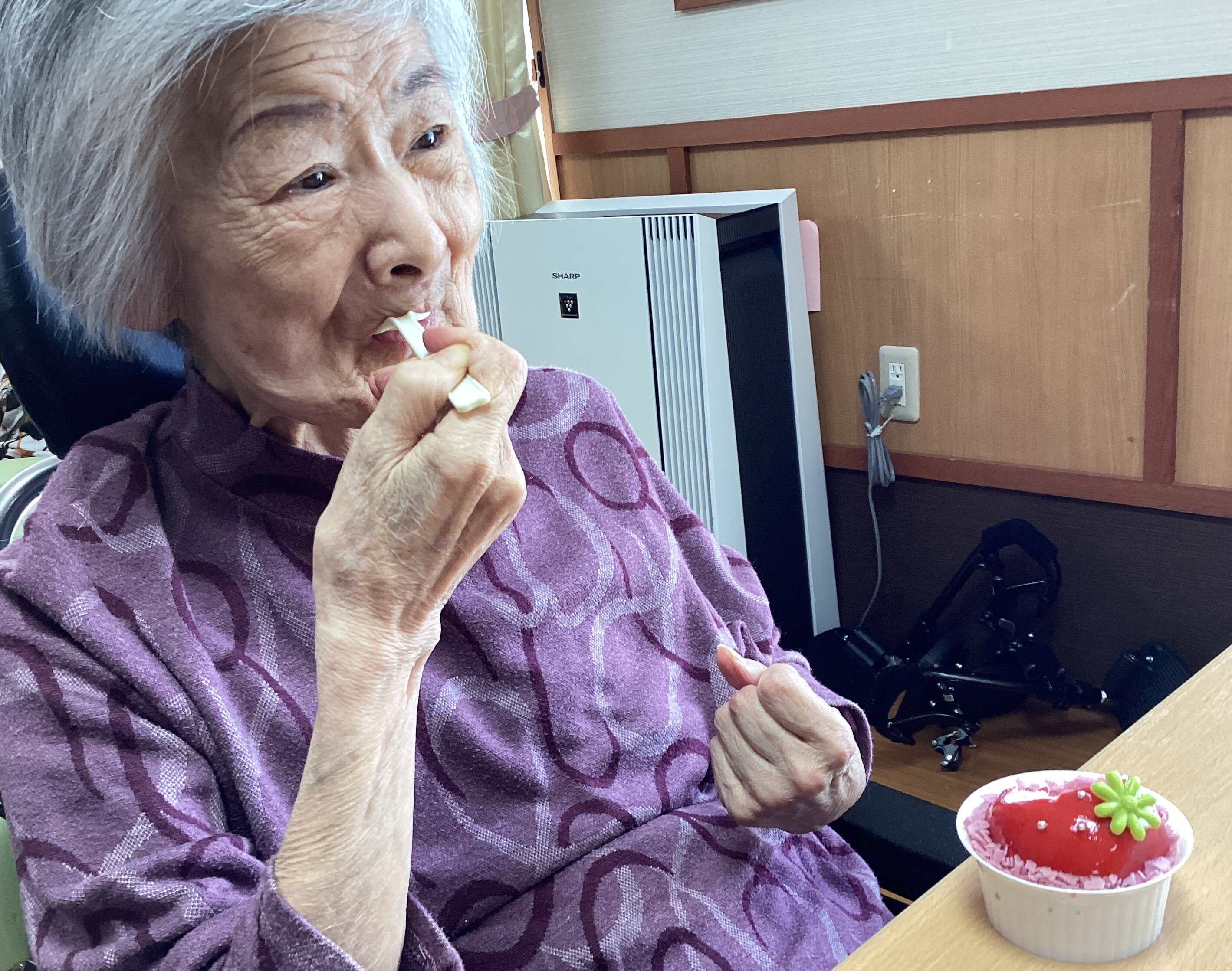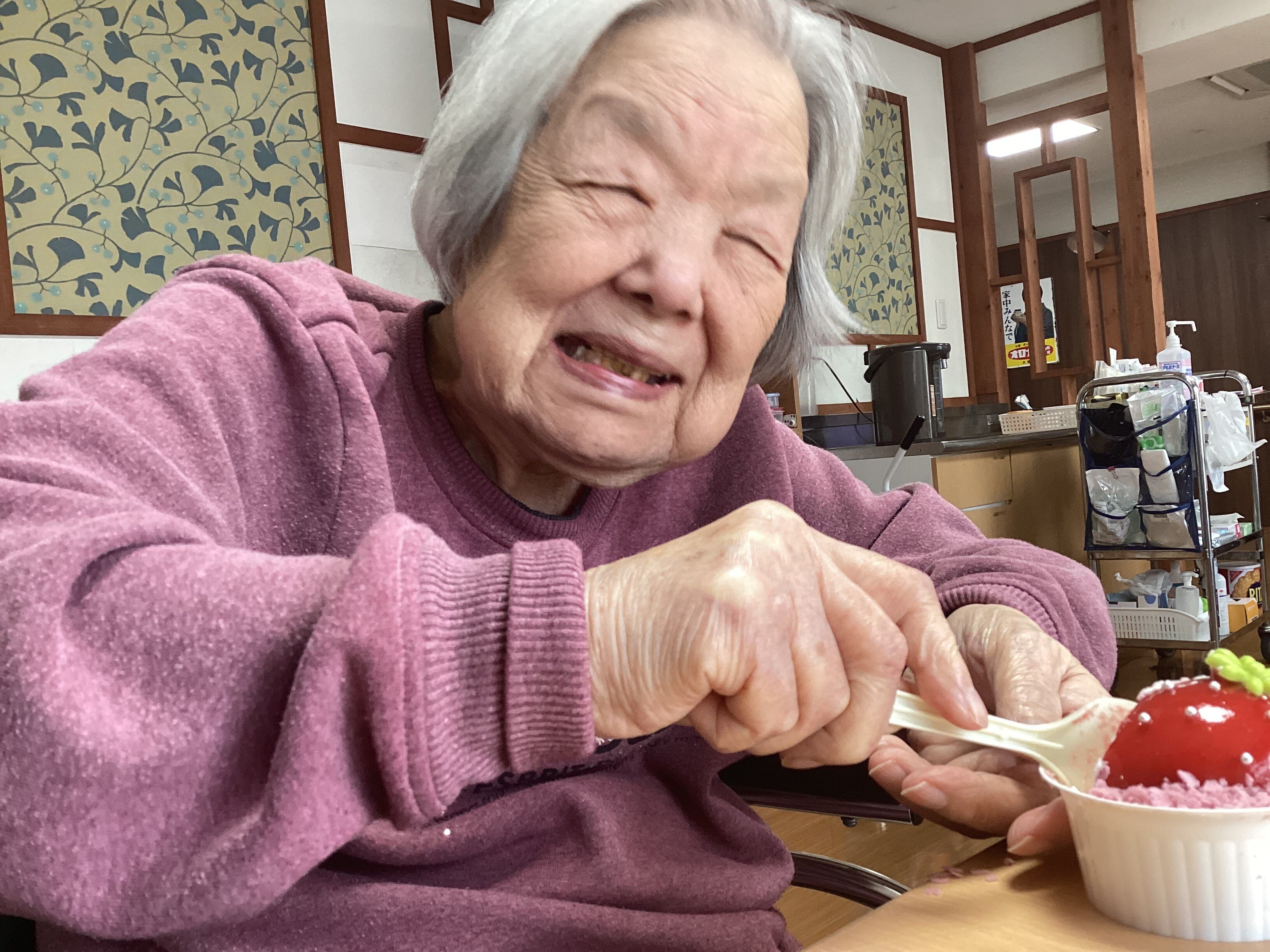 他のご入居者や職員とおしゃべりしながらケーキを食べて楽しい時間を過ごされていました。