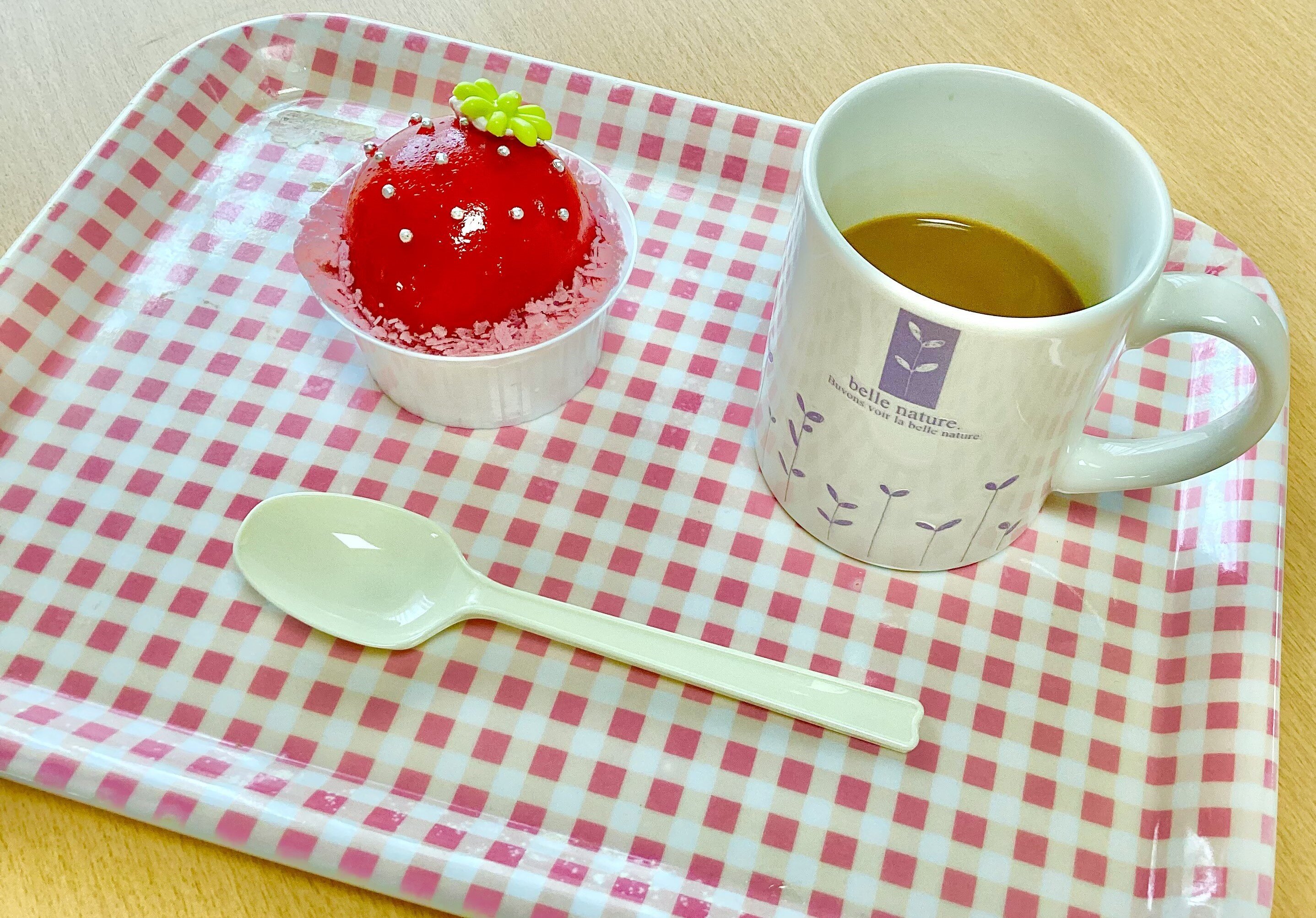 ☆ひな祭りスイーツレクリエーション☆では, かわいいイチゴのケーキとコーヒーを提供させていただきました。