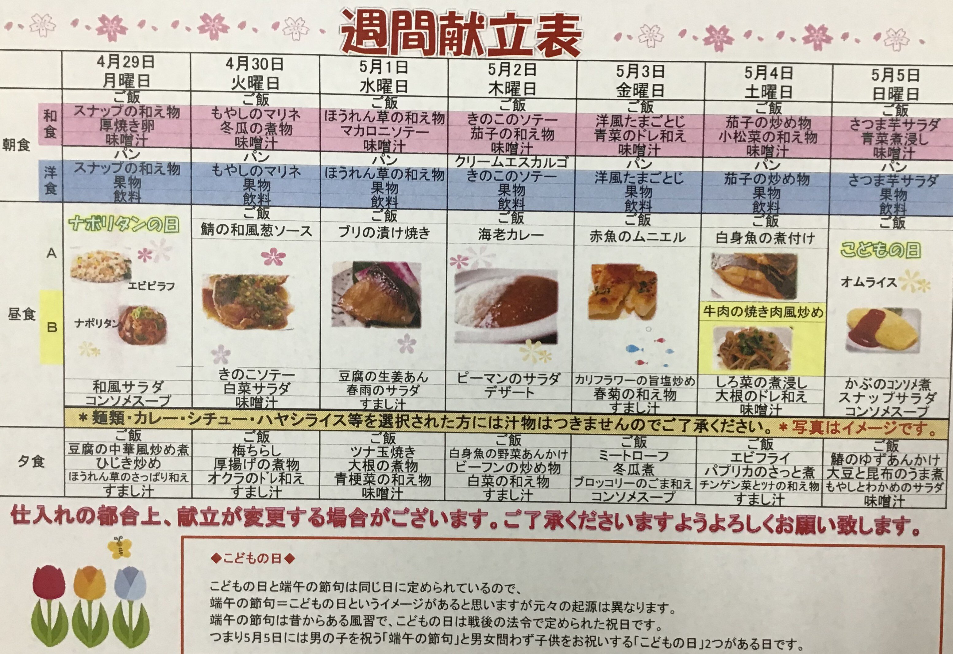 4月29日から5月5日のメニュー表の紹介です。
