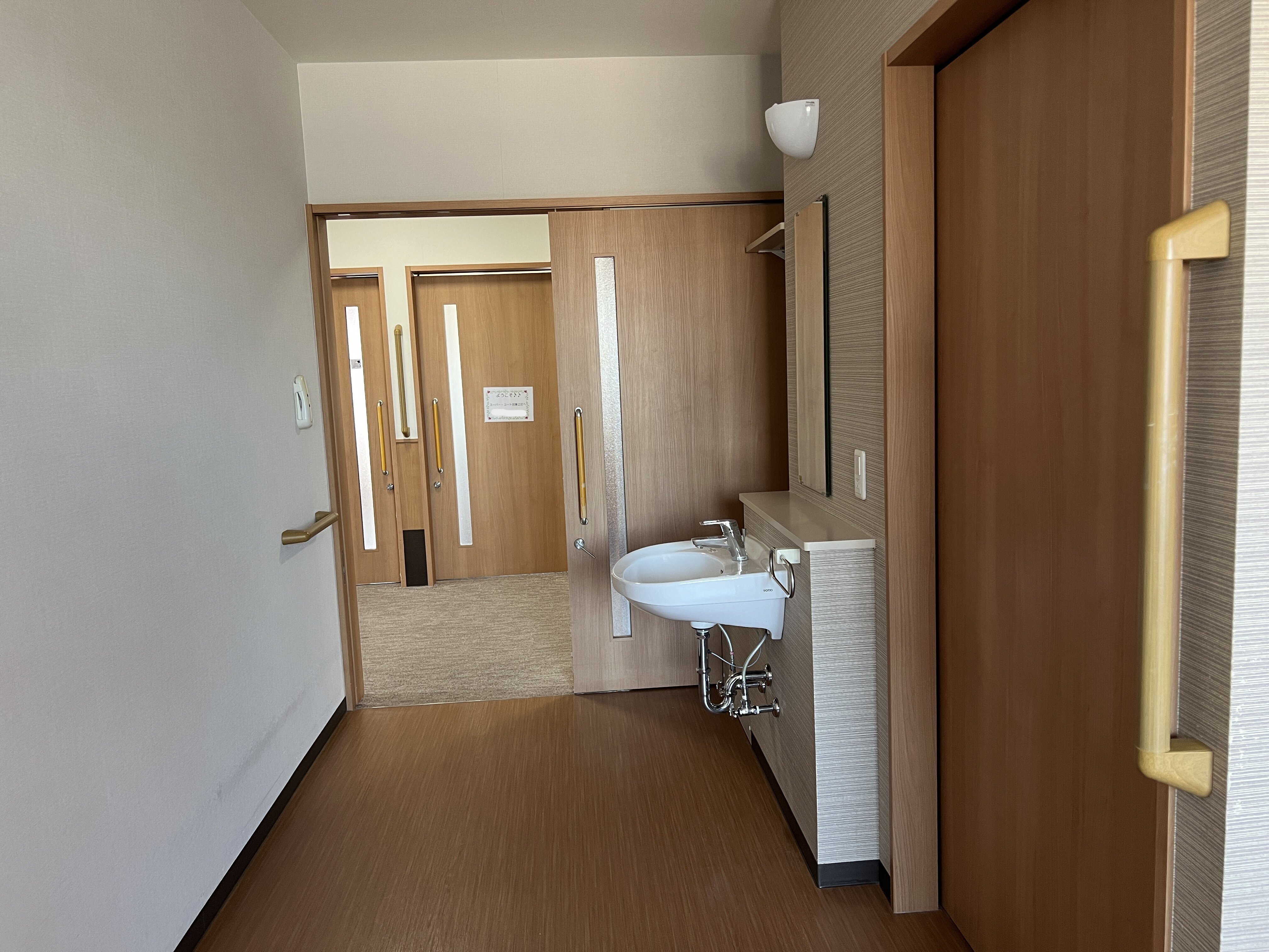 手すりは個室入口付近(写真では左手)とトイレの入り口付近にあります。