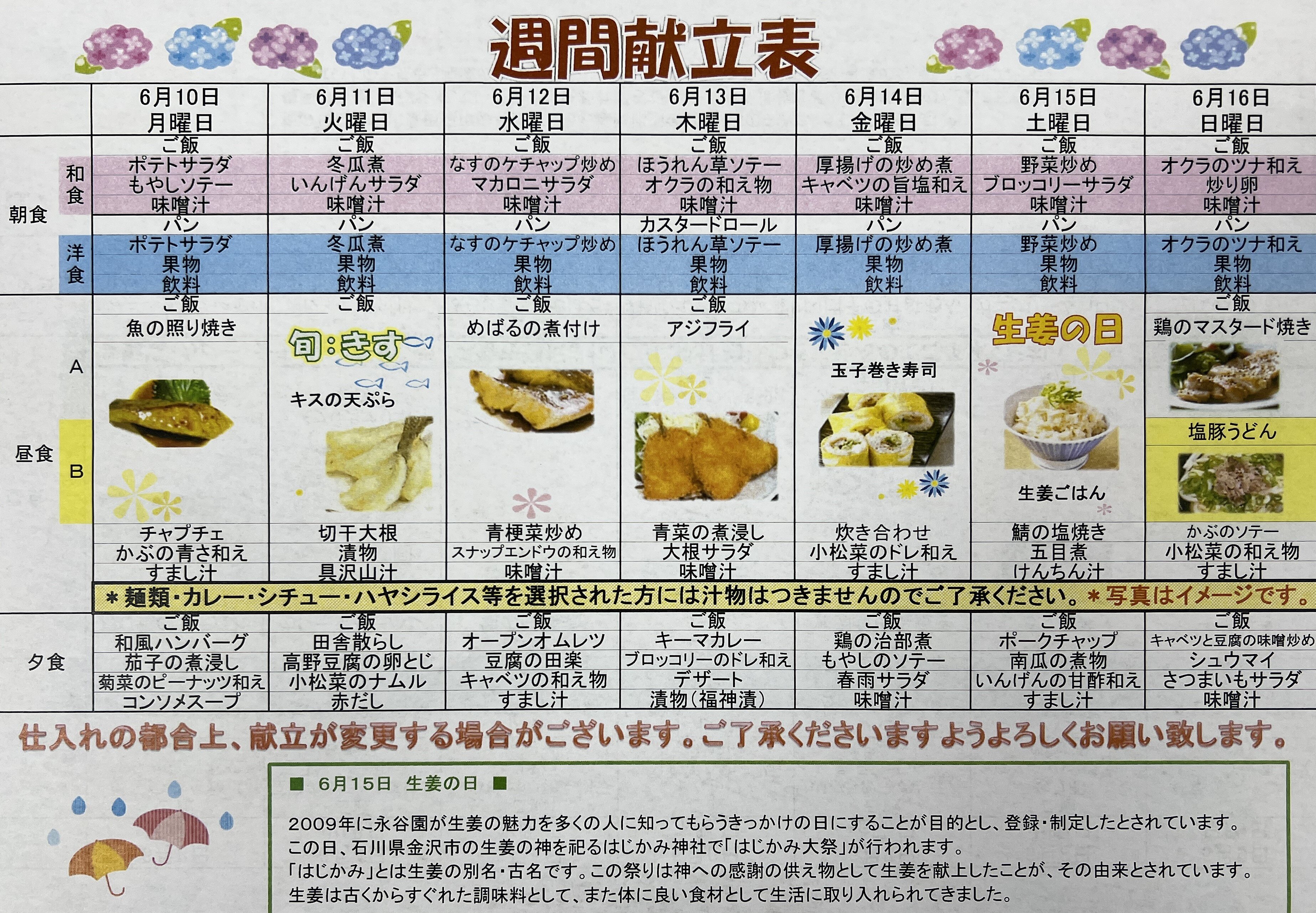 6月10日から16日迄のメニュー表の紹介です。