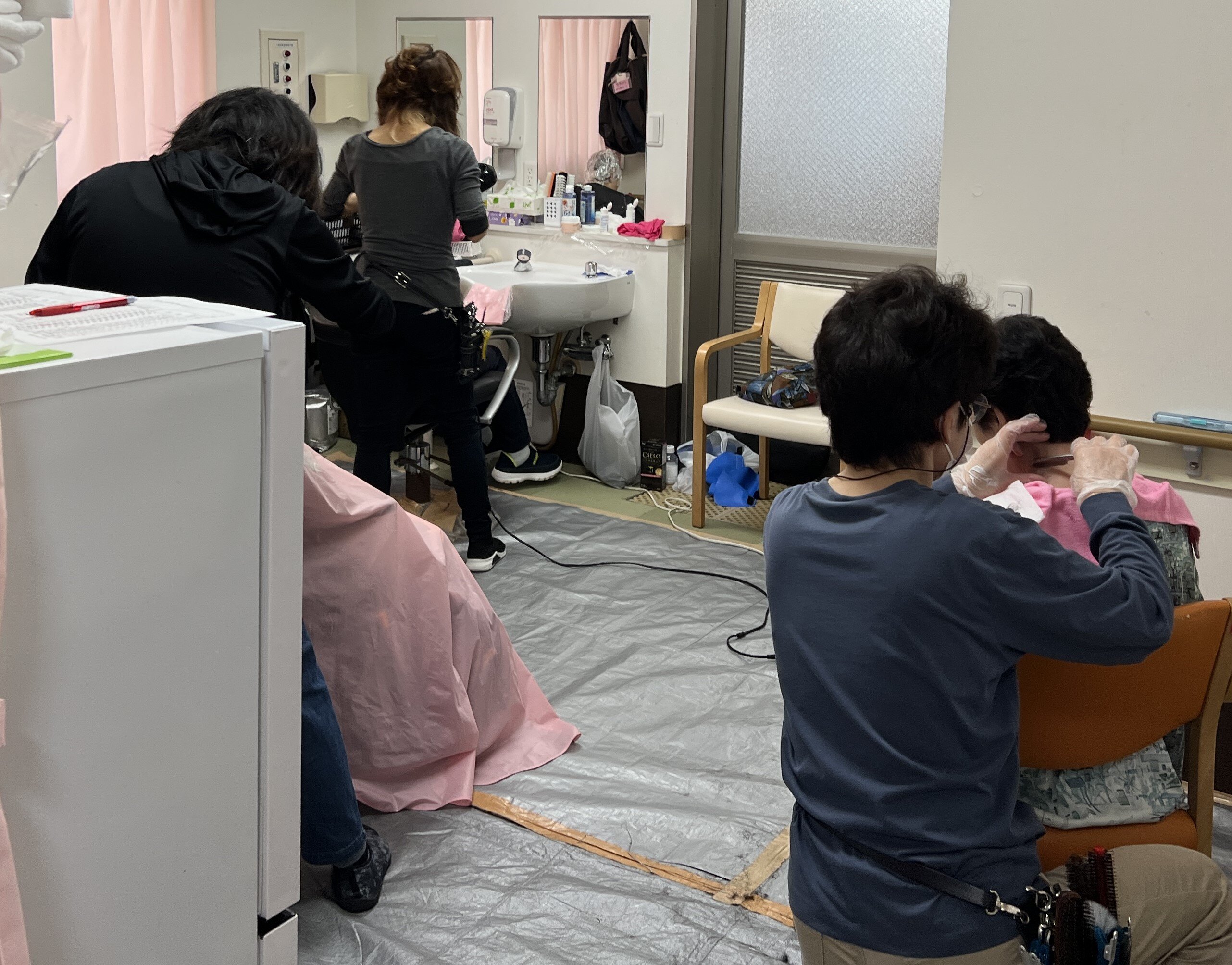 3人の訪問美容師さんが、手際よく散髪をされていました。
