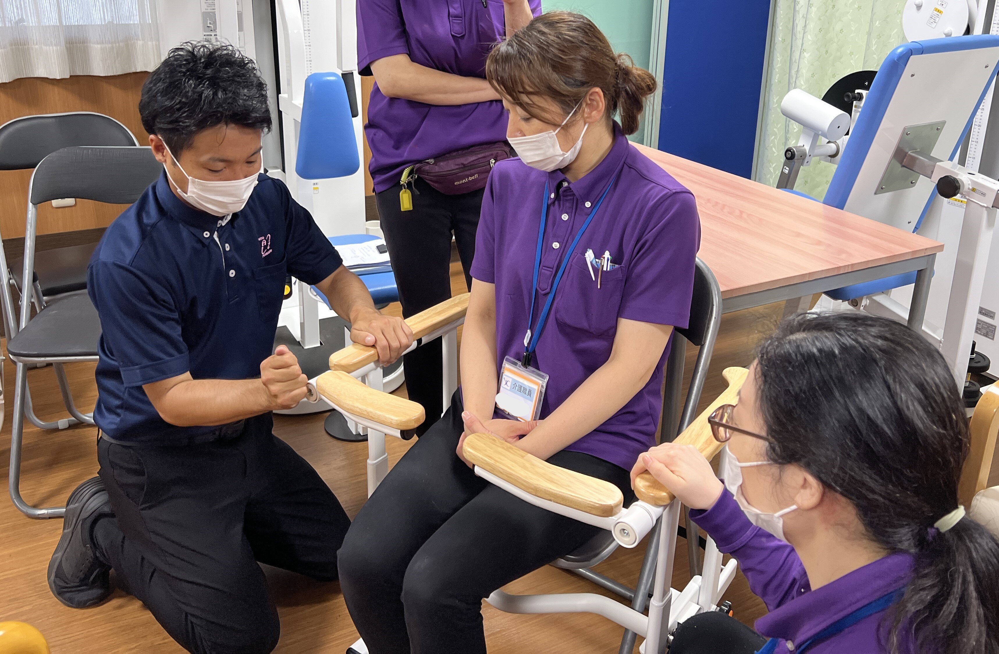 座った状態での前方への転倒防止のメカニズムを学んでいる様子。