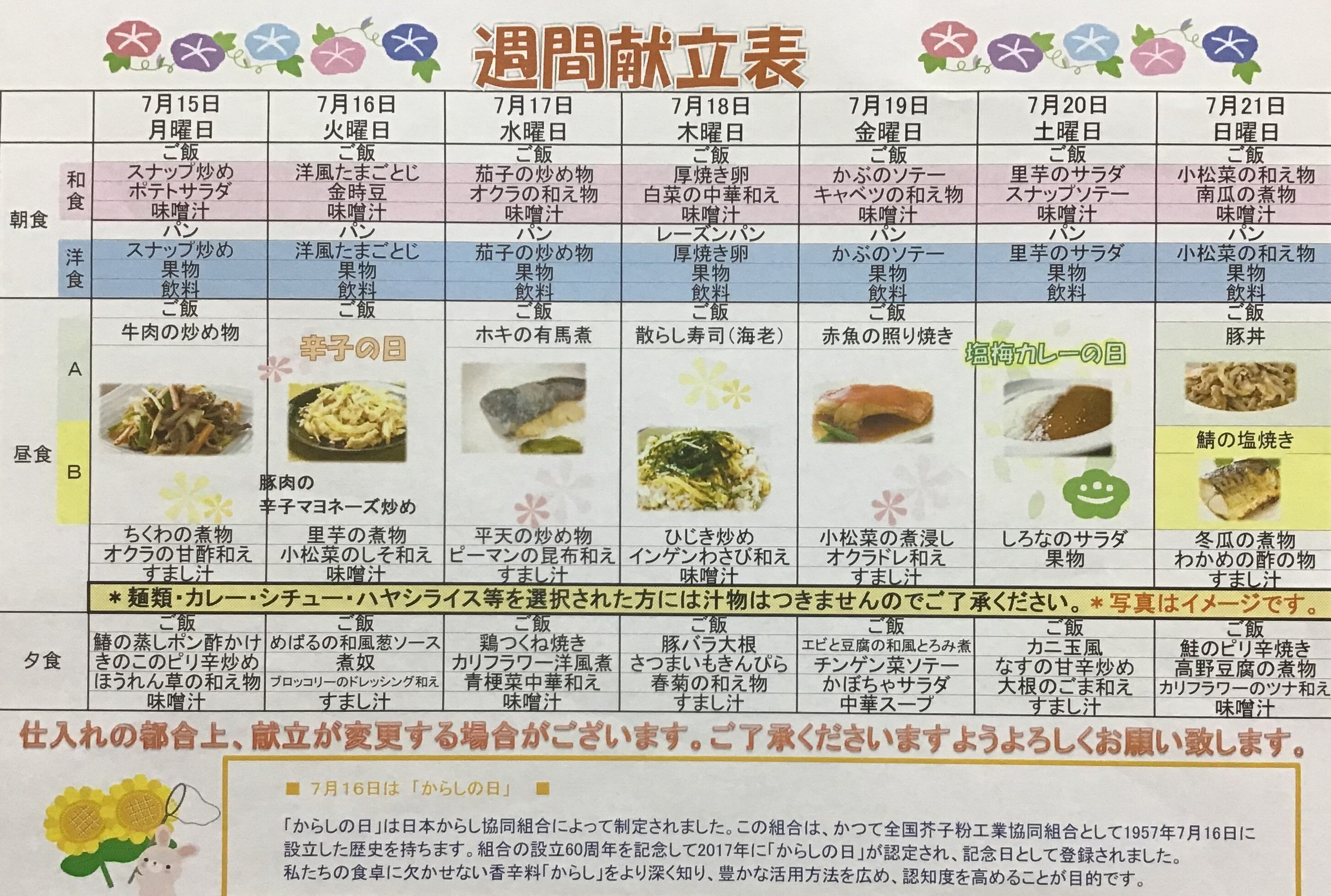 「7月15日から21日までのメニュー表の紹介」です。