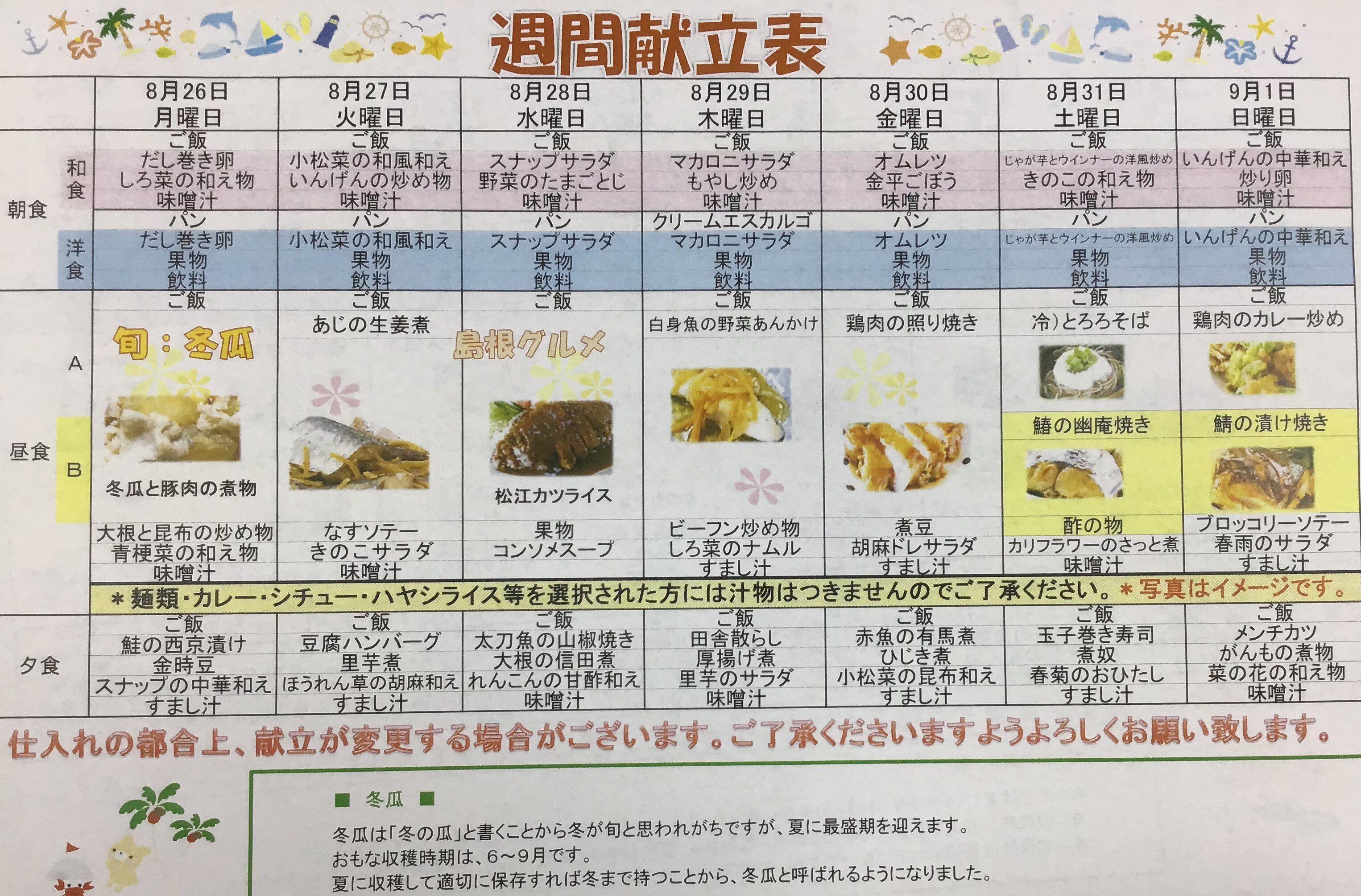 今回は「8月26日から9月1日までのメニュー表の紹介」です。