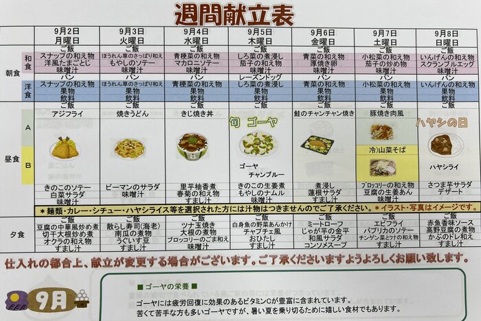 今回は「9月2日から9月8日までのメニュー表の紹介」です。