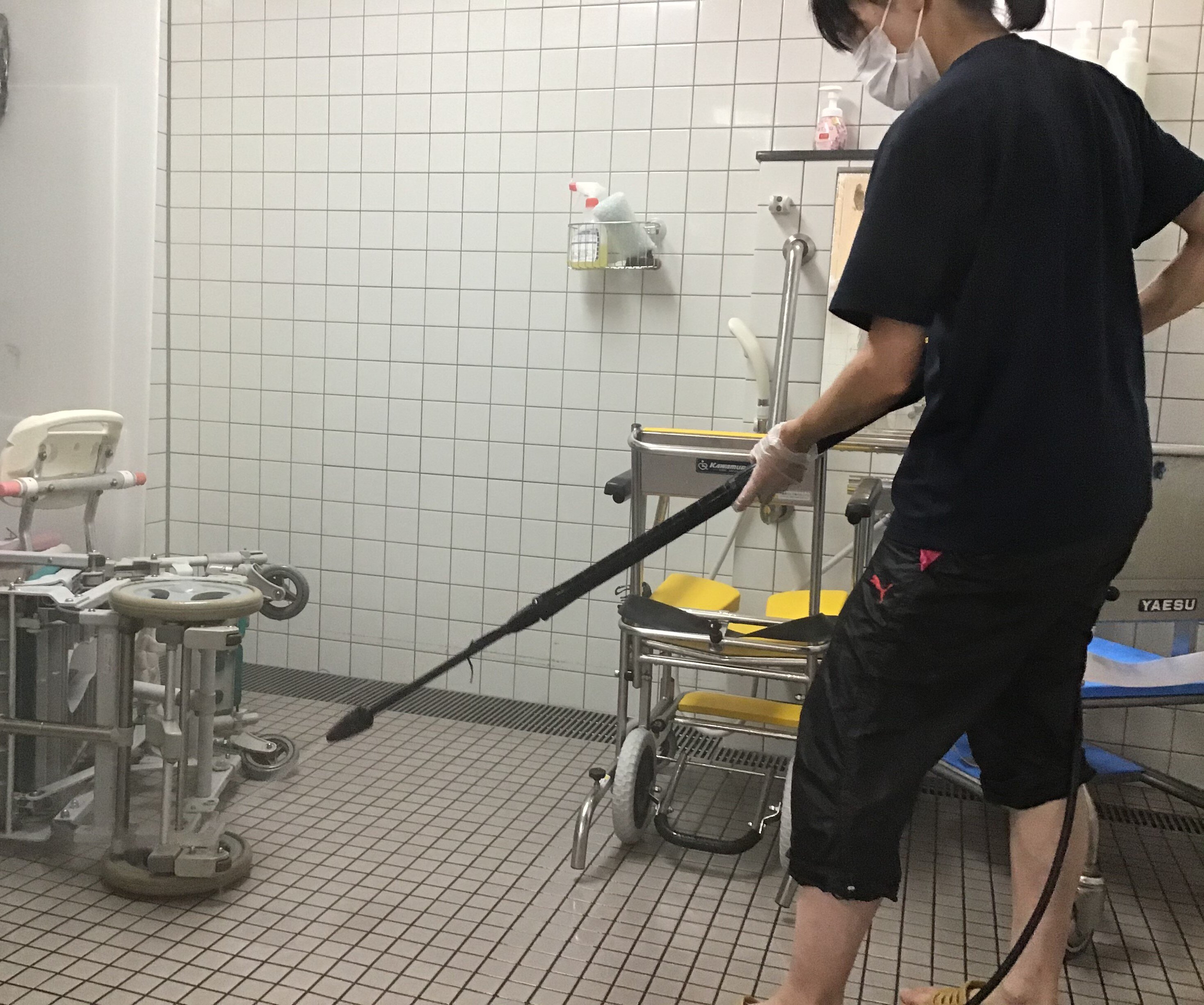 職員も夏場はお風呂の介助・掃除をこなすと汗だくになりますが