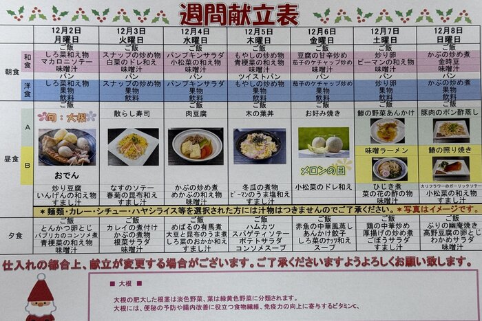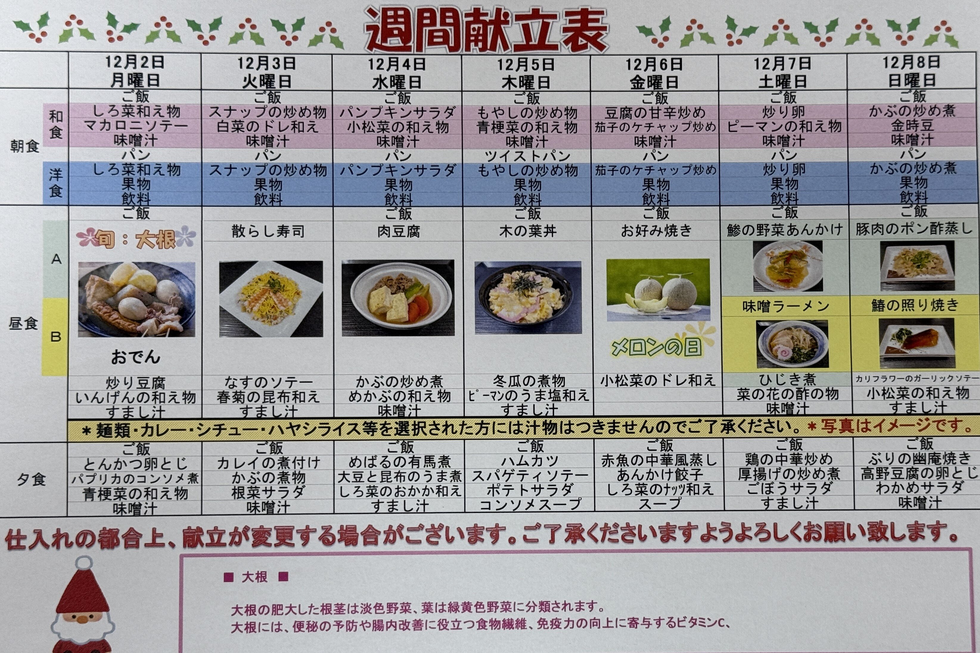 今回は「12月2日から12月8日までのメニュー表の紹介」です。