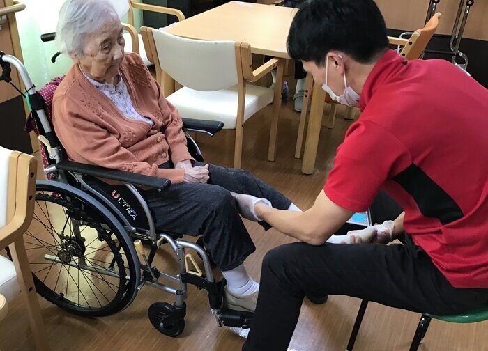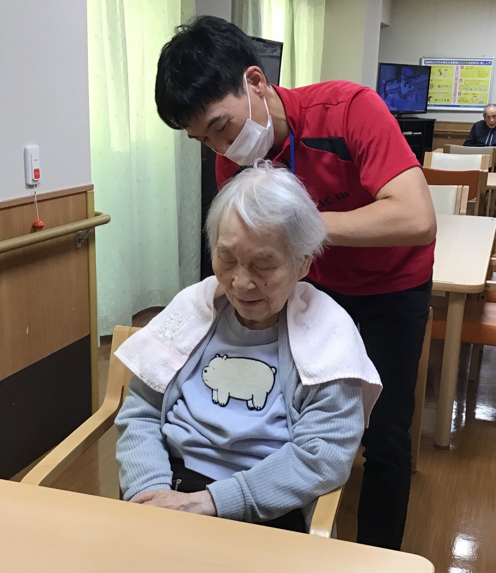 まずは、ご入居者と会話を交えながらマッサージをおこなっている様子をご紹介。