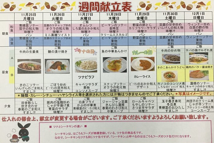 今回は「11月25日から12月1日までのメニュー表の紹介」です。