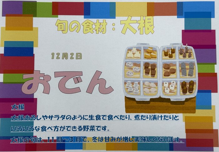 今回は12月13日(金)提供予定の「ごちそうメニュー」のお知らせです。