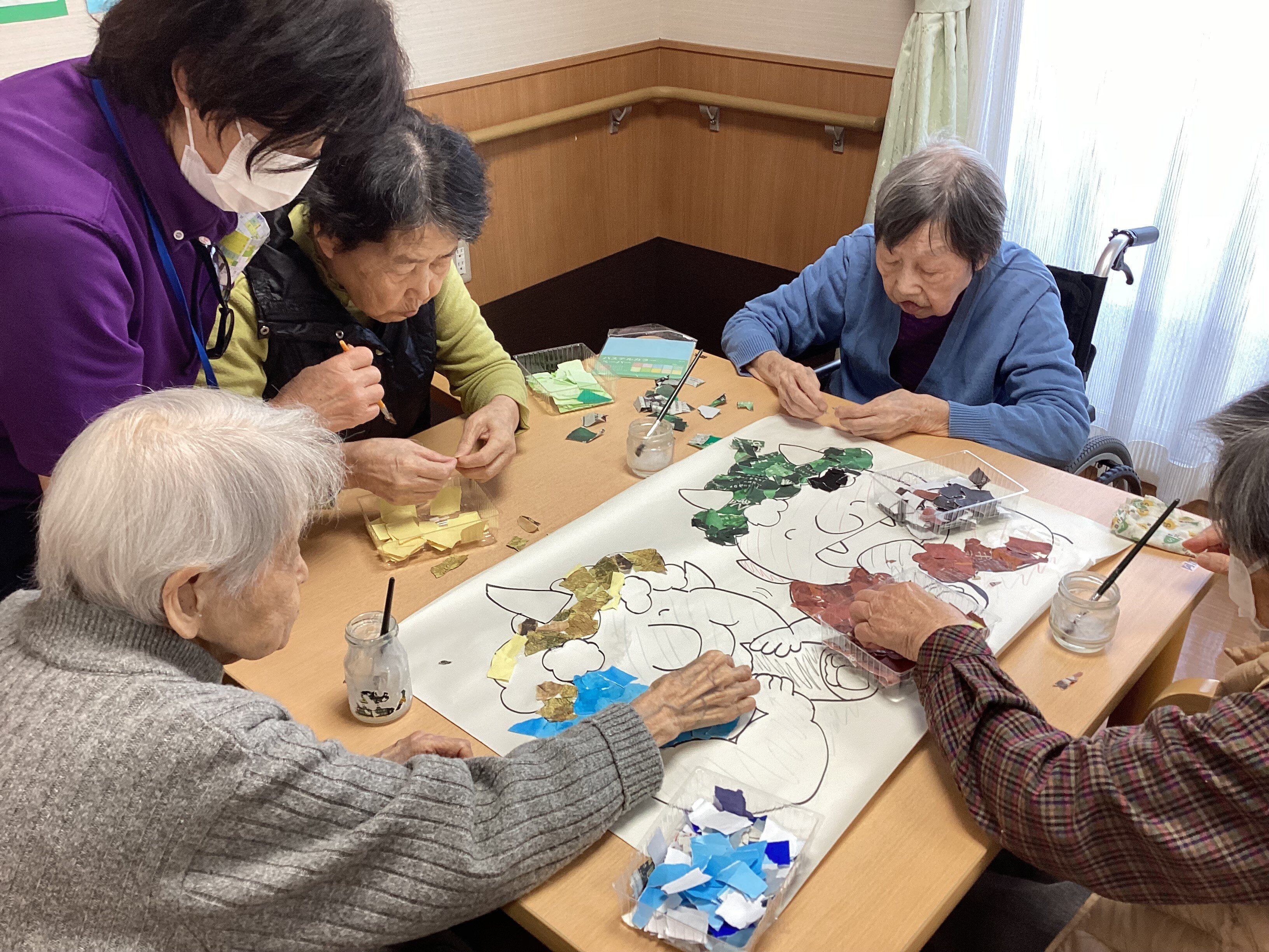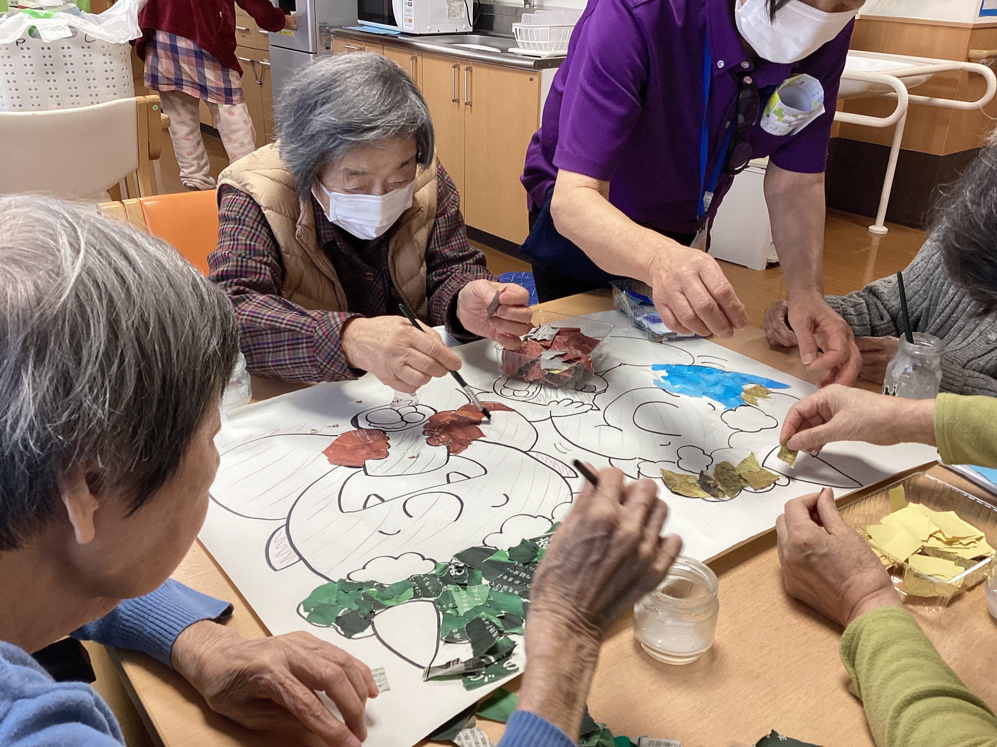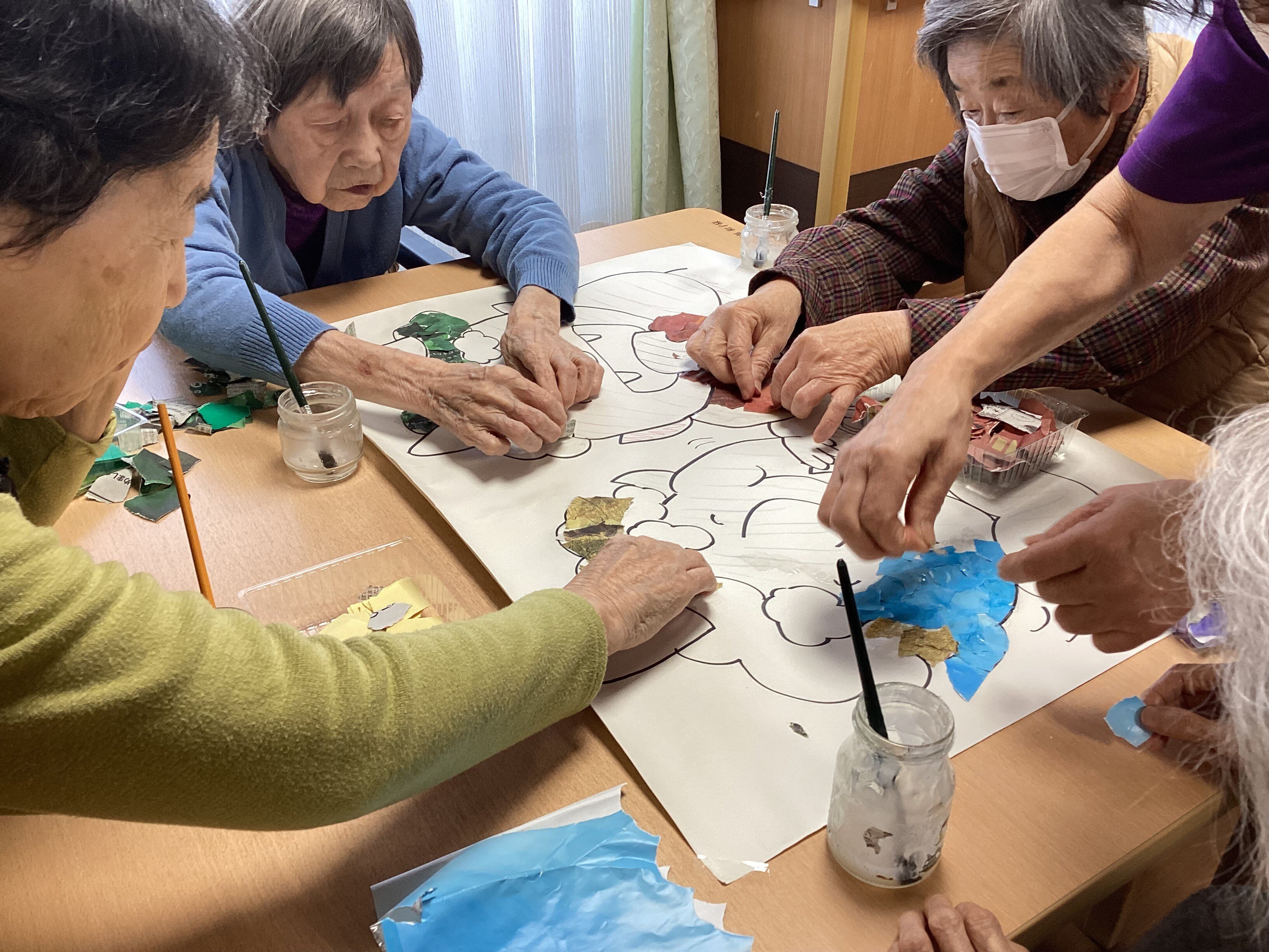 千切った色紙を貼って絵にする事は手指を動かすだけでなく脳トレにもなります。