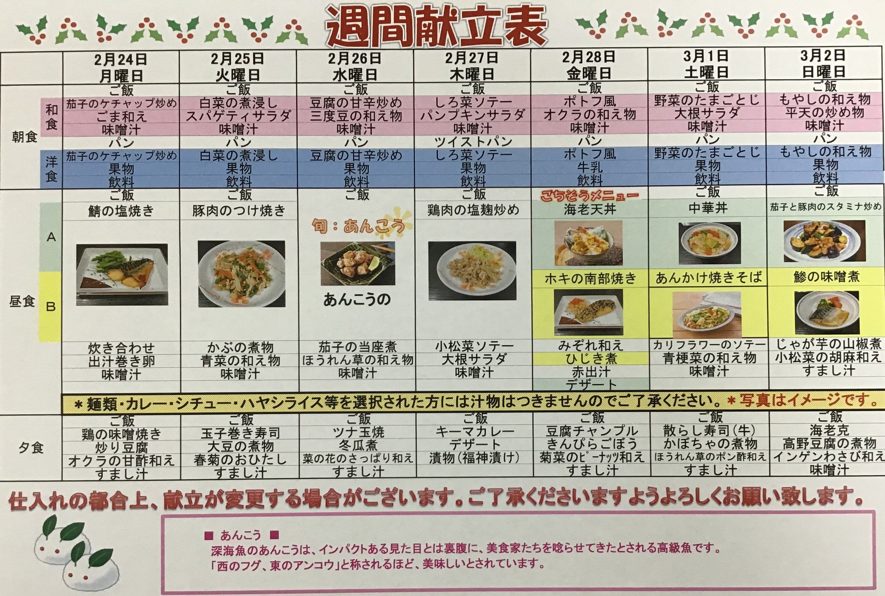 今回は「2月24日から3月2日までのメニュー表の紹介」です。