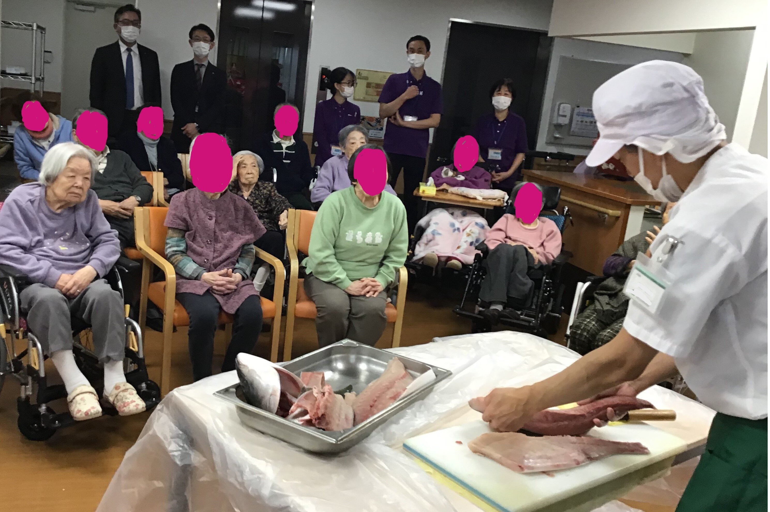 ブリの解体ショーは3階と4階でお昼の時間に開催しました。(2階のご入居者は3階と4階で見ていただきました。)
