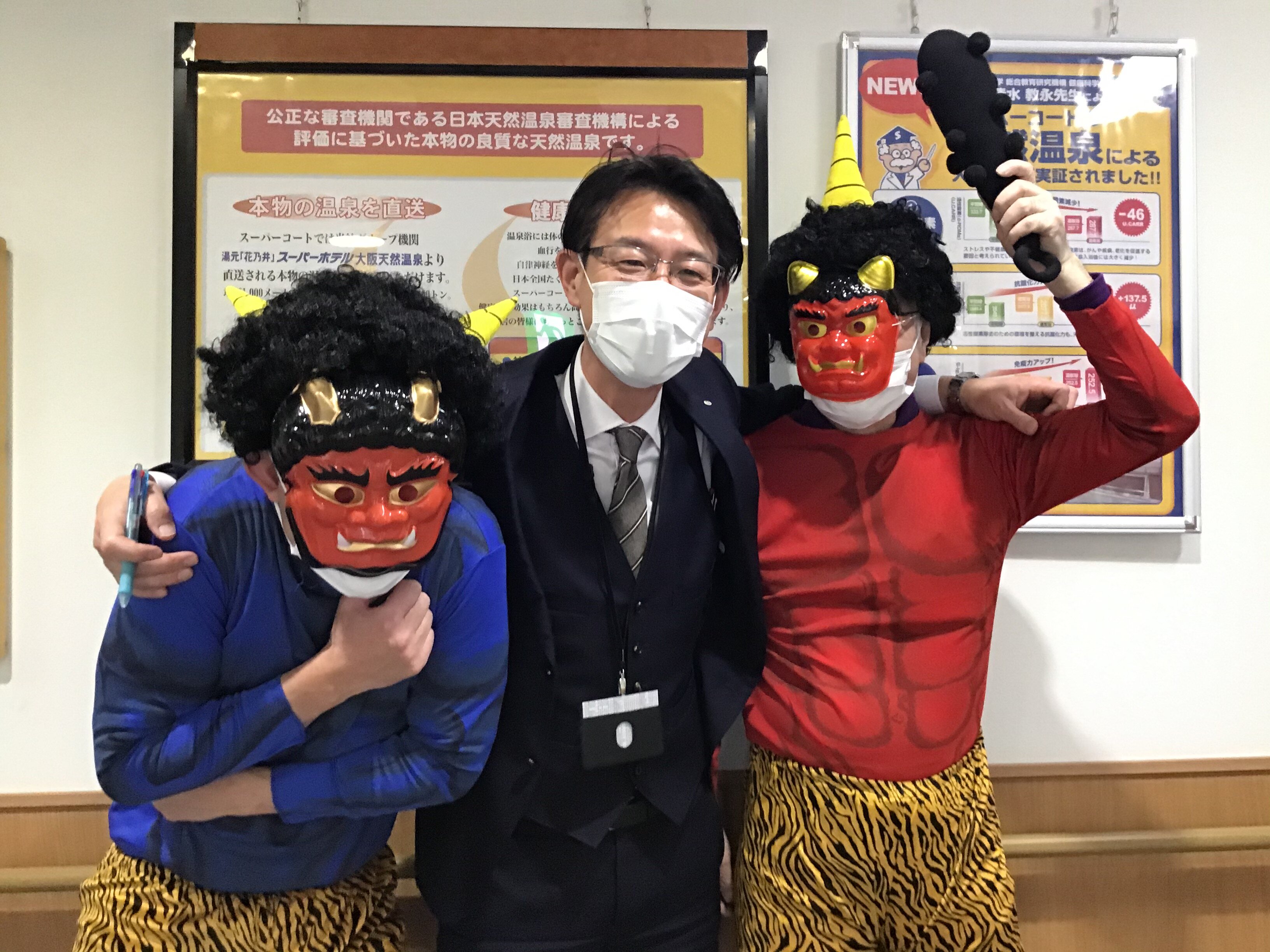 豆まきで反省し改心した青鬼・赤鬼と☆上野谷(うえのや)施設長☆